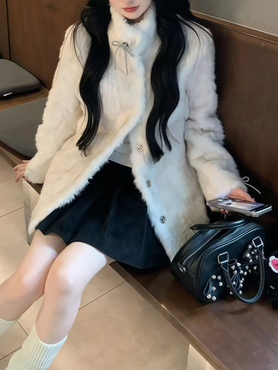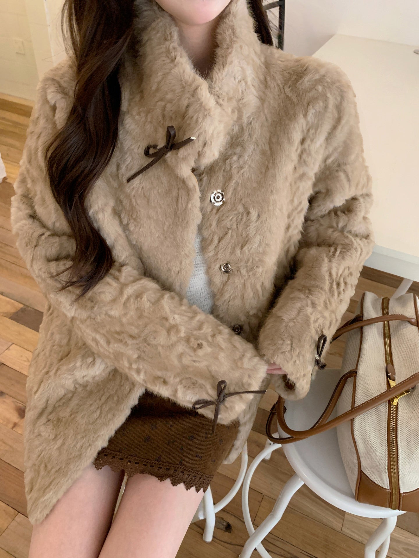 リボン付きファー襟ボアコート TK0367