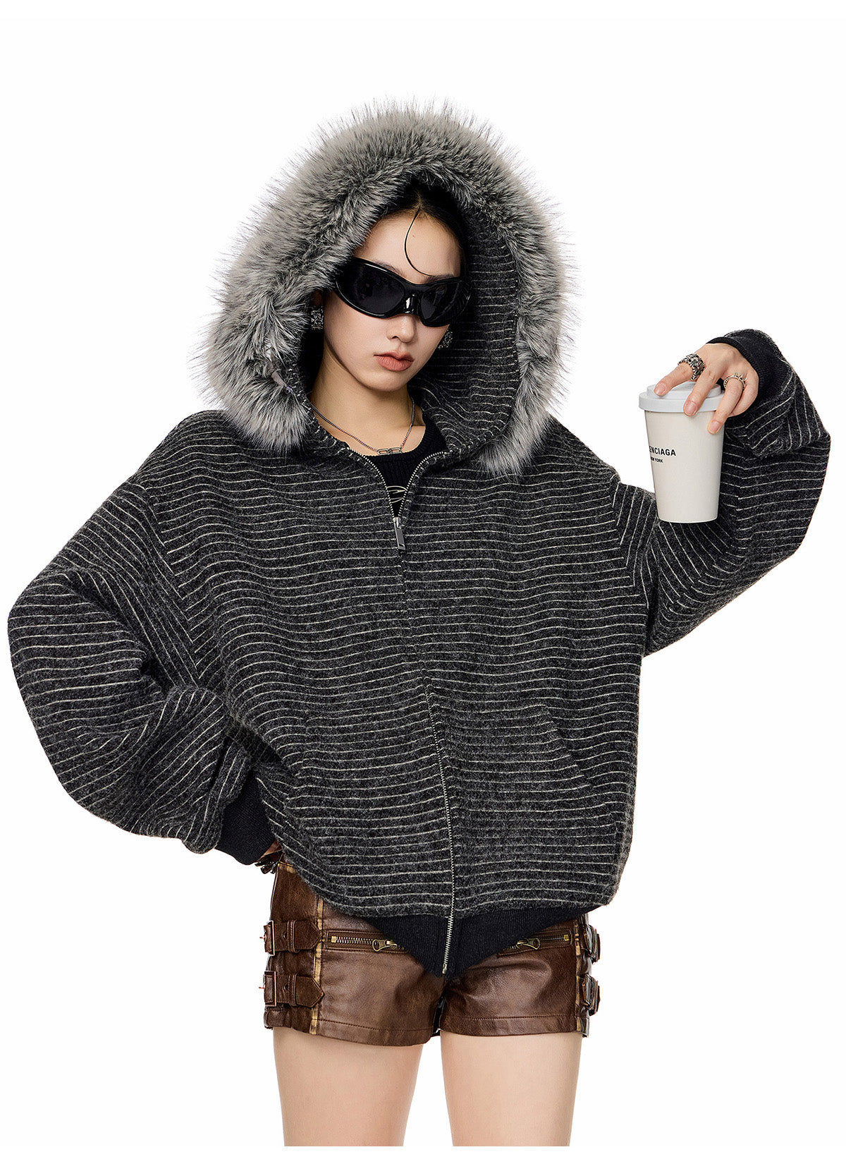 ストライプ柄 ファー付きジップアップパーカー TK0319