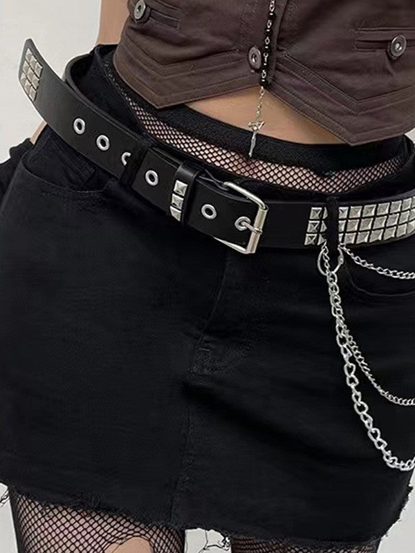 「デニムコーデの必須アクセ」ブラックダブルホールチェーン付きレザーベルトSP0034