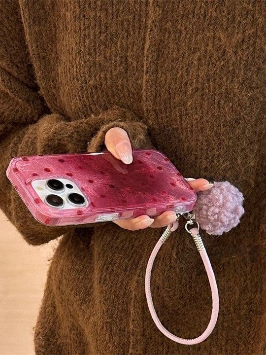 商品説明:汚れが目立ちにくいカラーに、可愛いいちごとドットのデザインを組み合わせた個性的なスマホケース。持つだけで気分が上がる一品です。※ストラップは付属しておりません。