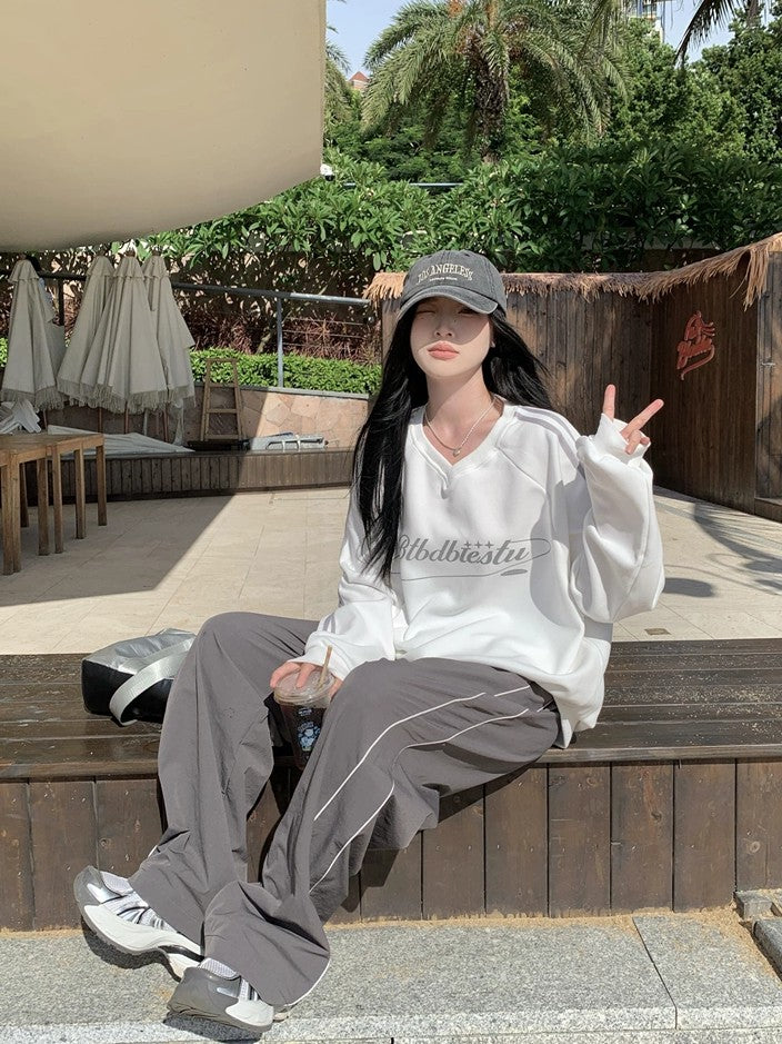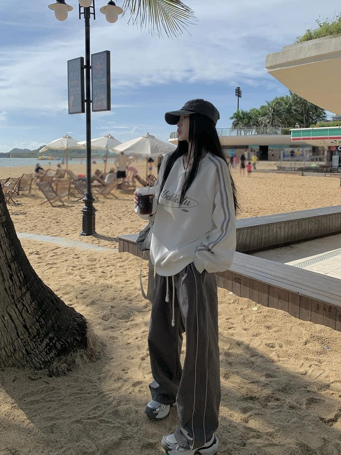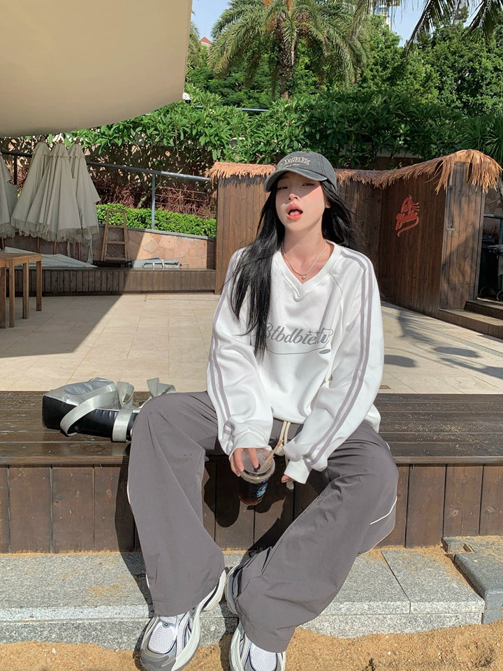 商品説明:春秋にぴったりな薄手のVネックスウェット。ヴィンテージ感のあるストライプデザインとゆったりシルエットで、男女問わず着こなせるユニセックスアイテム。カジュアルでこなれた雰囲気を演出します。