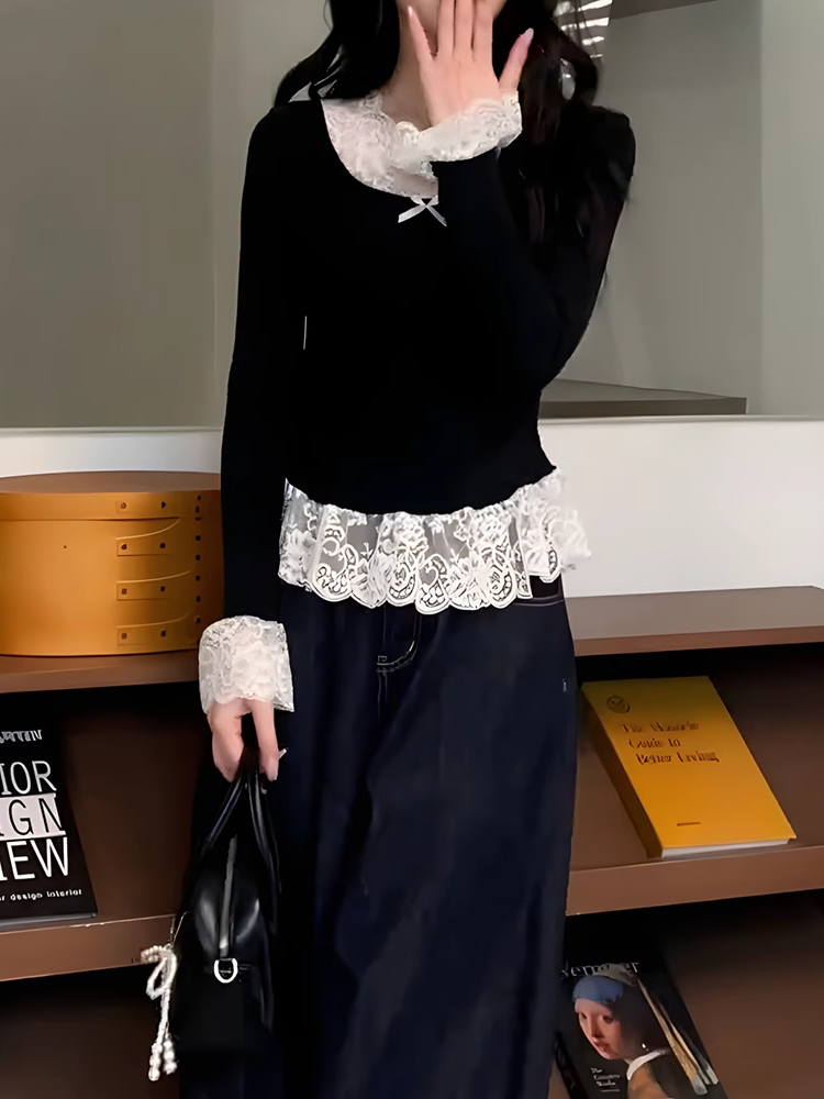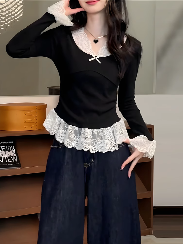 商品説明:ガーリーな魅力たっぷりの長袖ニットトップス。リボンとレースの組み合わせが甘くフェミニンな印象を演出。春秋の季節にぴったりで、一枚で着てもインナーとしても使いやすい万能アイテムです。