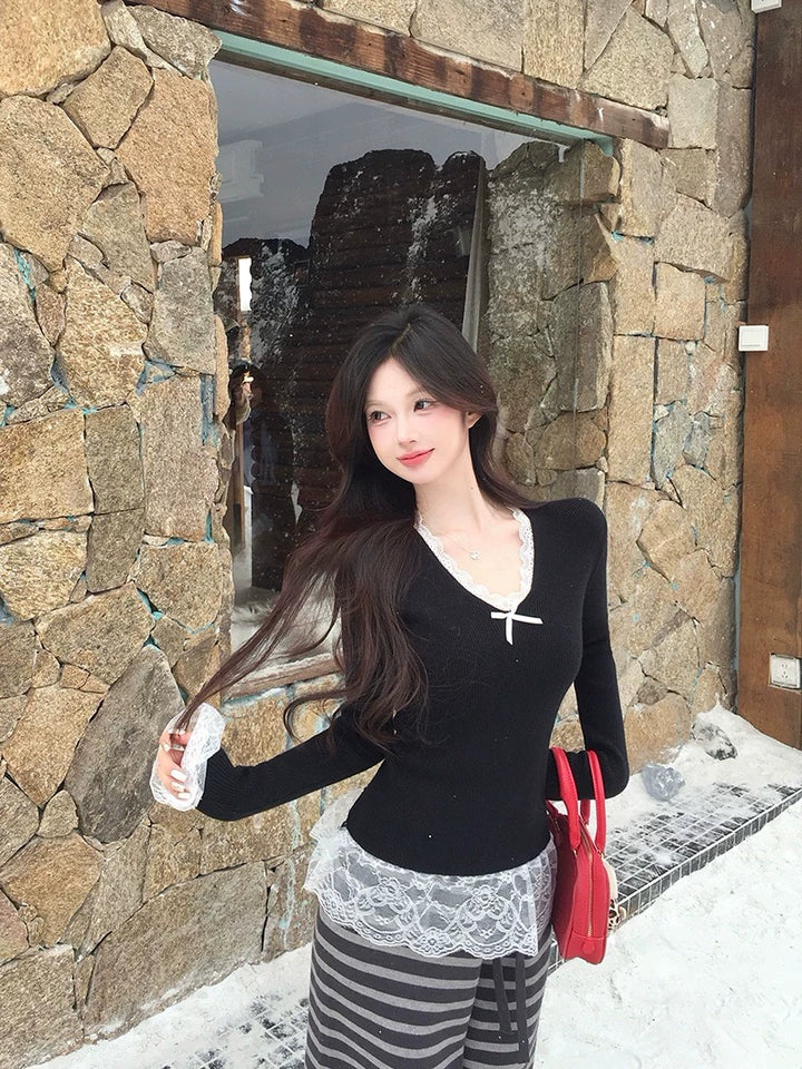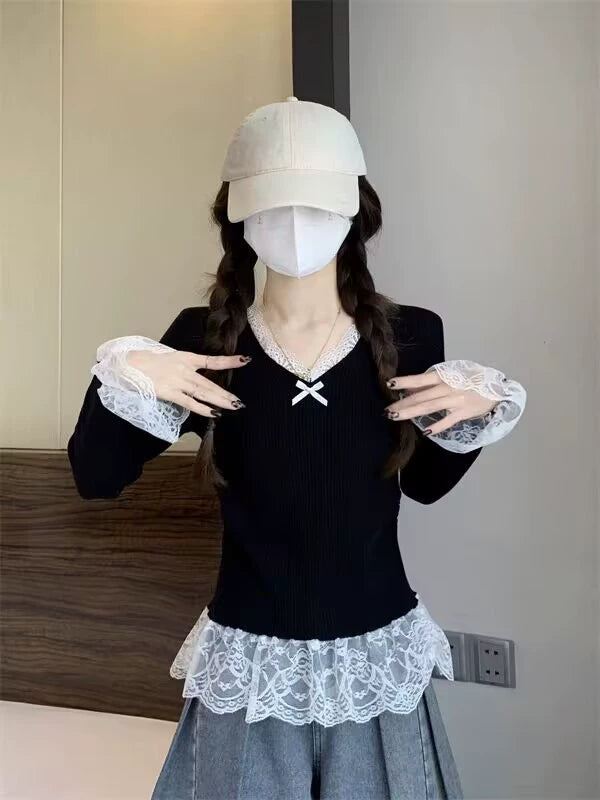 ガーリー系リボンレース長袖ニット TK0260