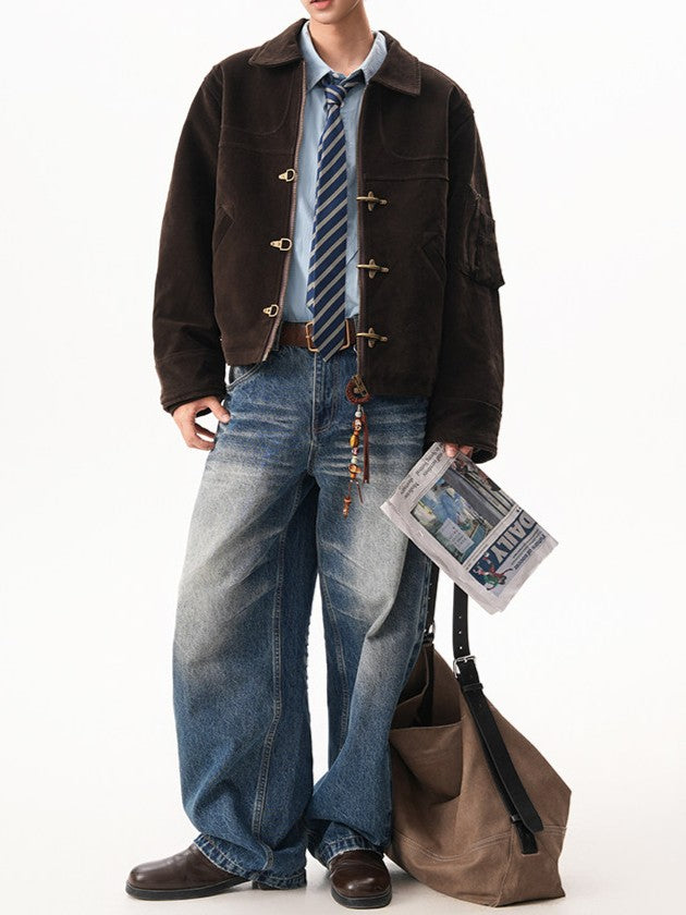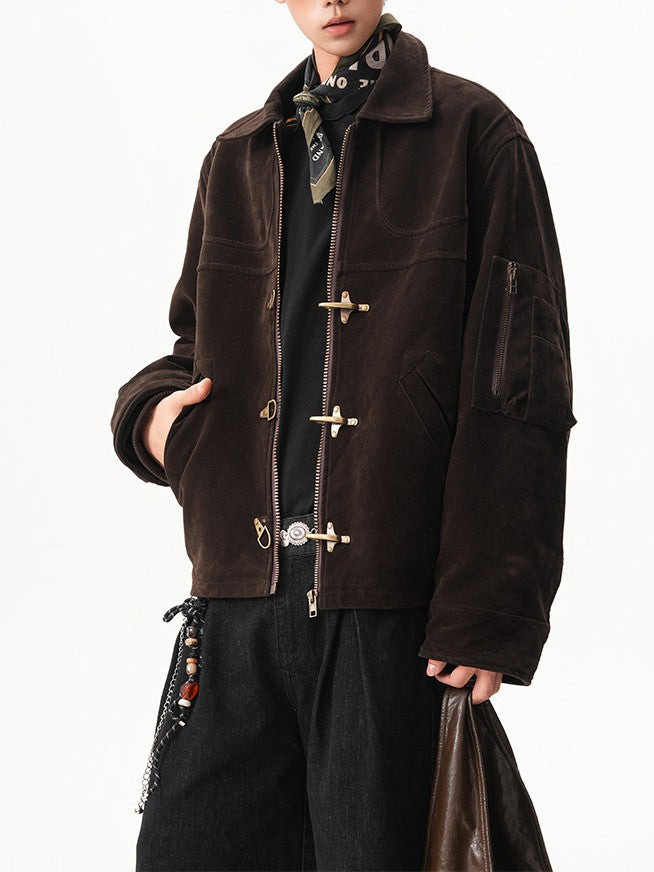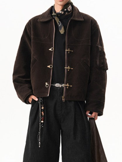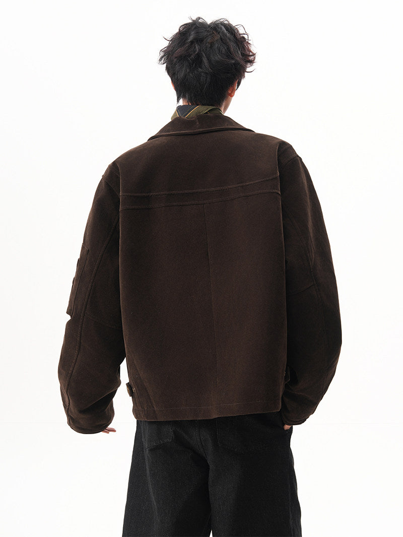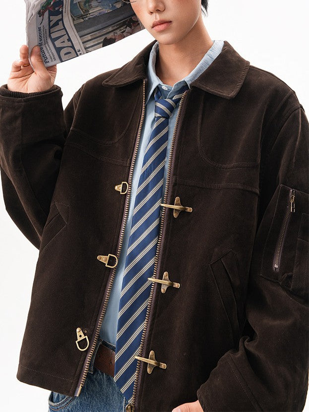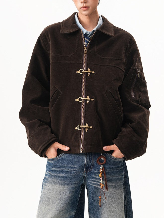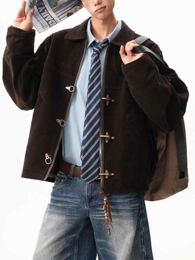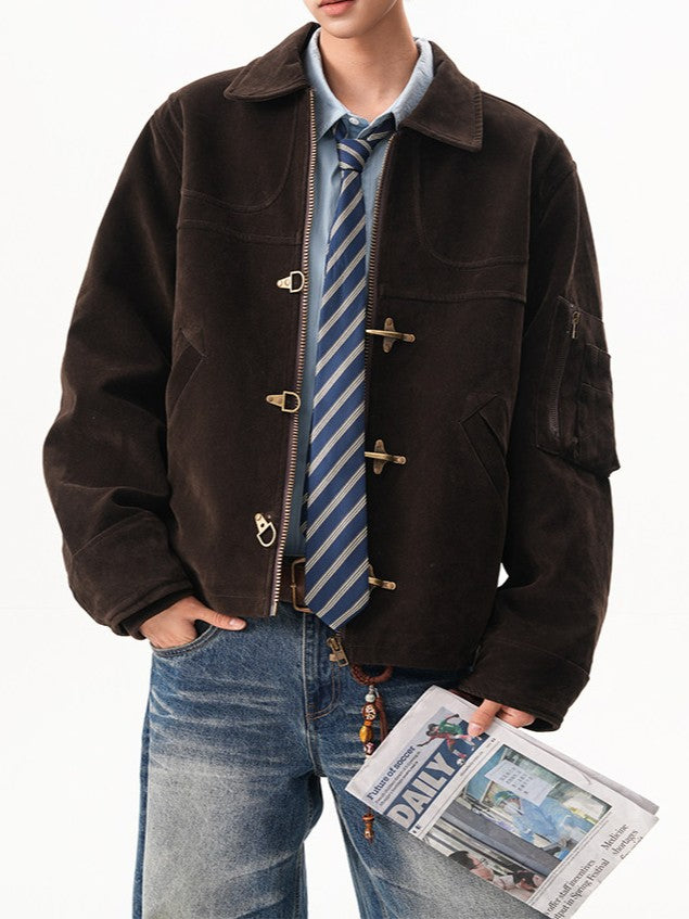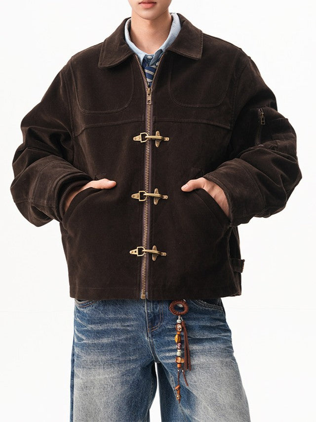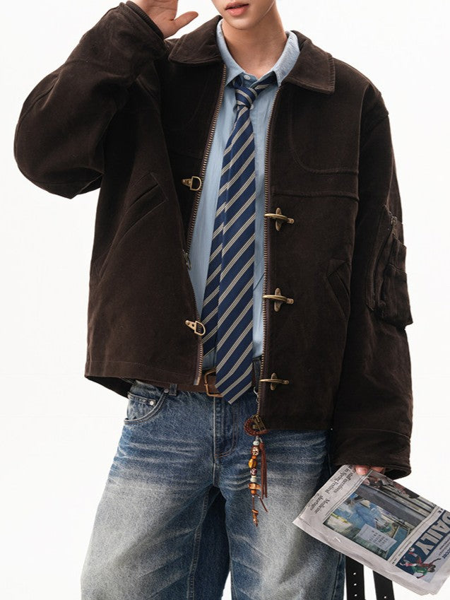 商品説明:レトロ感のあるスエードジャケット。飛行機バックル付きのショート丈デザインで、カジュアルに着用できます。男女兼用・ルーズフィット。