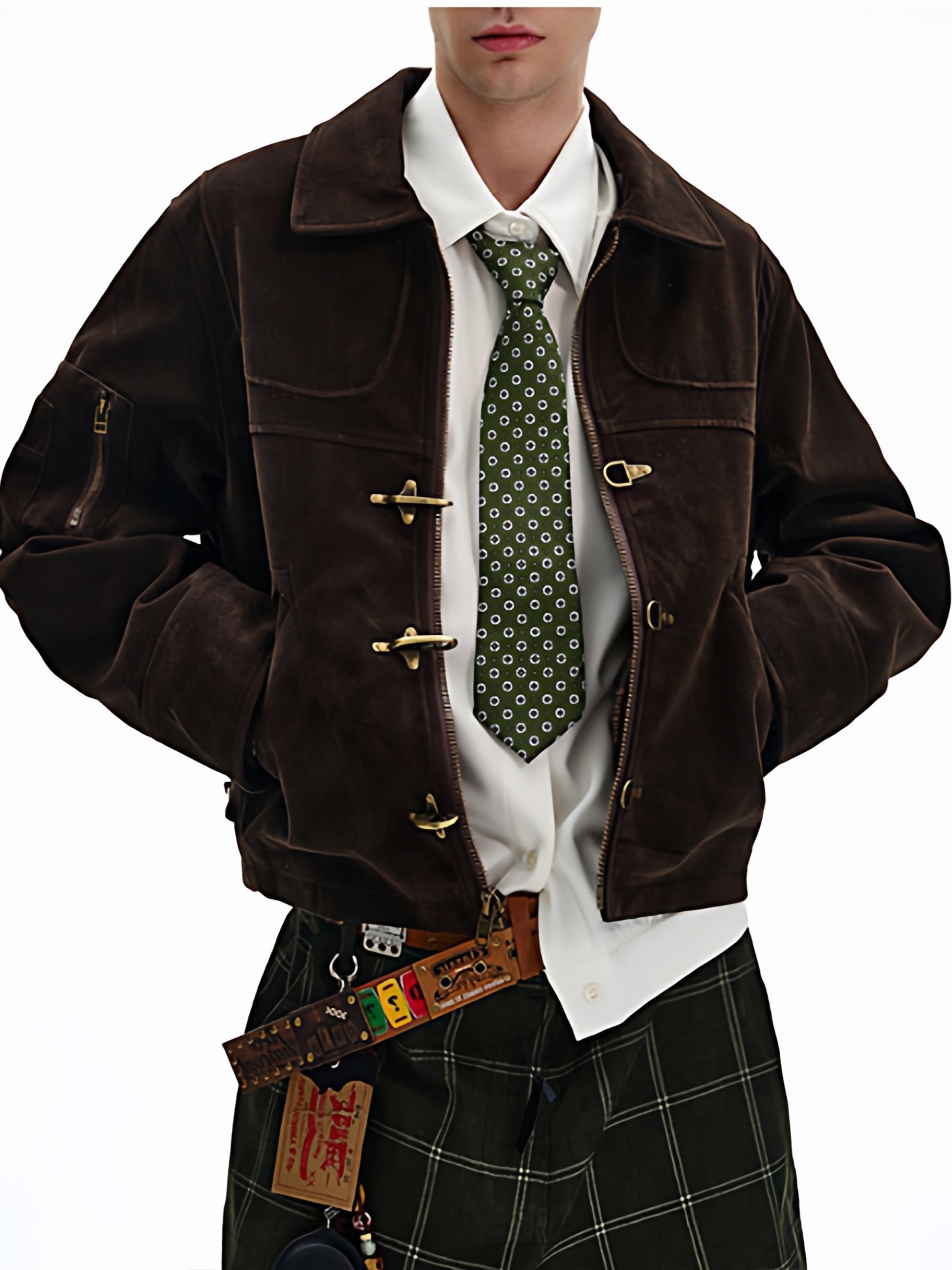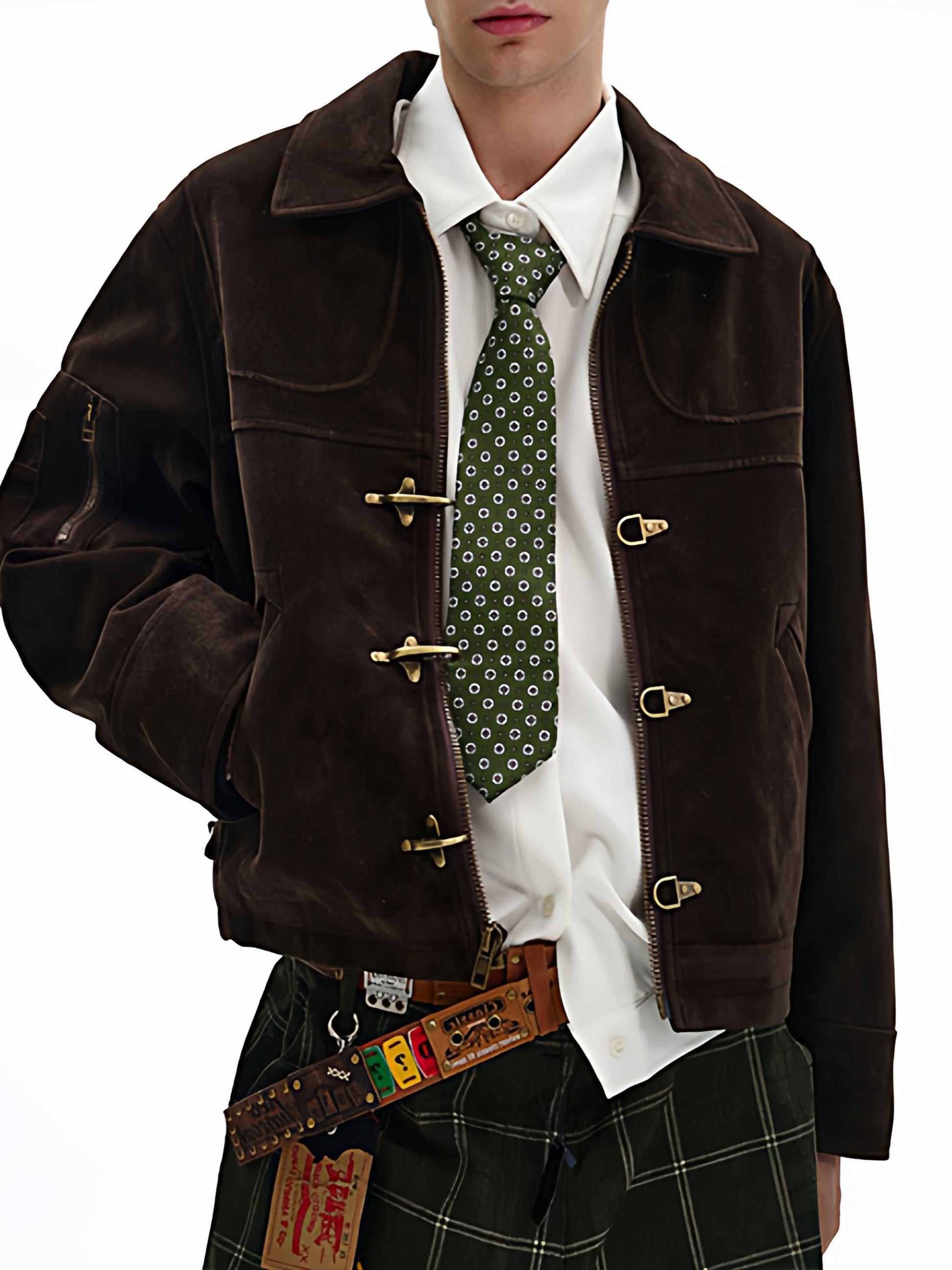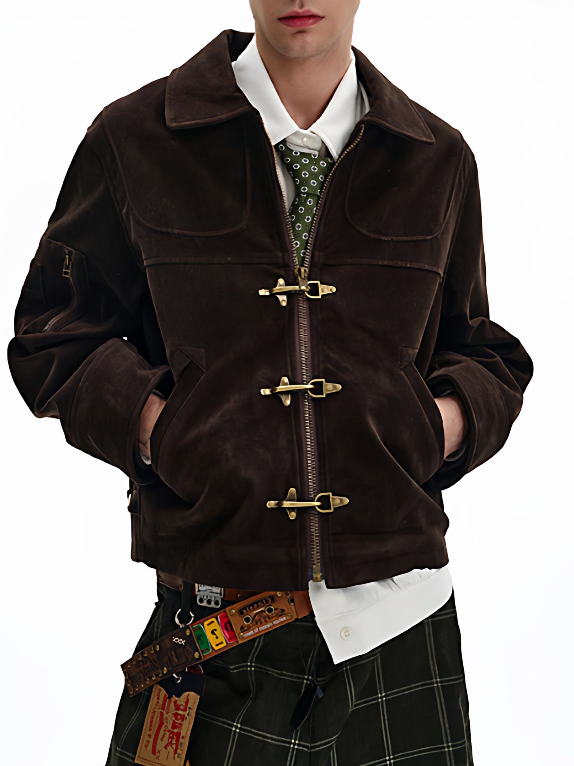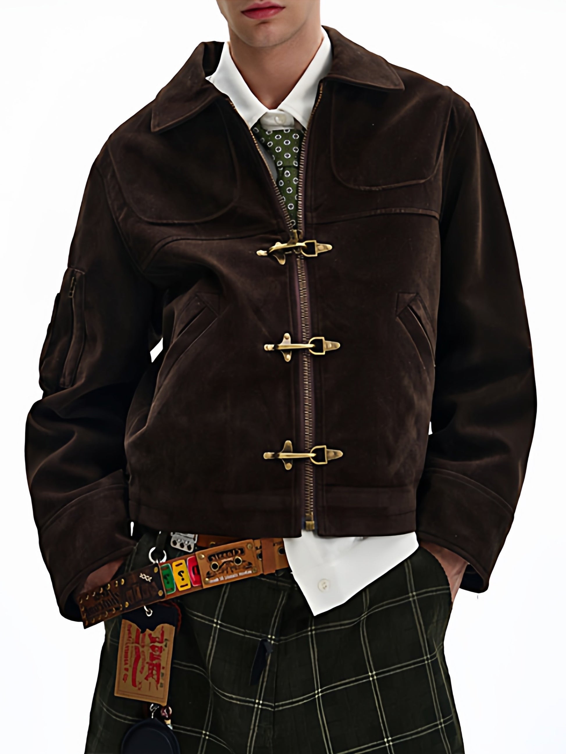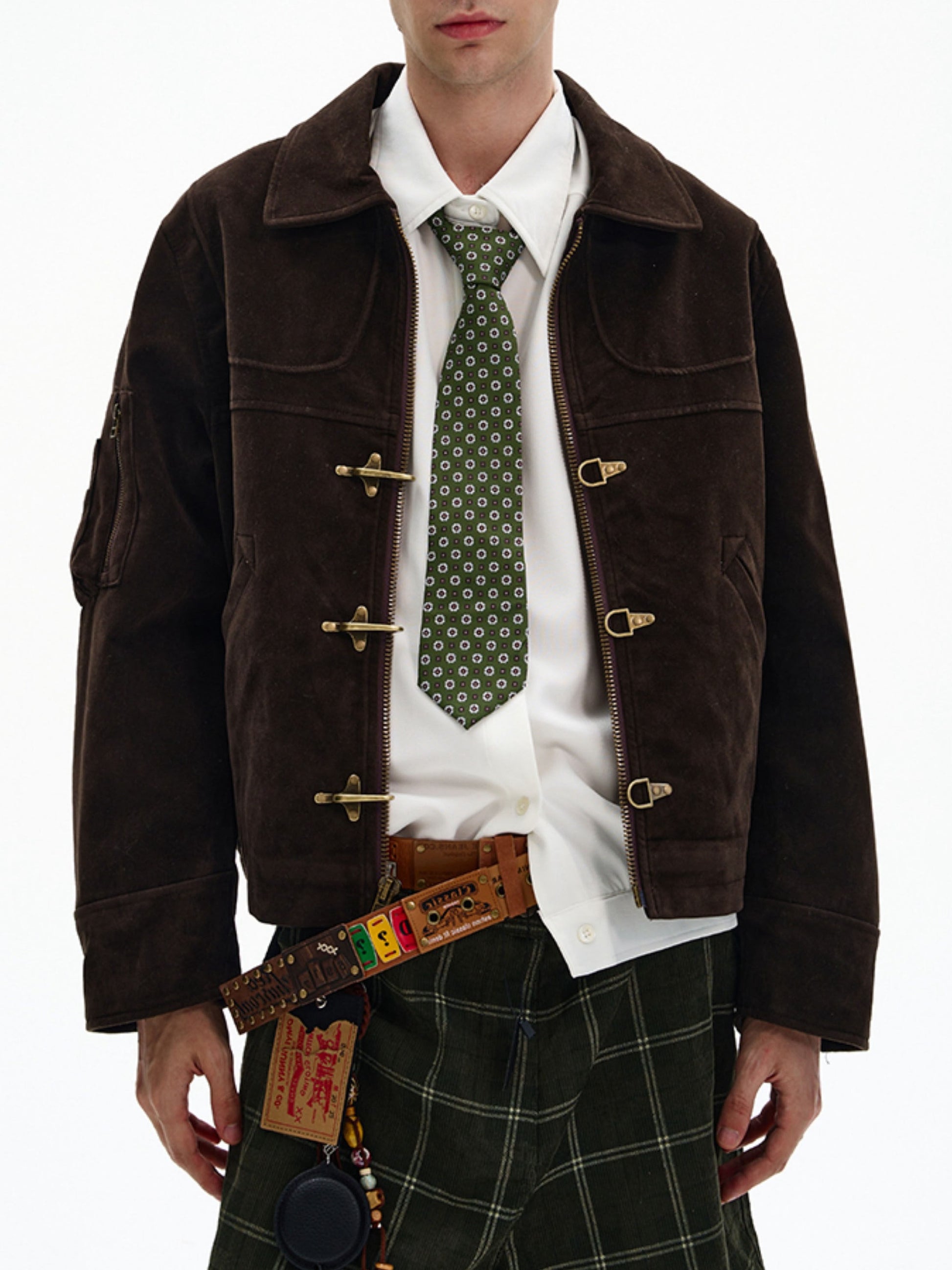 商品説明:レトロ感のあるスエードジャケット。飛行機バックル付きのショート丈デザインで、カジュアルに着用できます。男女兼用・ルーズフィット。