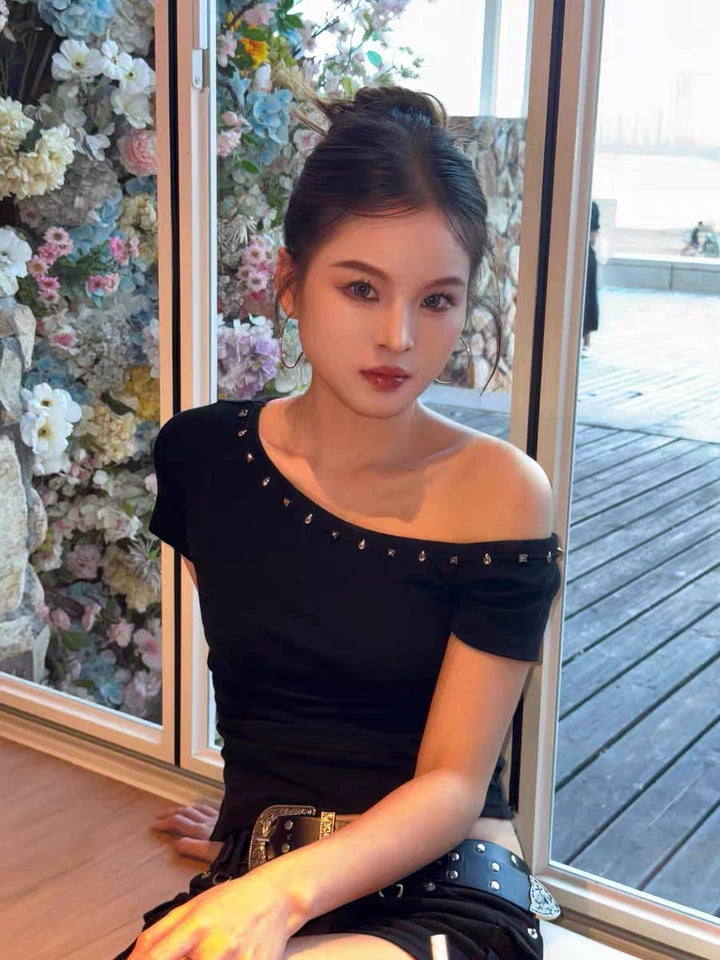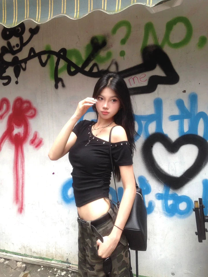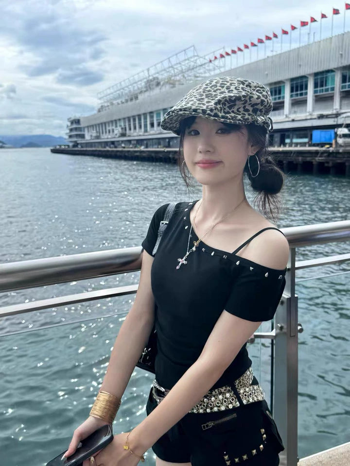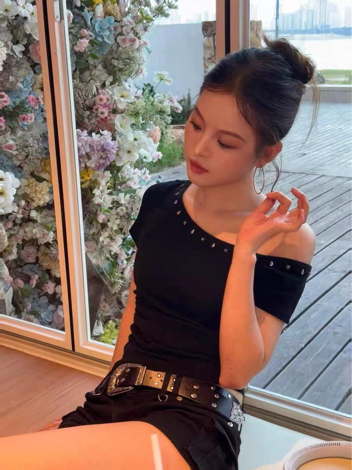 商品説明:アメリカンシックなスタッズデザインが特徴的なスラッシュショルダーTシャツ。夏にぴったりな黒のショート丈で、スタイリッシュかつセクシーな印象を与えます。フィット感のあるシルエットで、ボディラインを美しく引き立て、細身効果も抜群。