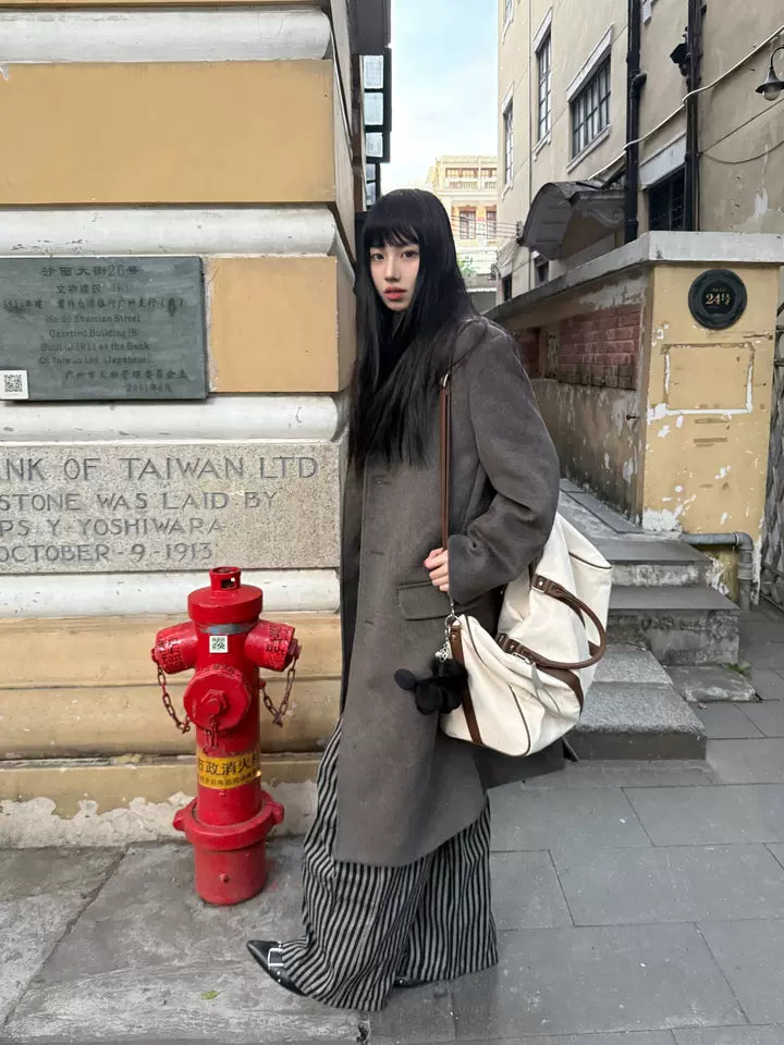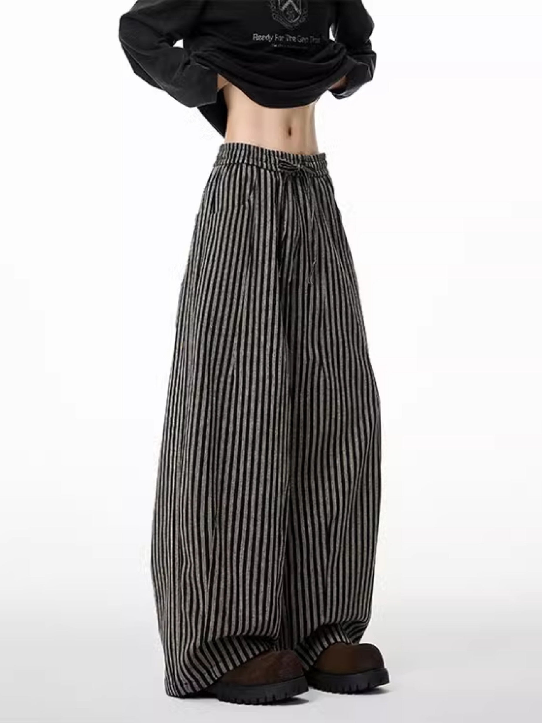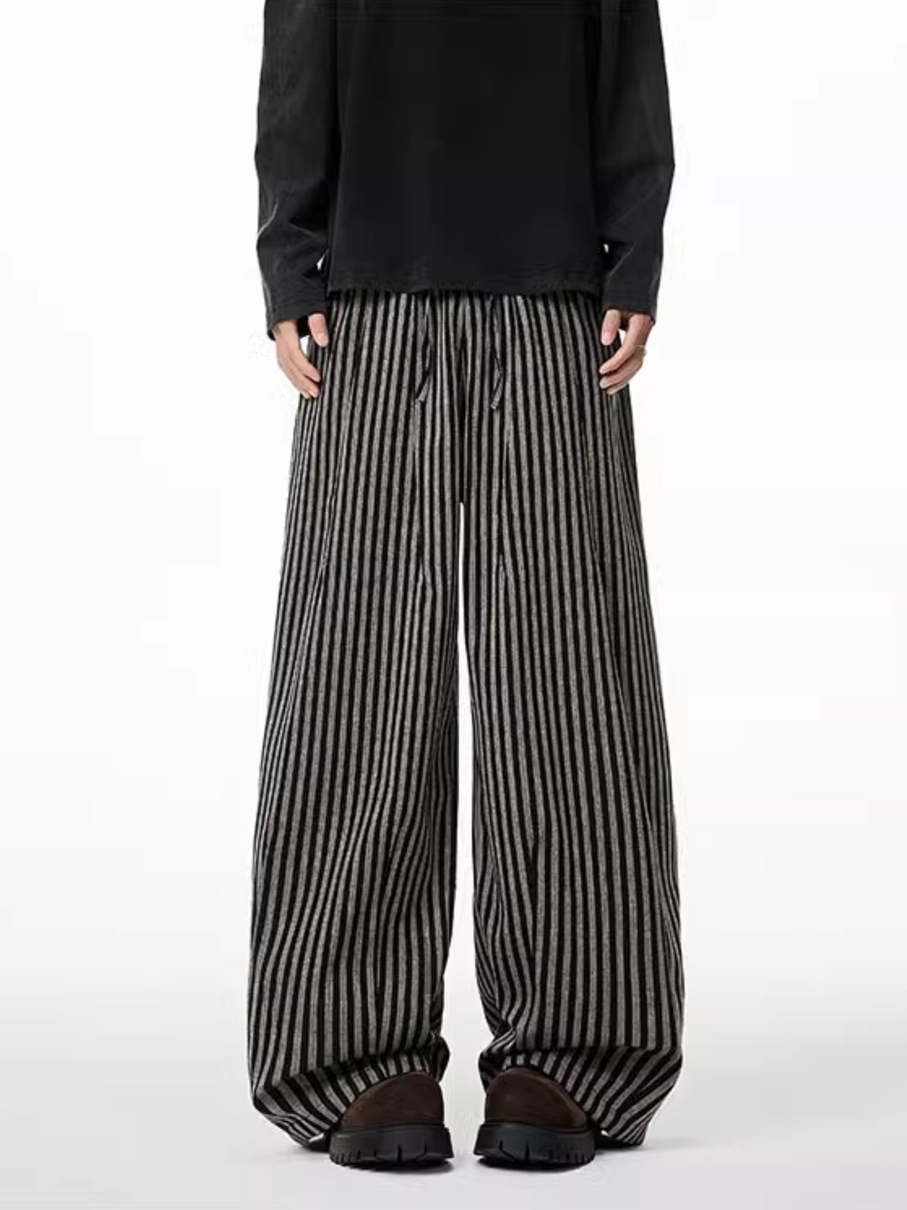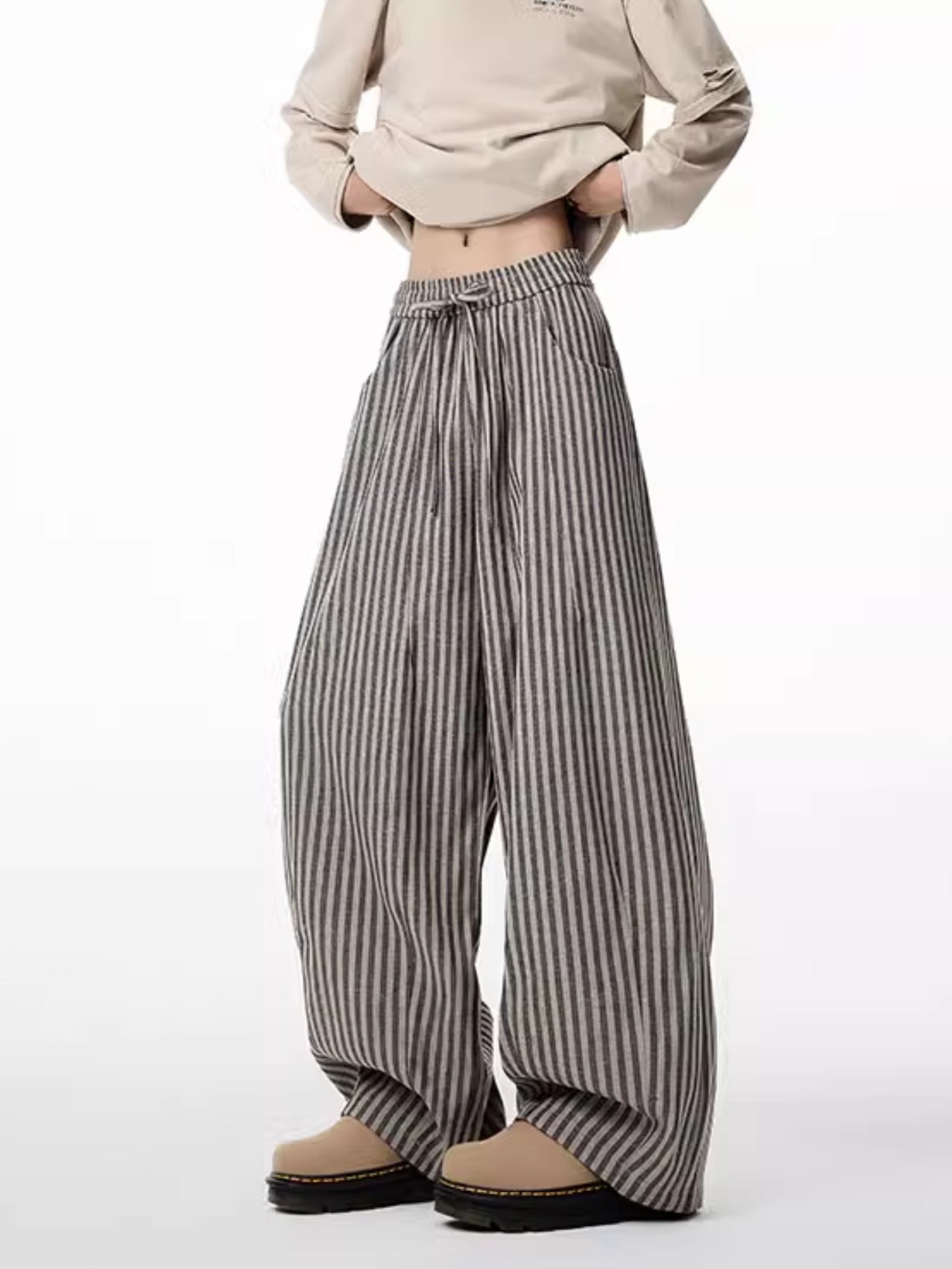 商品説明:レトロ感漂うストライプ柄のワイドパンツ。ゆったりとしたシルエットで男女兼用、リラックス感と抜け感を演出。
