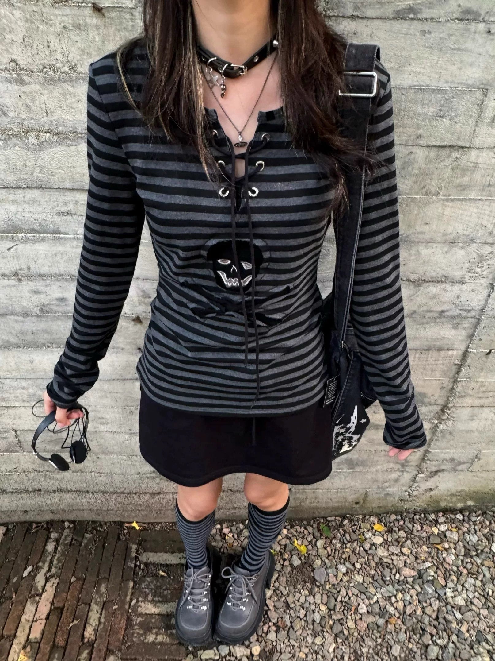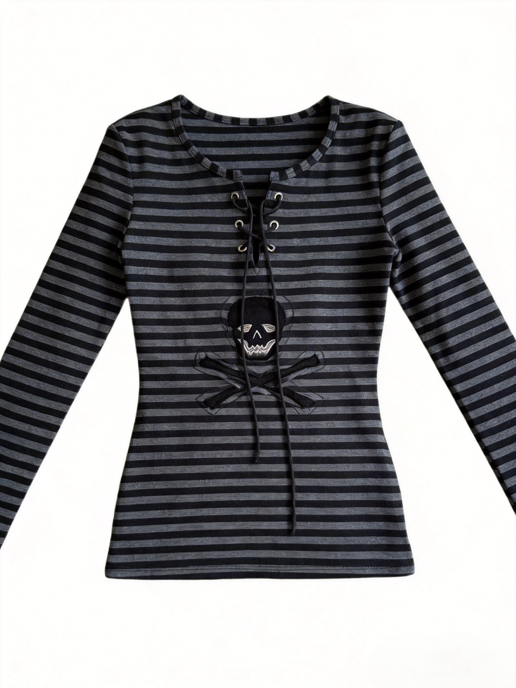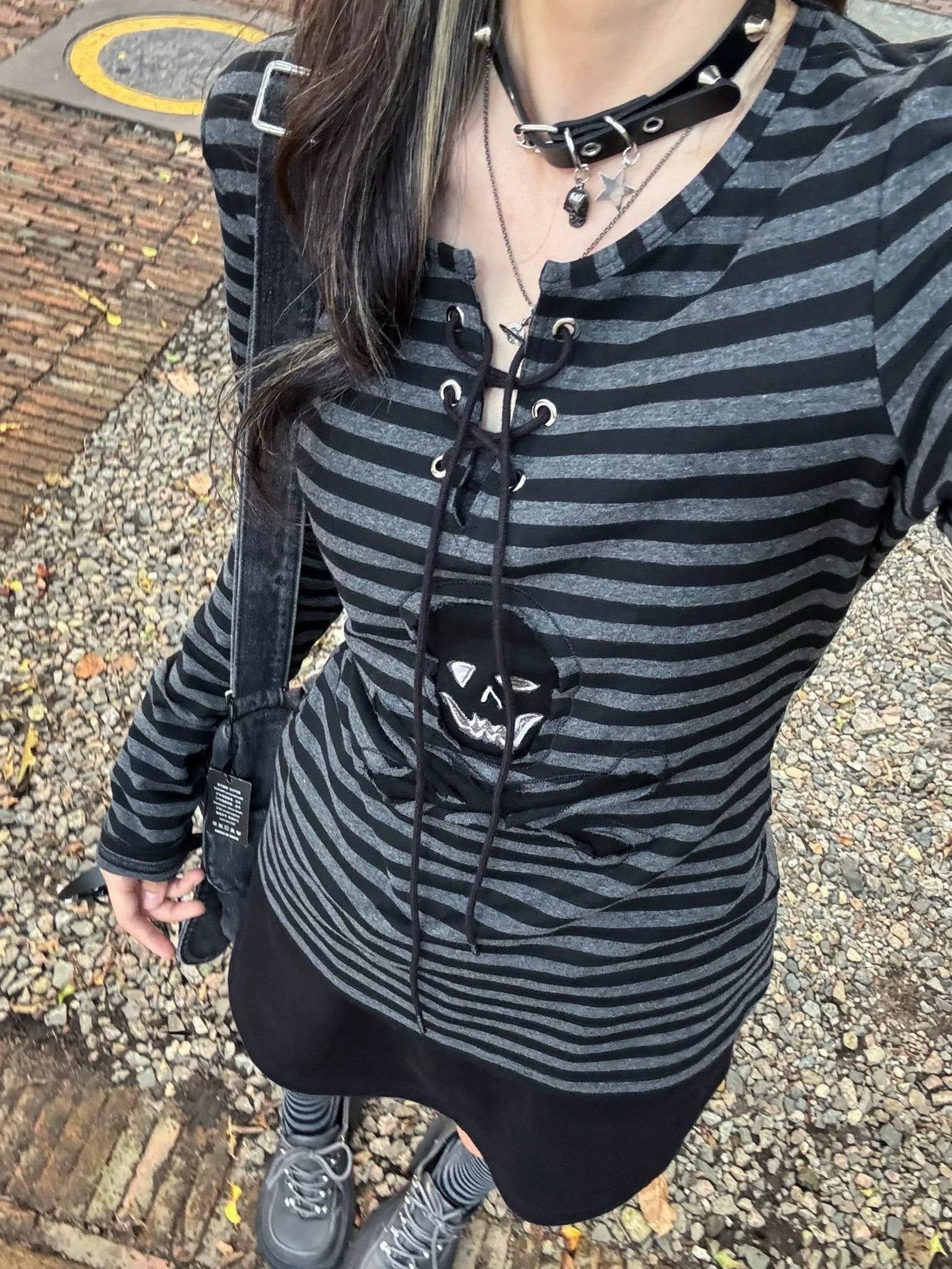 商品説明:ブラック×グレーのストライプが印象的なロングスリーブTシャツ。程よく体にフィットする細身シルエットで、すっきりとしたラインを演出します。