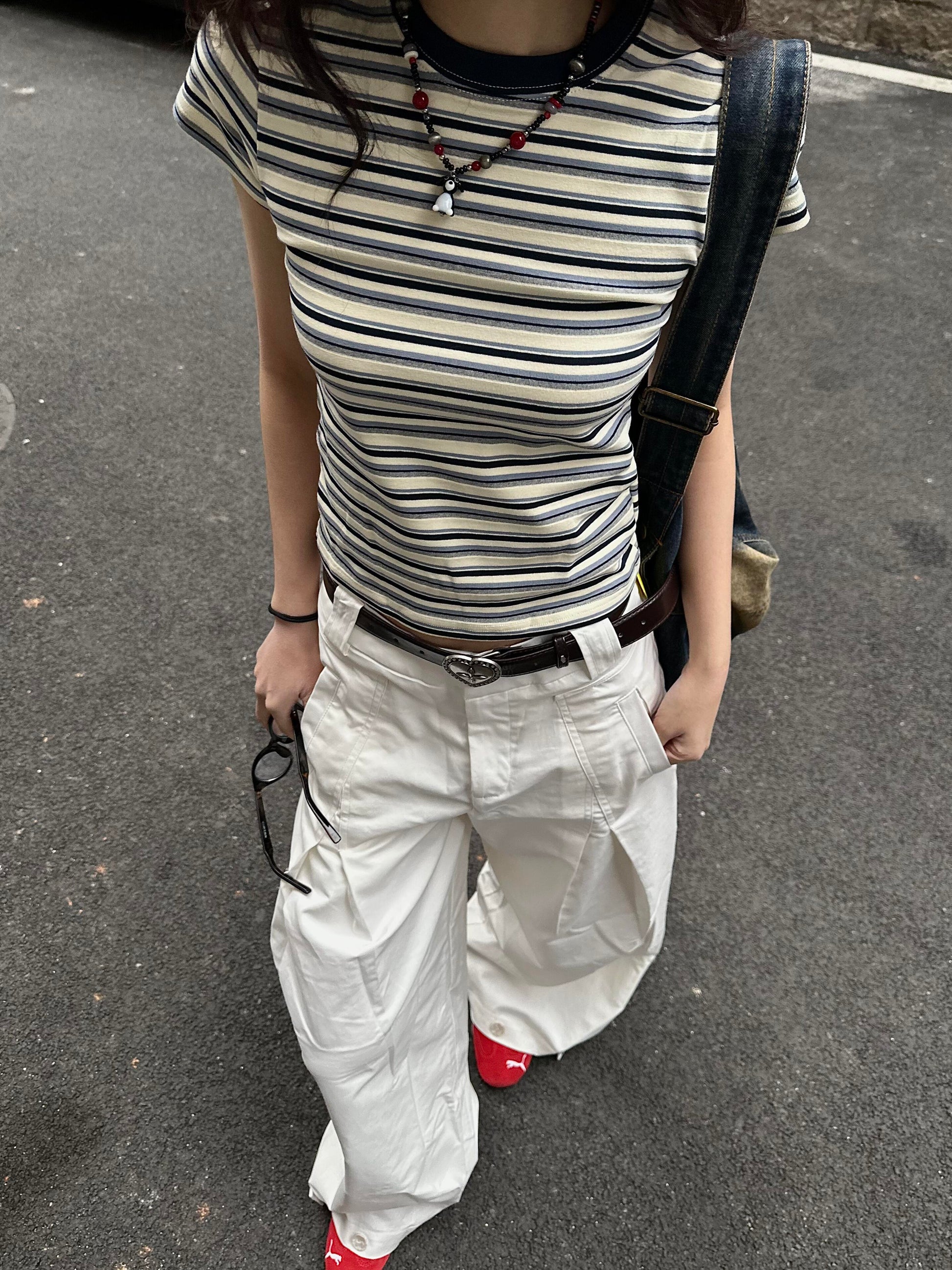 商品説明:レトロ感漂うストライプ配色が目を惹く半袖Tシャツ。コンパクトなシルエットと正肩デザインで、女性らしいバランスを演出。周りと差がつく小洒落た夏の主役トップスです。
