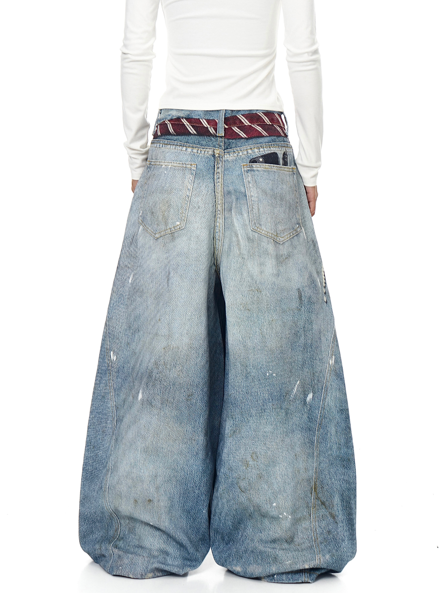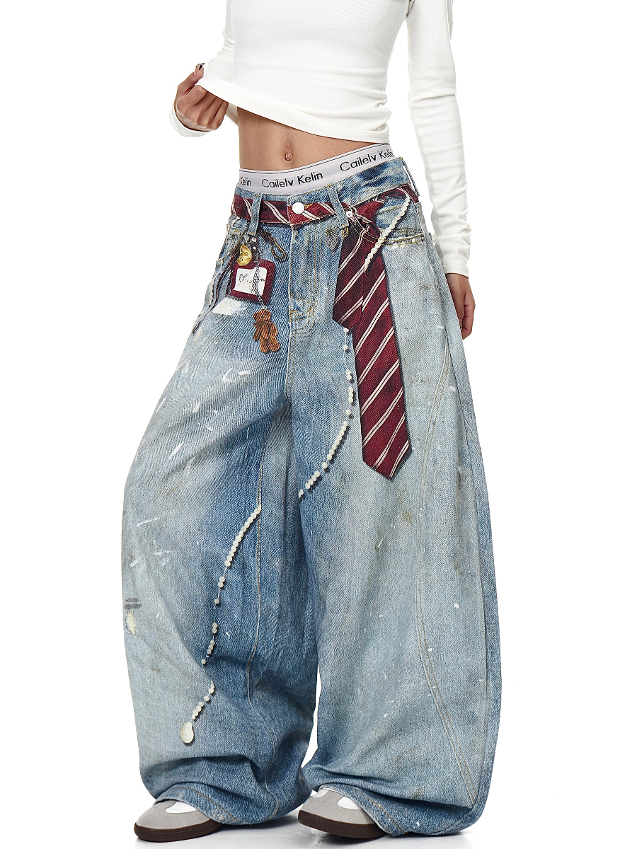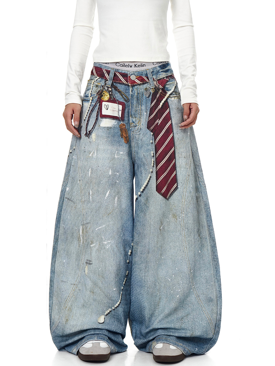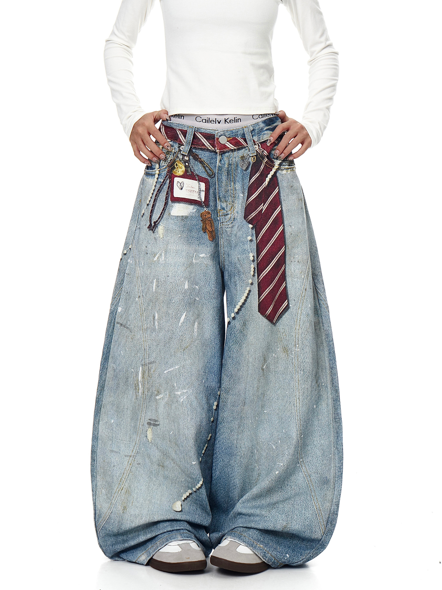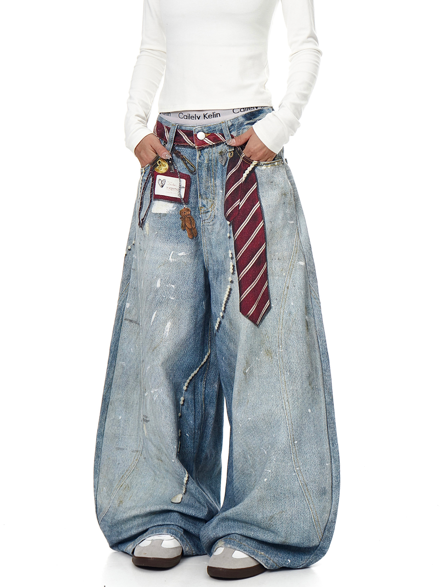 商品説明:存在感のあるプリントを施したヴィンテージライクなデニムパンツ。ルーズなシルエットと裾まで広がるワイドデザインで、ストリート感たっぷりに着こなせます。古着風の加工がコーデにこなれ感をプラス。Tシャツやスウェットと合わせて休日のお出かけやタウンユースにぴったりです。