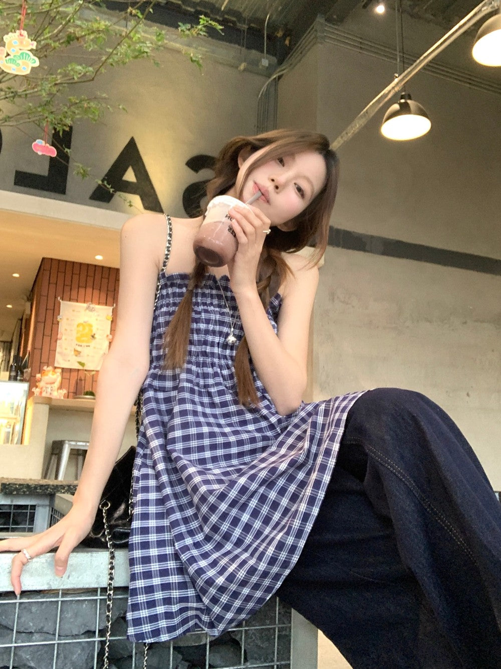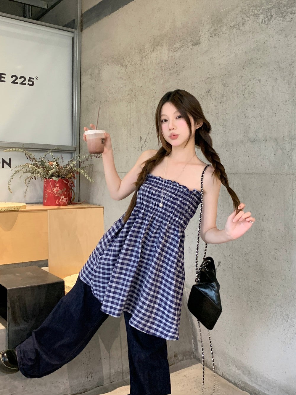 商品説明:チューブトップとスカートの2WAY仕様。清涼感あるブルーチェックが夏にぴったり。ウエストはシェイプされ、Aラインでスタイル良く見せる甘辛デザイン。コーデ自在の洒落アイテムです。