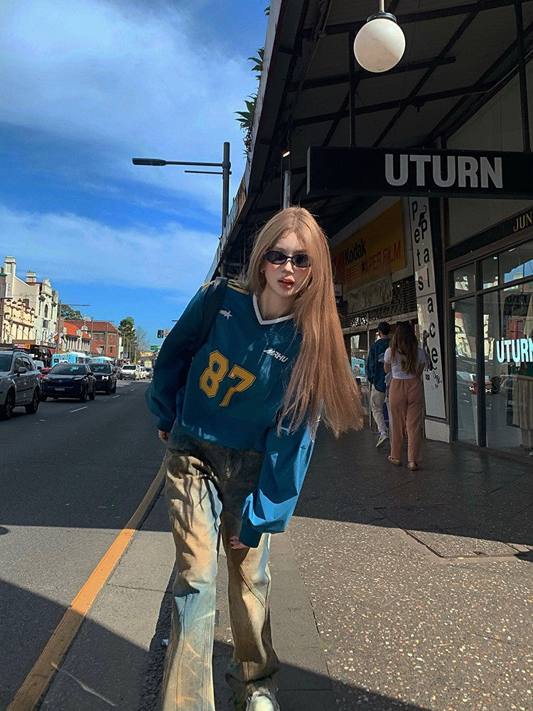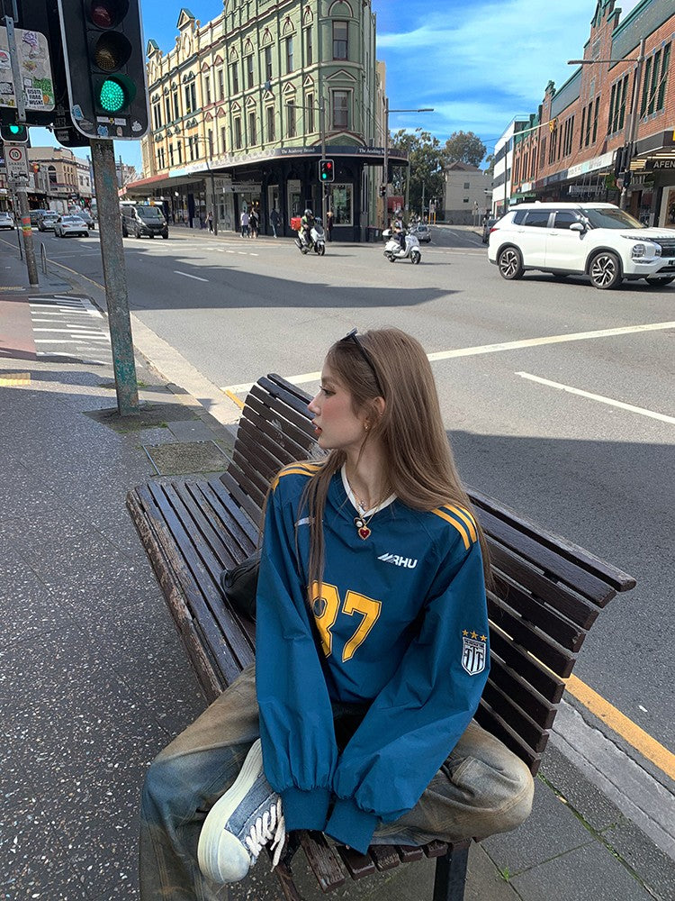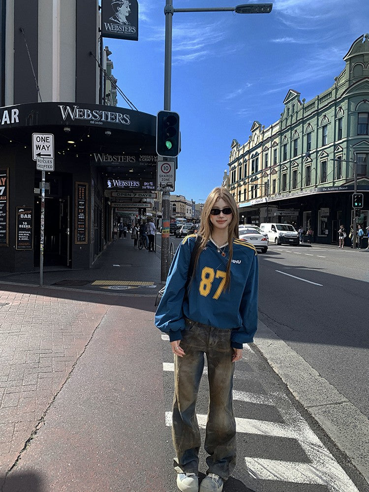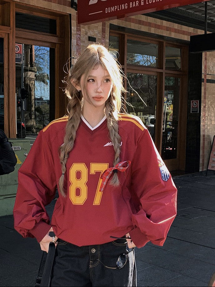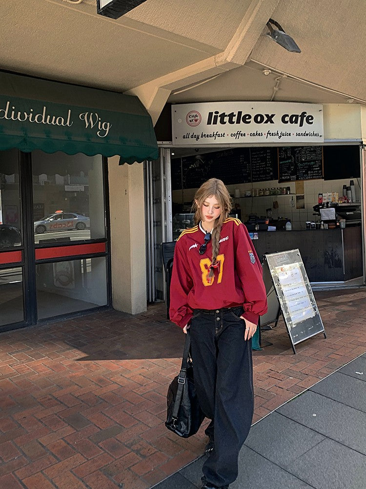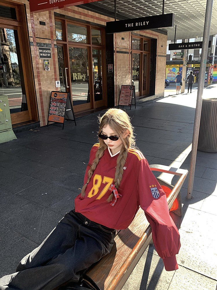 商品説明:バイカラーのVネックが目を惹くレトロロゴスウェット。首元をすっきり見せ、肩から首のラインをきれいに整えてくれます。オーバーサイズで体型カバー力もあり、リラックス感たっぷり。デニムやスカートと合わせてカジュアルにもストリート風にも◎ 秋のデイリーコーデに活躍します。素材はポリエステル100%。