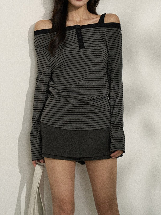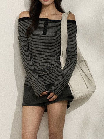 商品説明:バイカラーのストライプが目を引くオフショルロンT。
