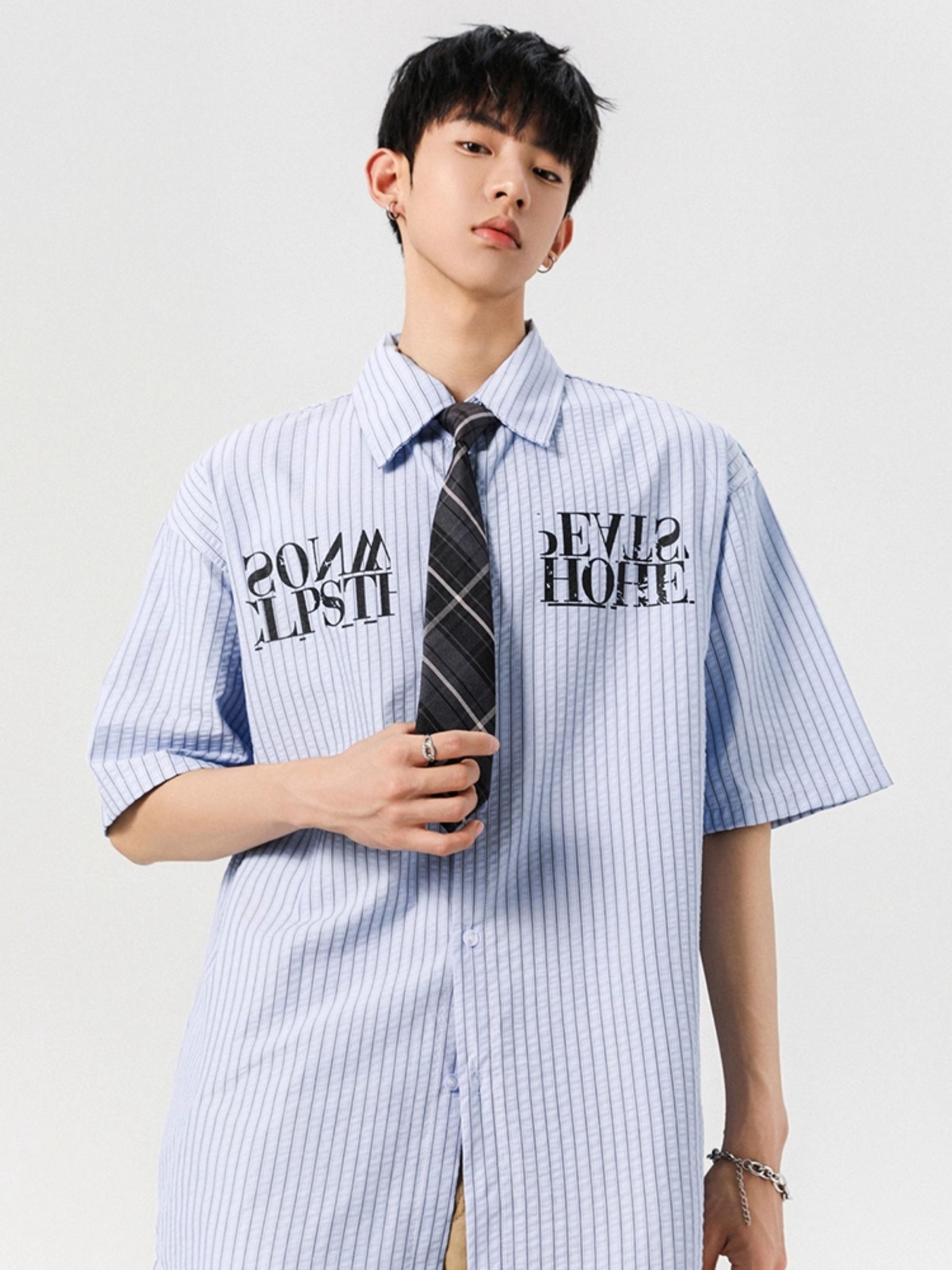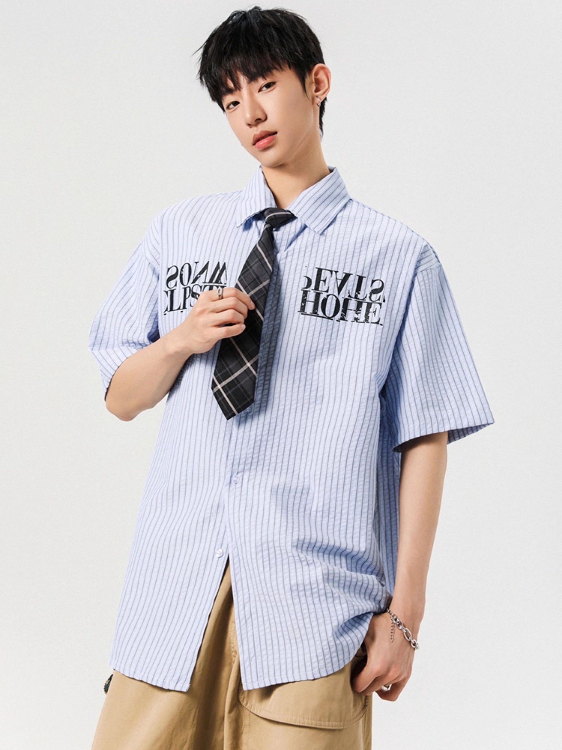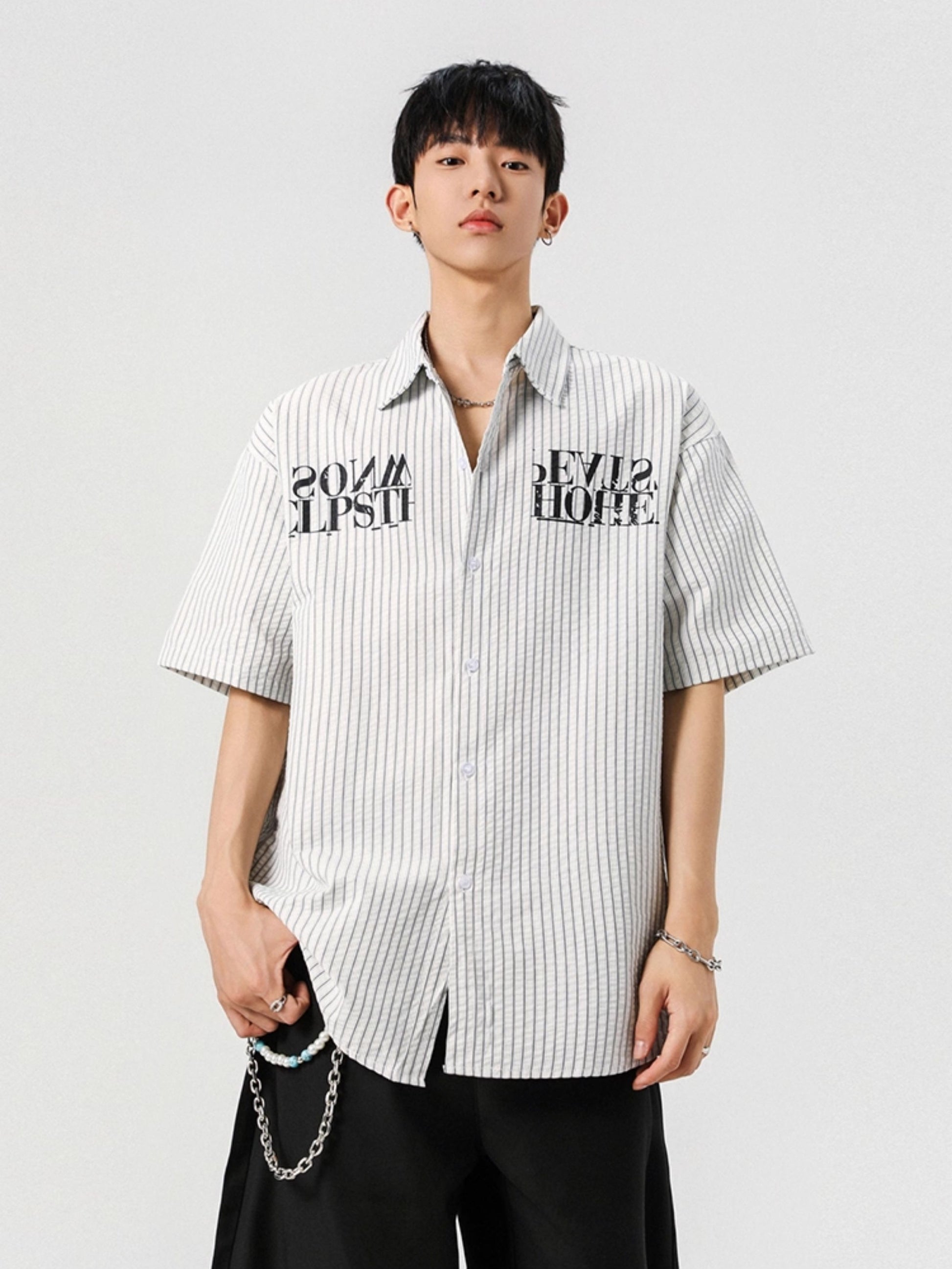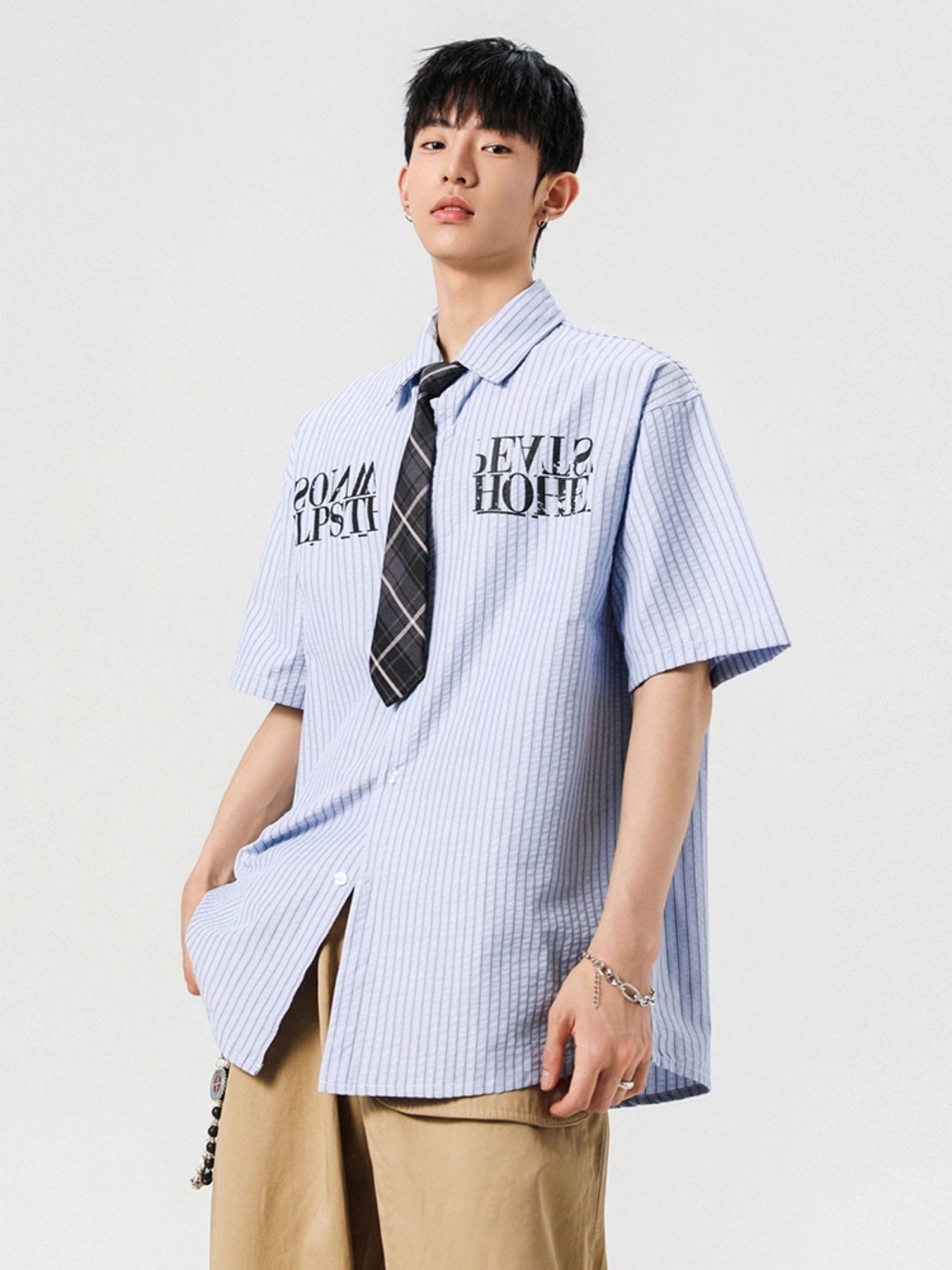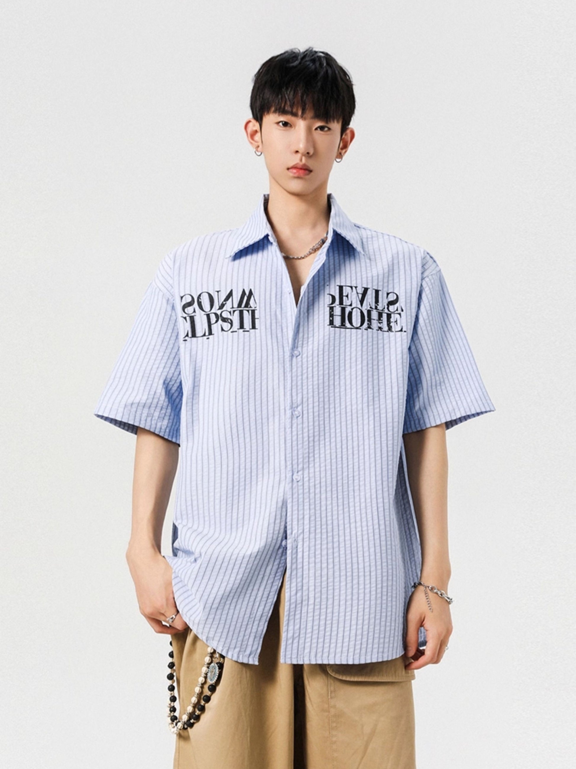 商品説明:柔らかいパフコットン素材を使用したストライプ柄の半袖シャツ。男女兼用で、ゆったりとしたシルエットが魅力。背面にはトレンド感のあるロゴプリント入りで、アメカジやカレッジ風のコーデにぴったりな一枚です。