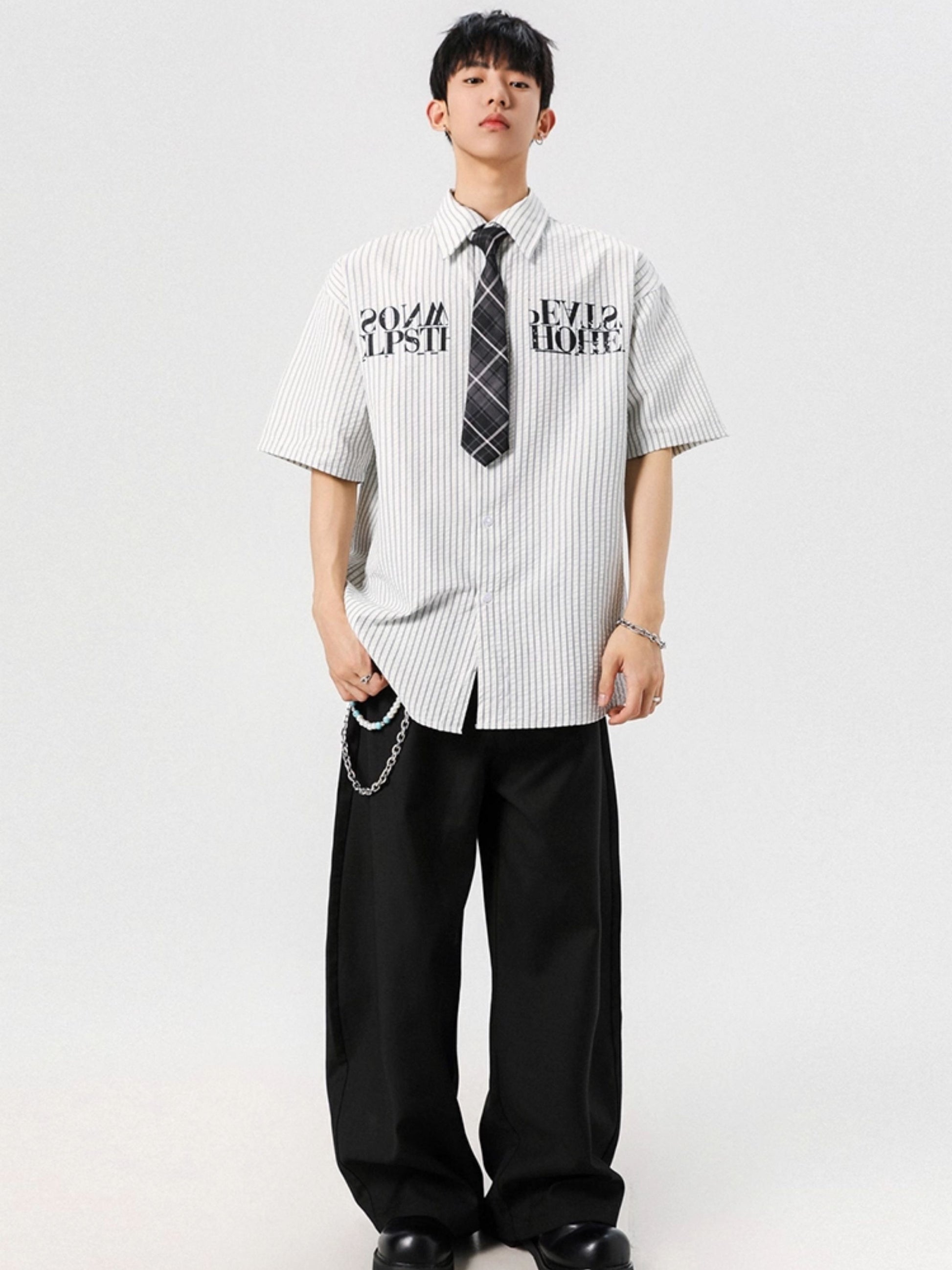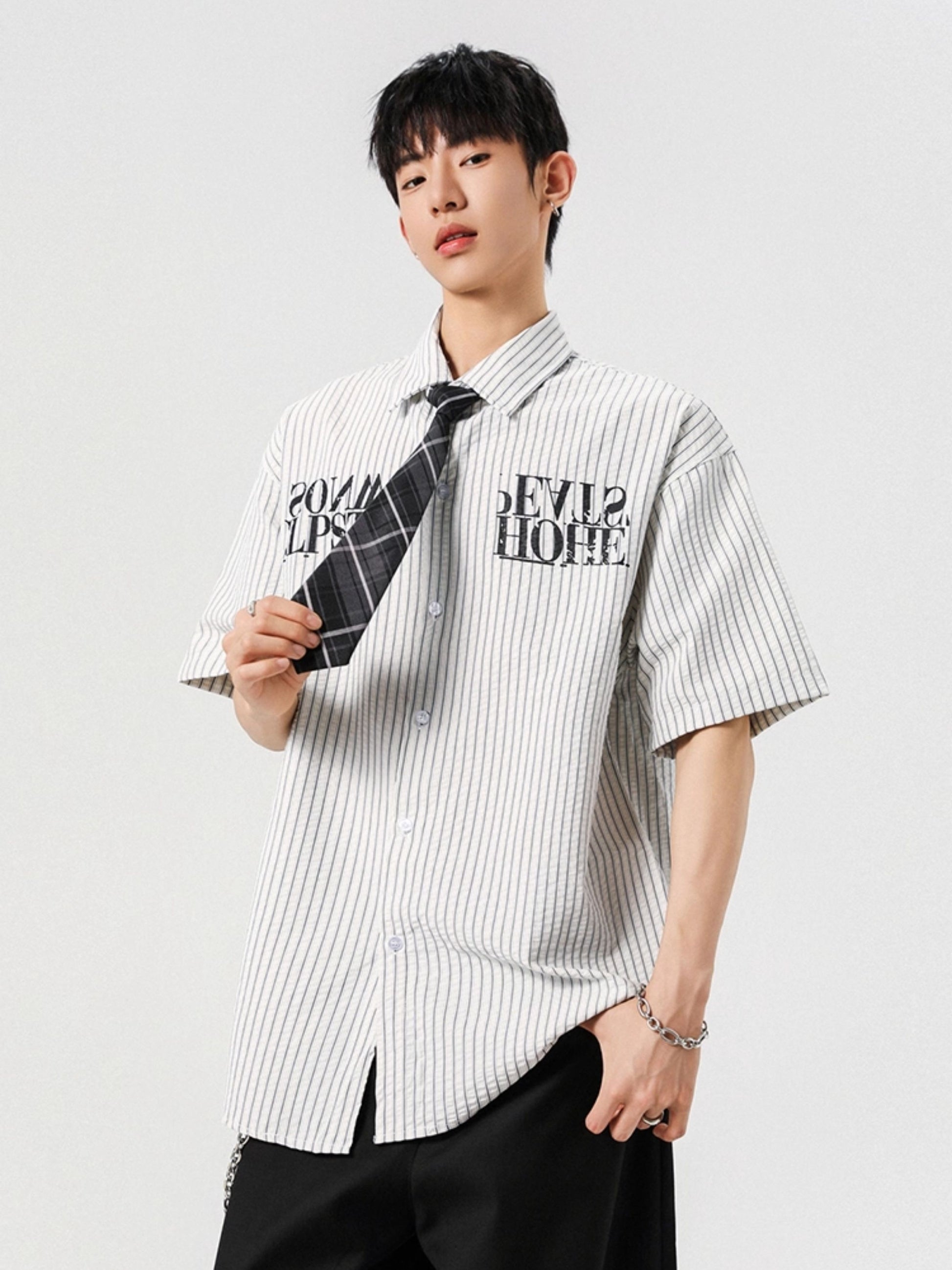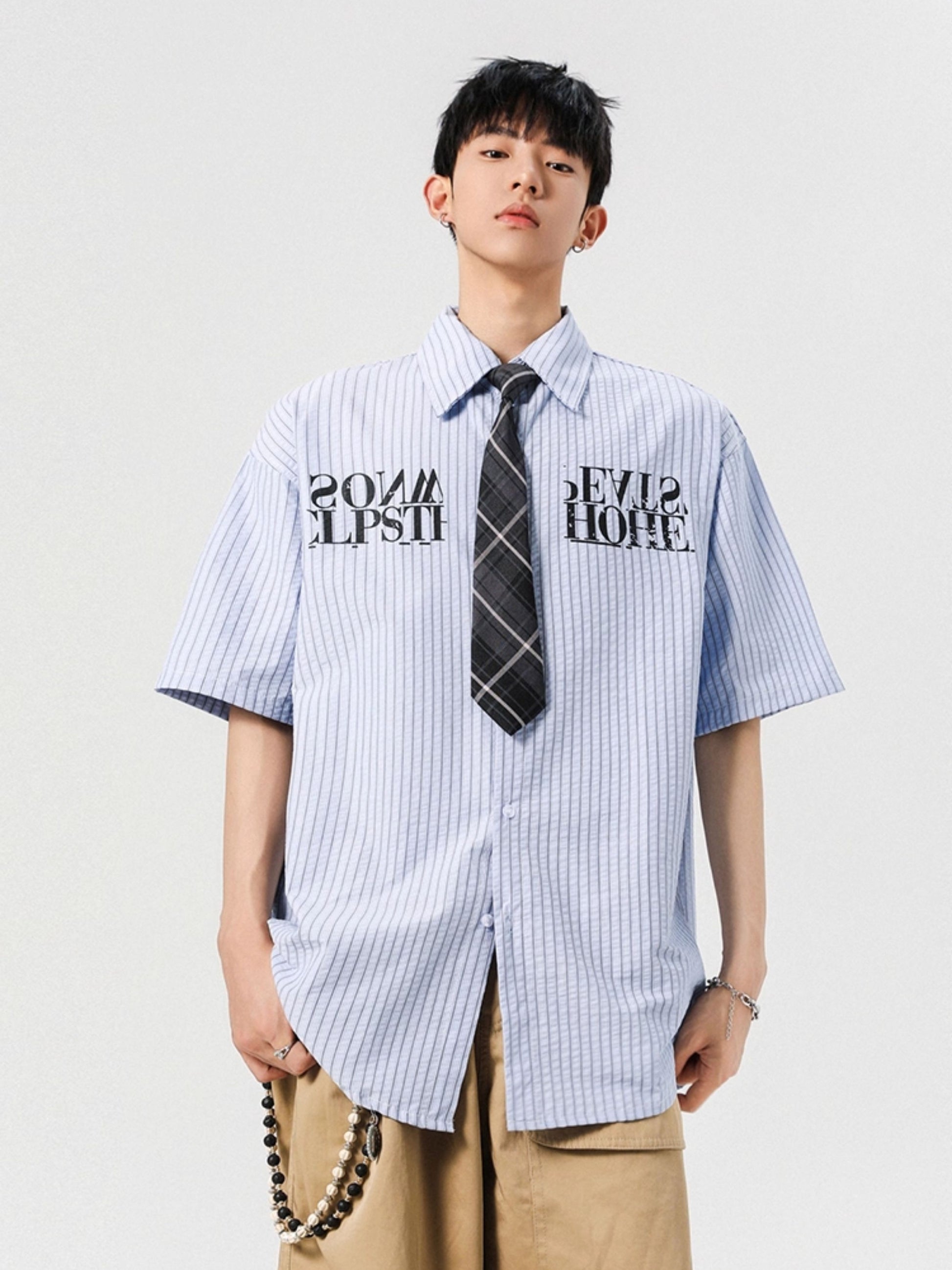 パフコットンストライプ半袖シャツ ネクタイ付き TK0274