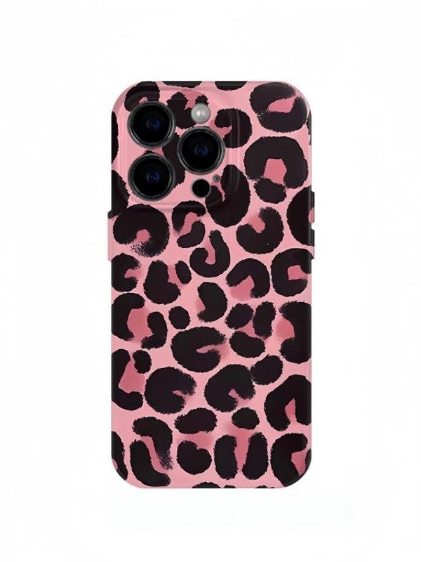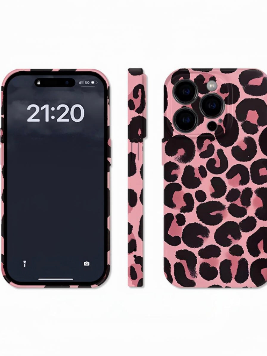 商品説明:光沢感のあるピンクレオパード柄の全包みソフトケース。iPhone14〜16に対応し、可愛さと保護力を両立したデザインです。