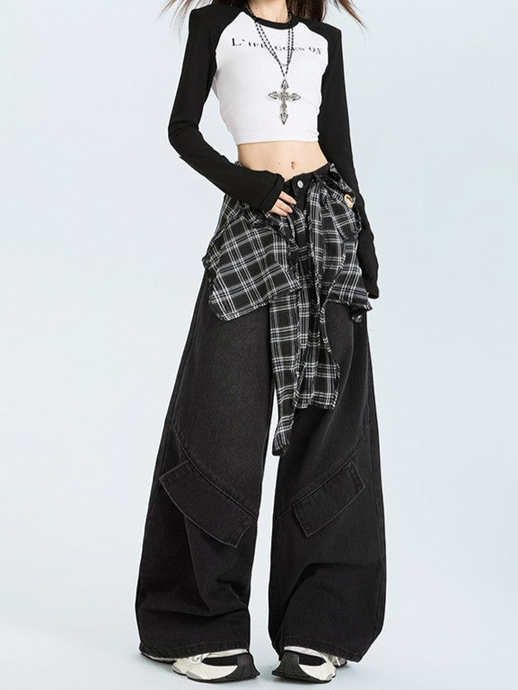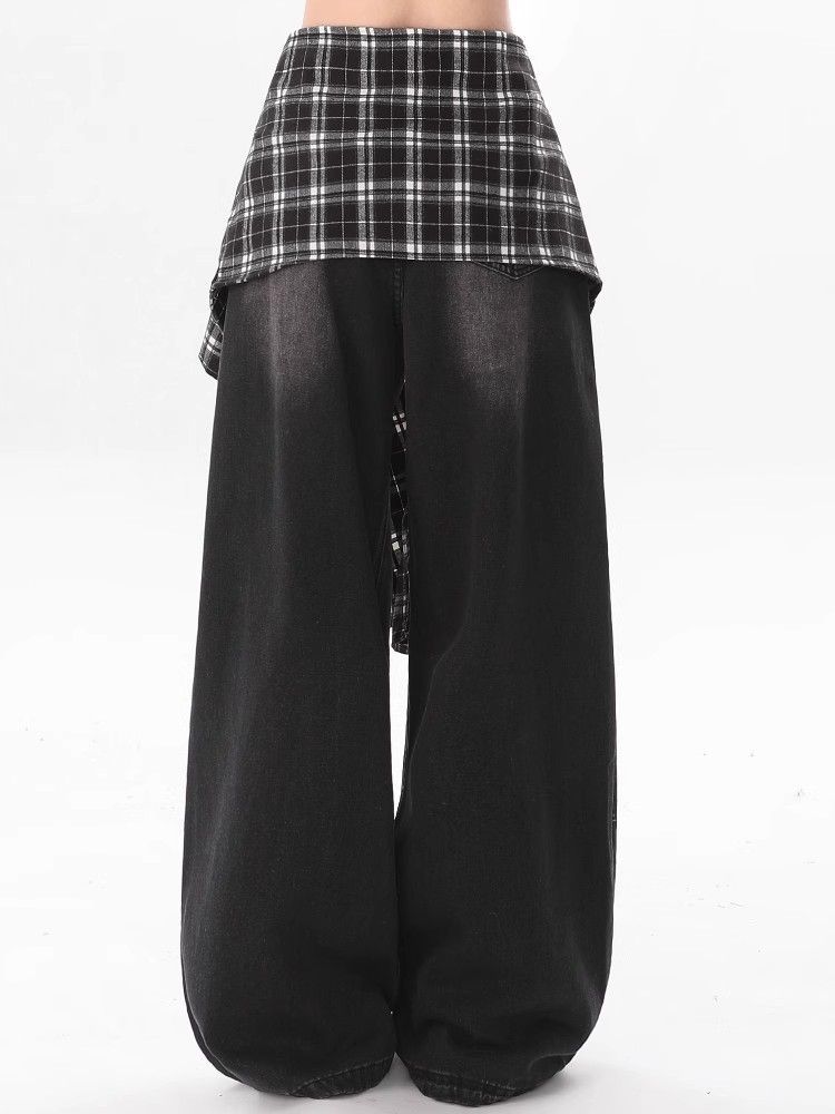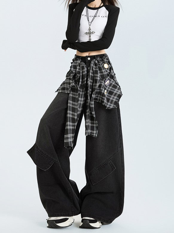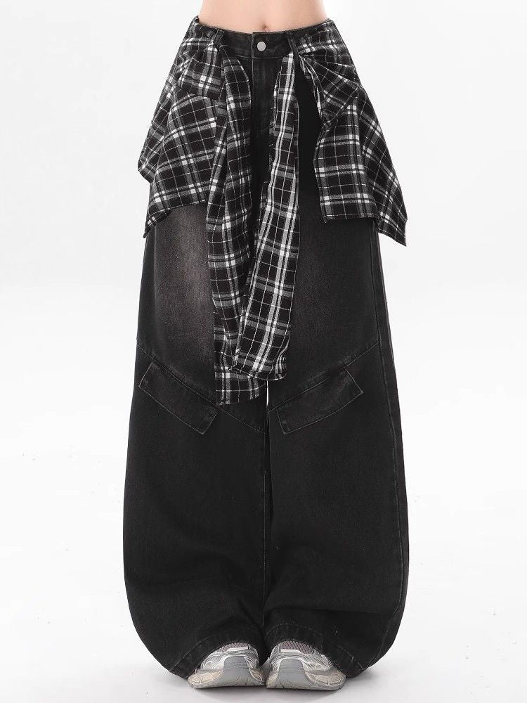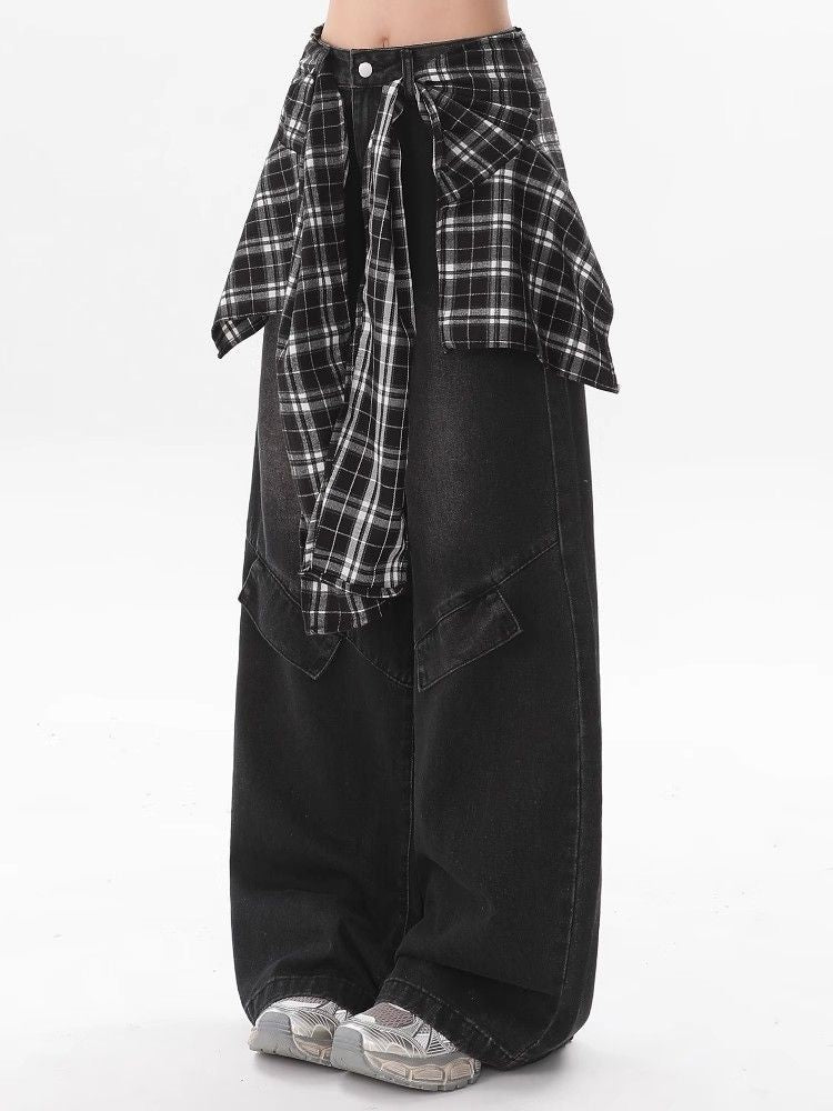商品説明:腰に巻いたように見えるチェック布がポイントのユニークなワイドデニム。ゆったりとしたシルエットとハイウエストでスタイルアップも叶う1本。ヴィンテージ感のあるウォッシュ加工がこなれ感を演出し、ストリートカジュアルやダンスパフォーマンスにも相性抜群です。