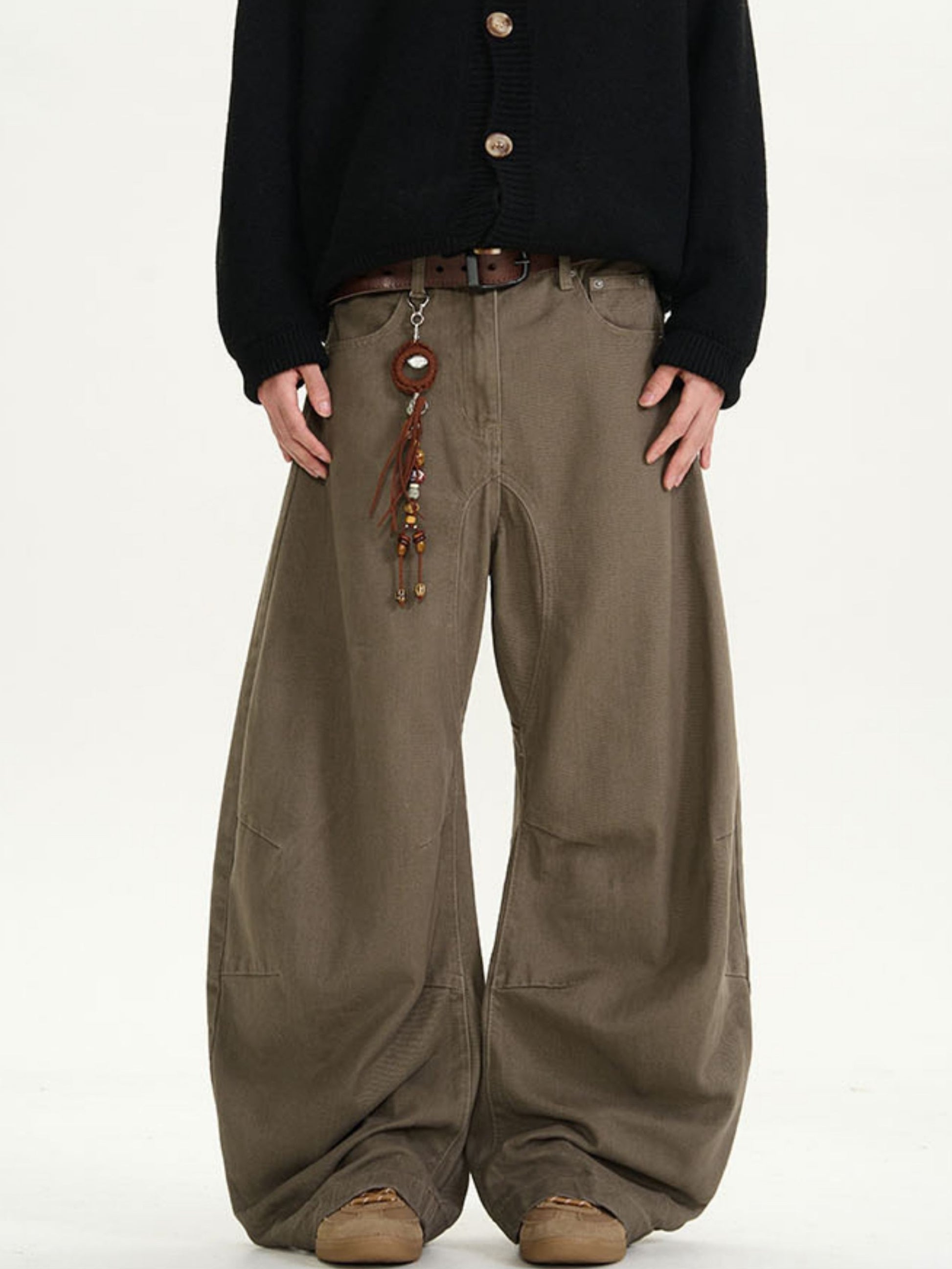 商品説明:アメリカンストリート風のカーブシルエットが特徴のブラウンデニム。ユニセックスで着用できるワイドなシルエットと洗い加工が、こなれたヴィンテージ感を演出します。
