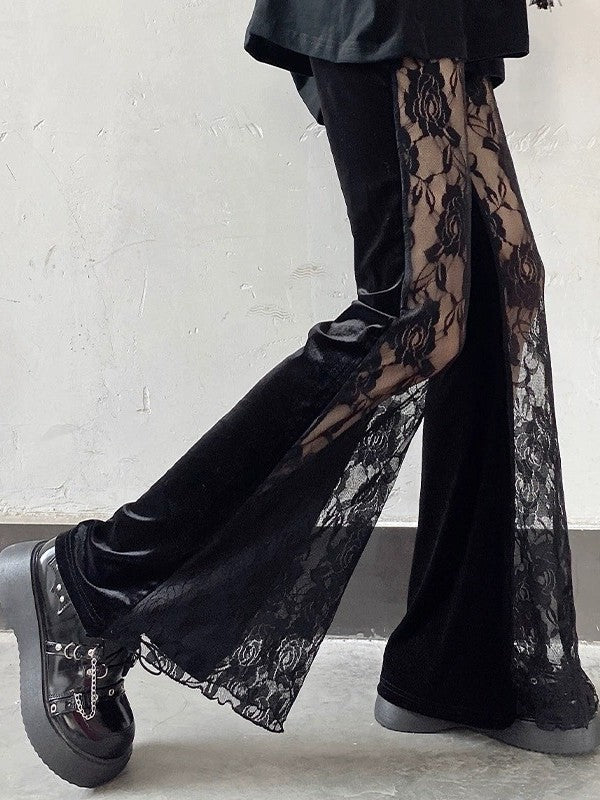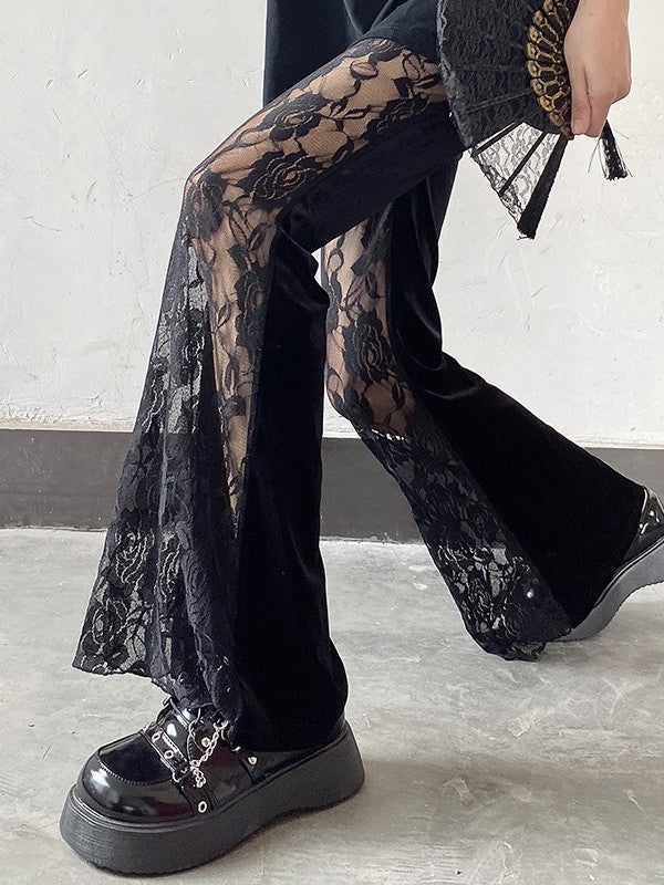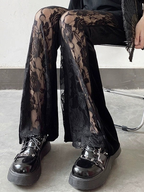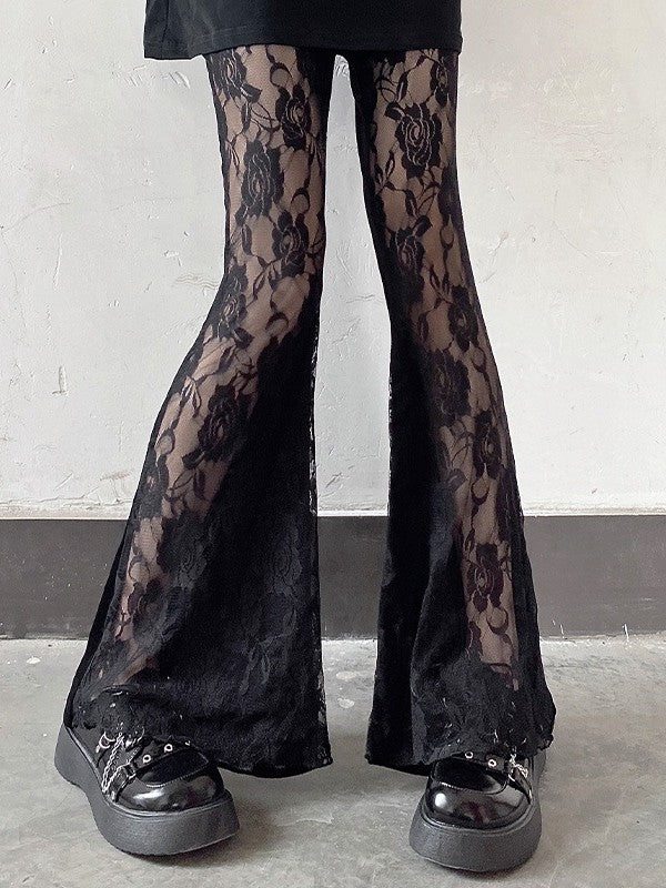 商品説明:透け感のあるブラックレースにローズ柄を施した個性派パンツ。脚長効果のあるフレアシルエットで、セクシーかつトレンド感のあるスタイルに仕上がります。