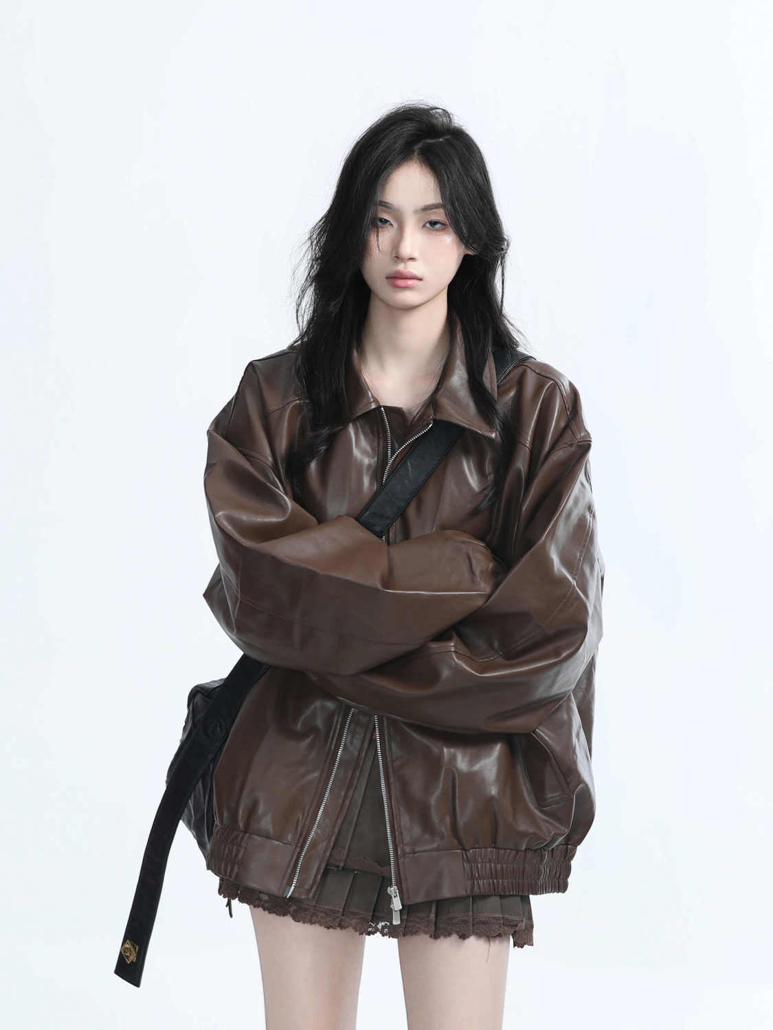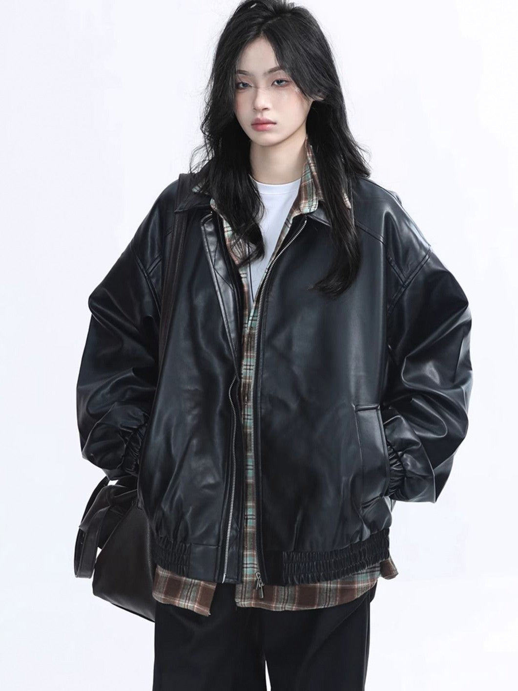 商品説明:マットな質感のPUレザーを使った秋の定番ジャケット。ブラックとブラウンの2色展開で、カジュアルにもきれいめにも合わせやすいデザインです。ゆったりとしたシルエットで小柄な方にもバランス良く着こなせます。