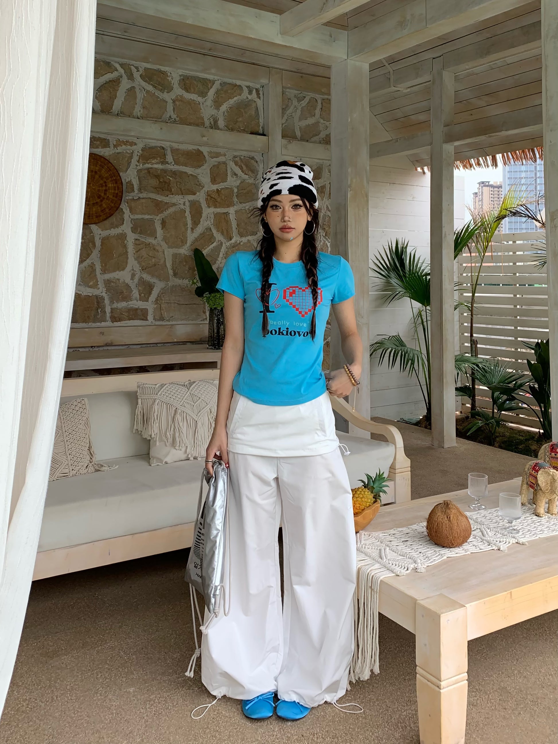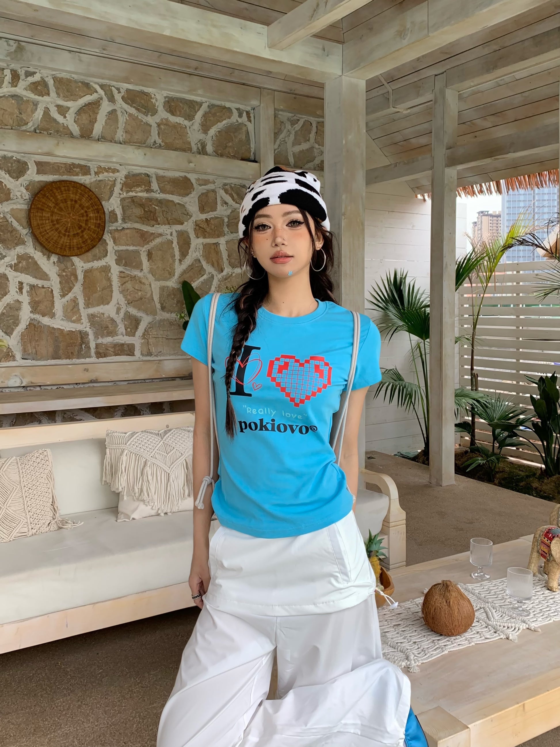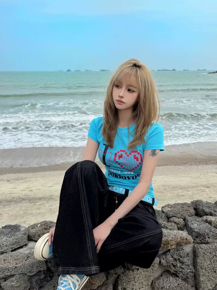 商品説明:Y2K風のデザイン感あるブルーTシャツ。甘辛ミックスな多幸感カラーで、夏のスタイルにぴったり。タイトなシルエットで女性らしさも演出。