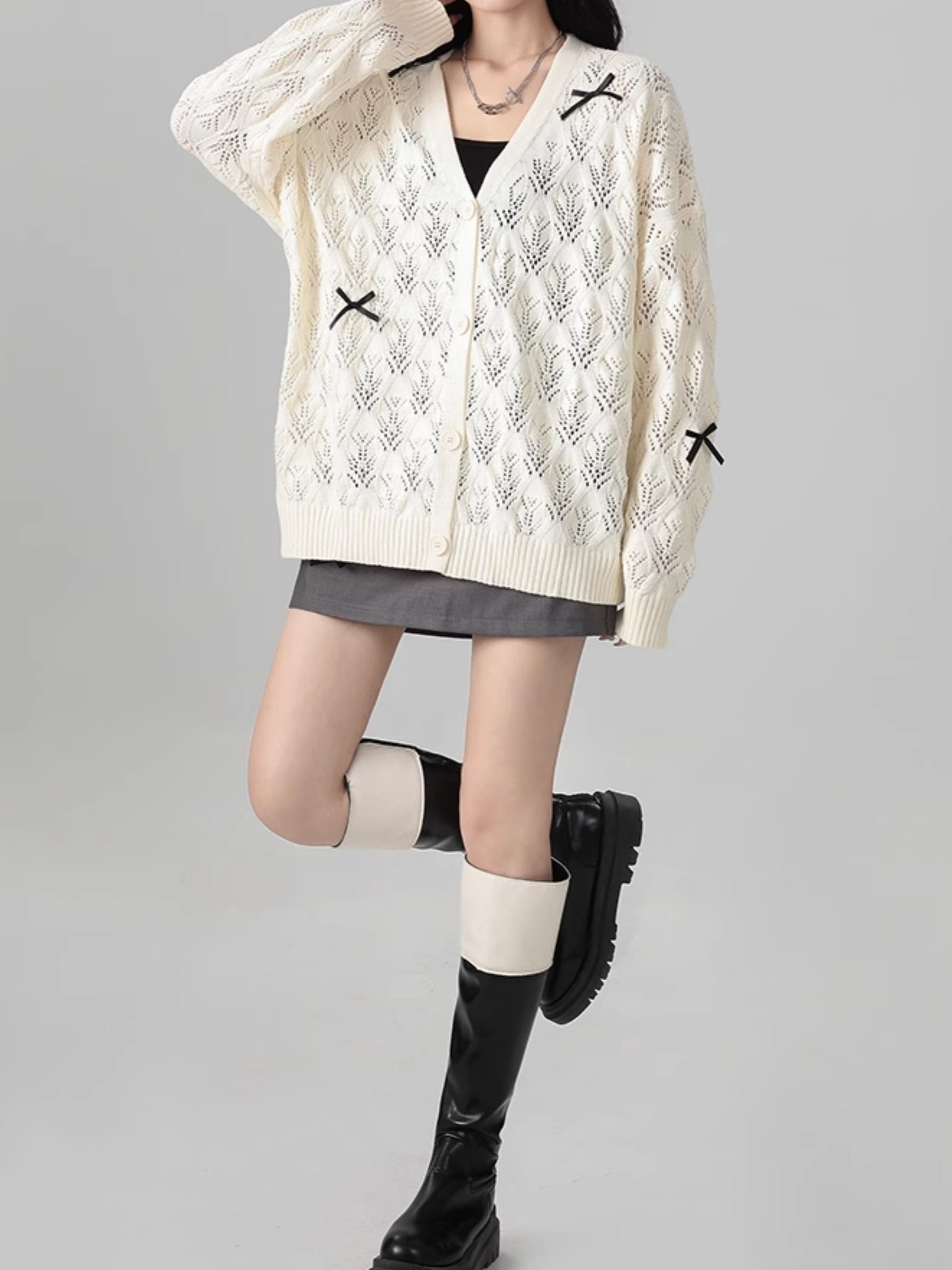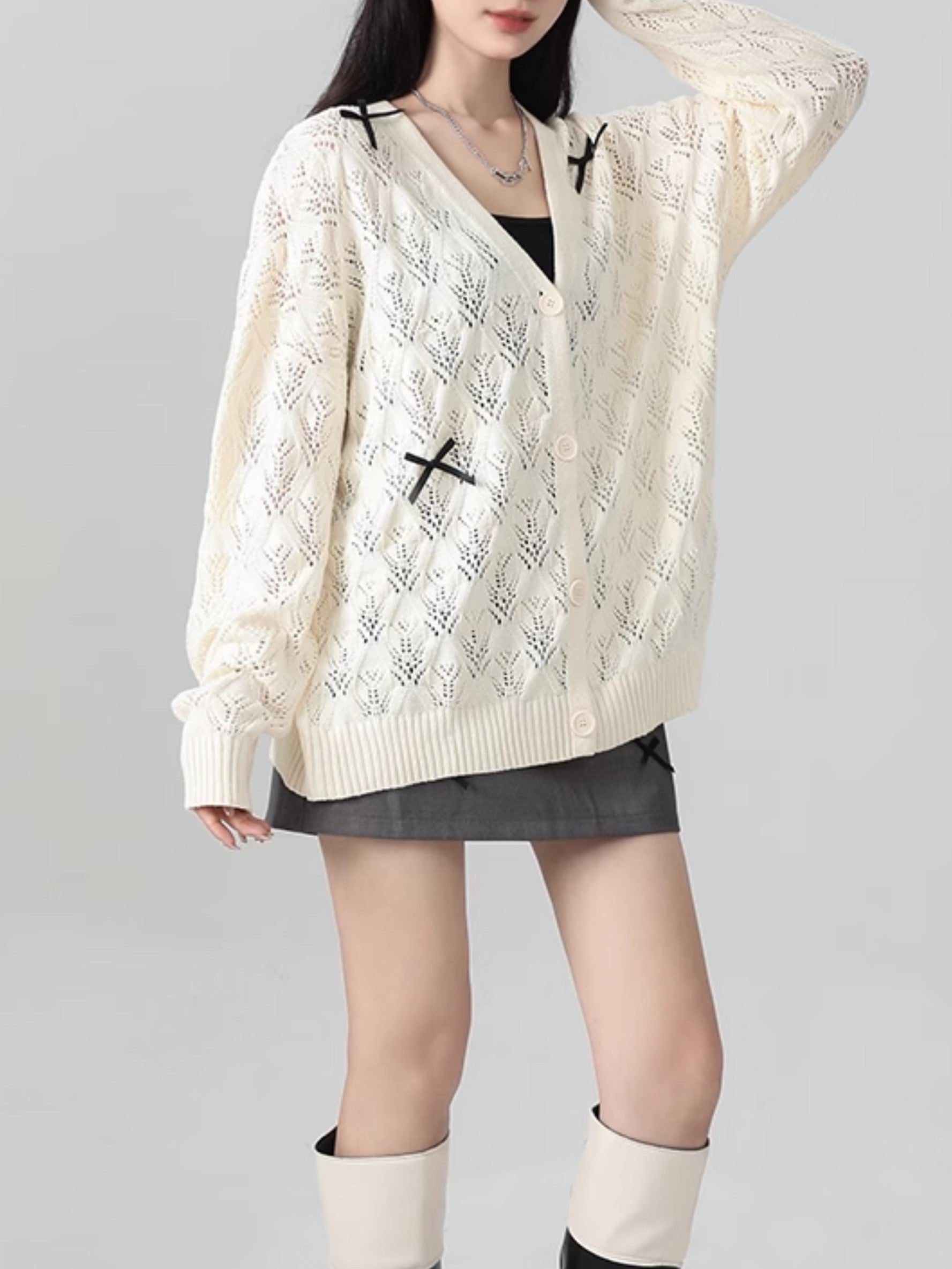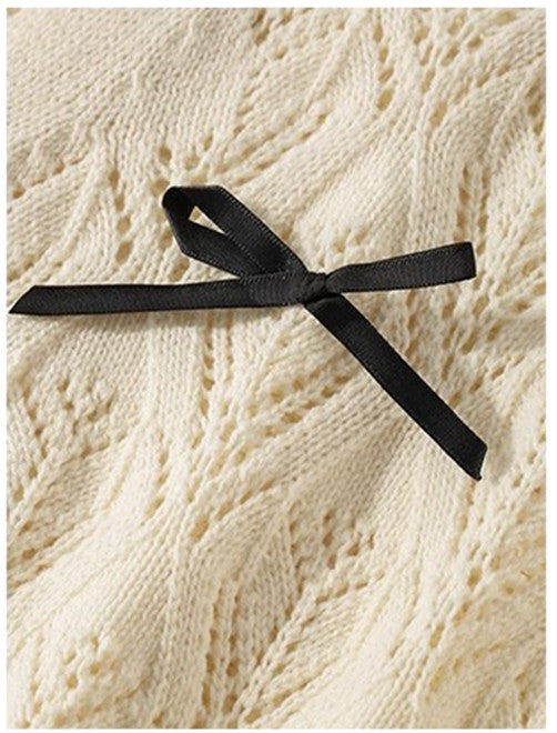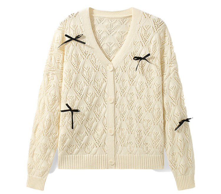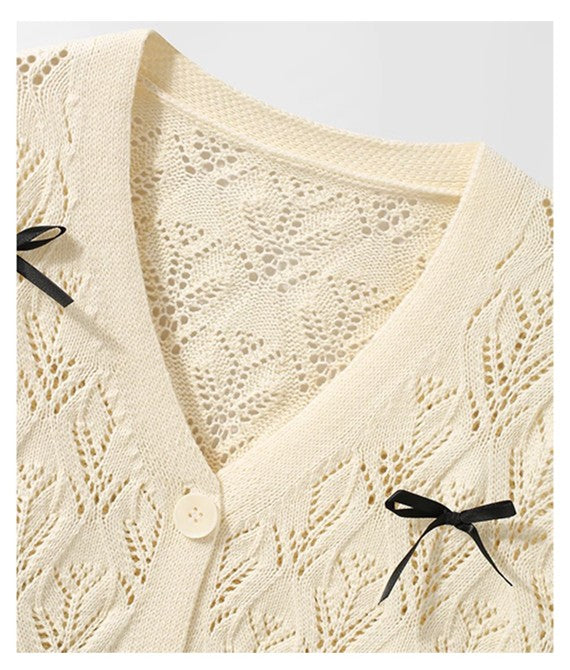 商品説明:柔らかな米白色の透かし編みデザインが可愛い薄手ニットカーディガン。リボンのアクセントでガーリーな雰囲気を演出し、羽織りや肩掛けとしても使える万能アイテム。