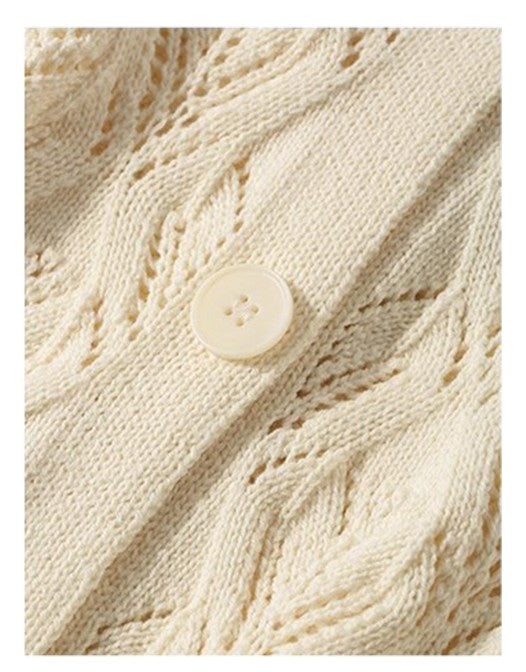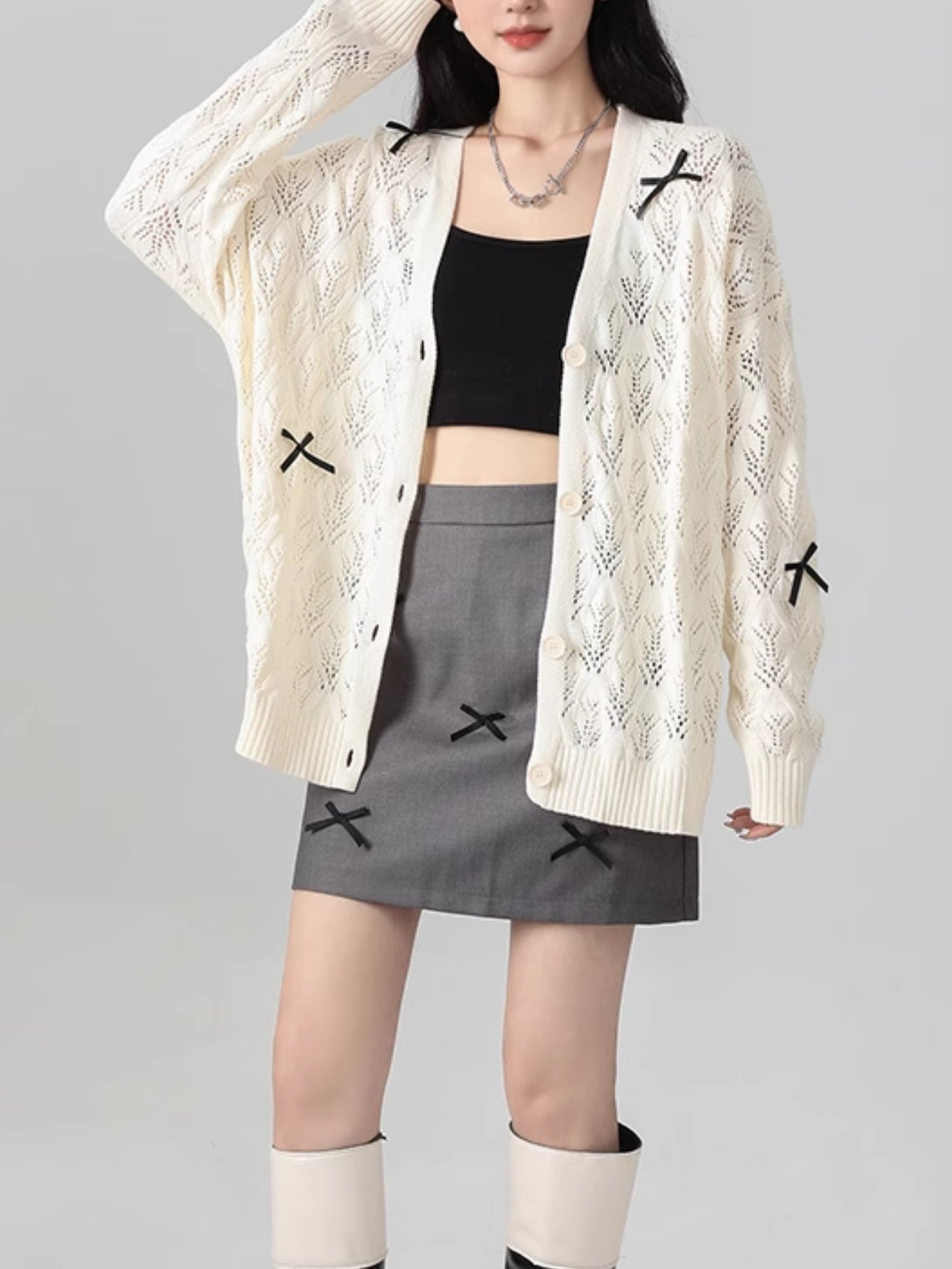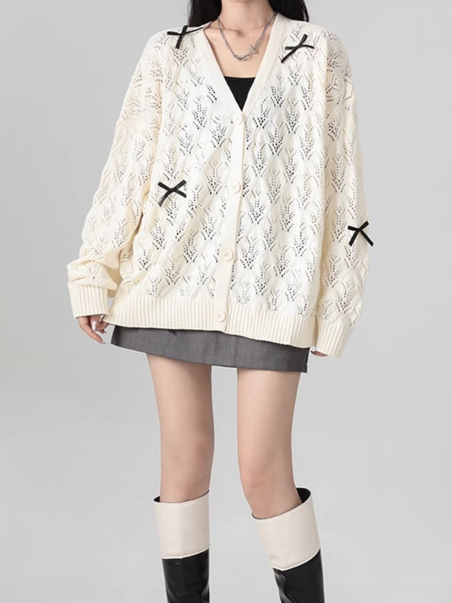 商品説明:柔らかな米白色の透かし編みデザインが可愛い薄手ニットカーディガン。リボンのアクセントでガーリーな雰囲気を演出し、羽織りや肩掛けとしても使える万能アイテム。