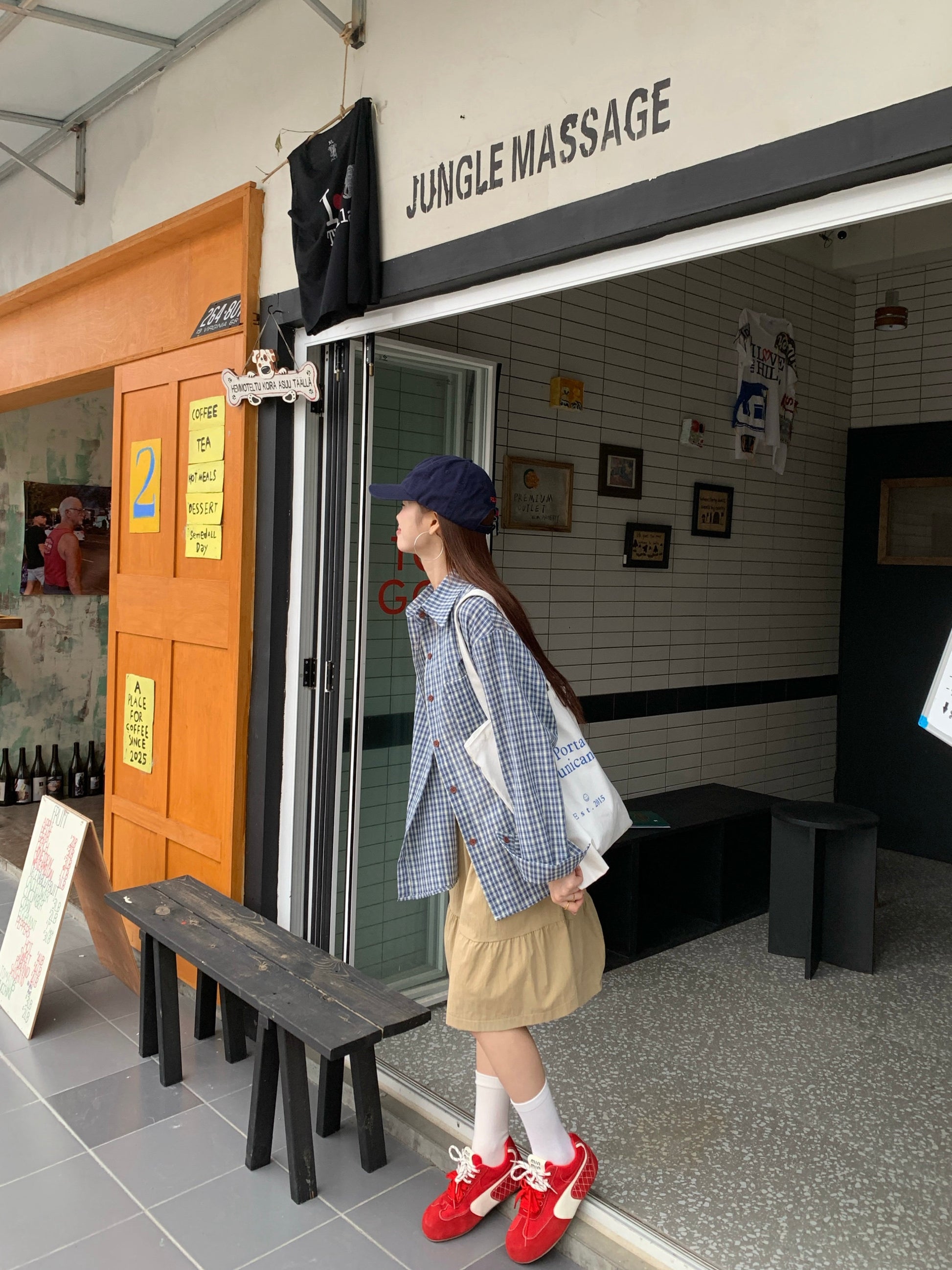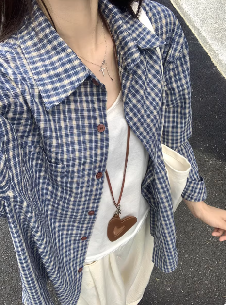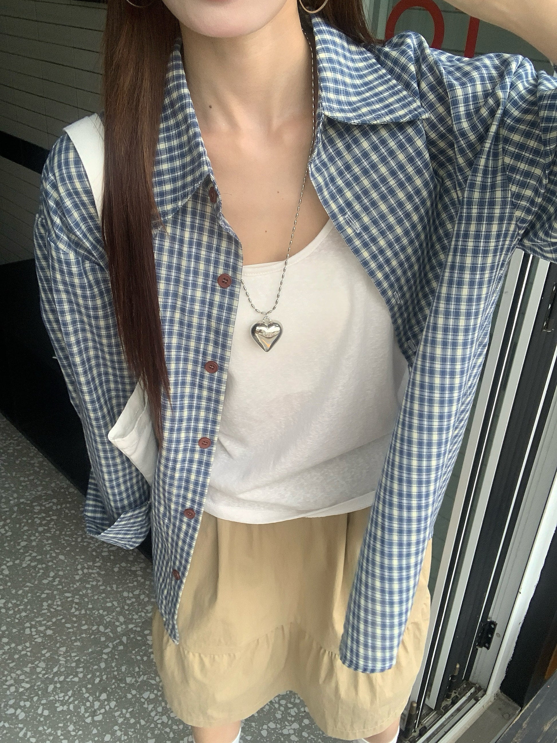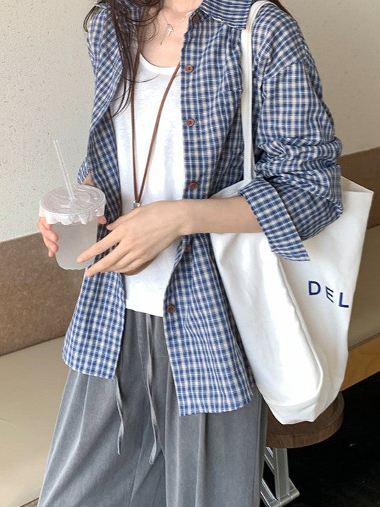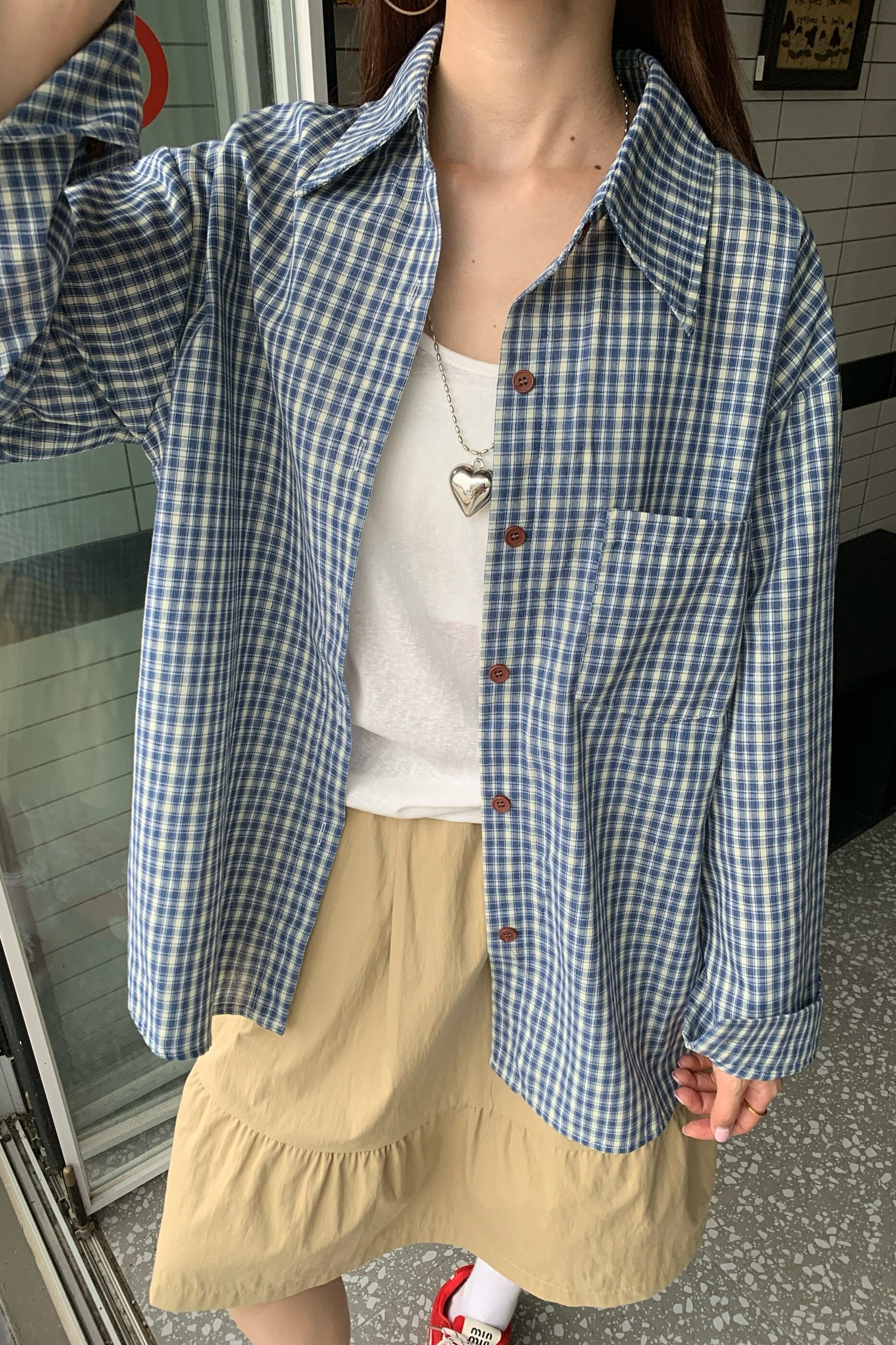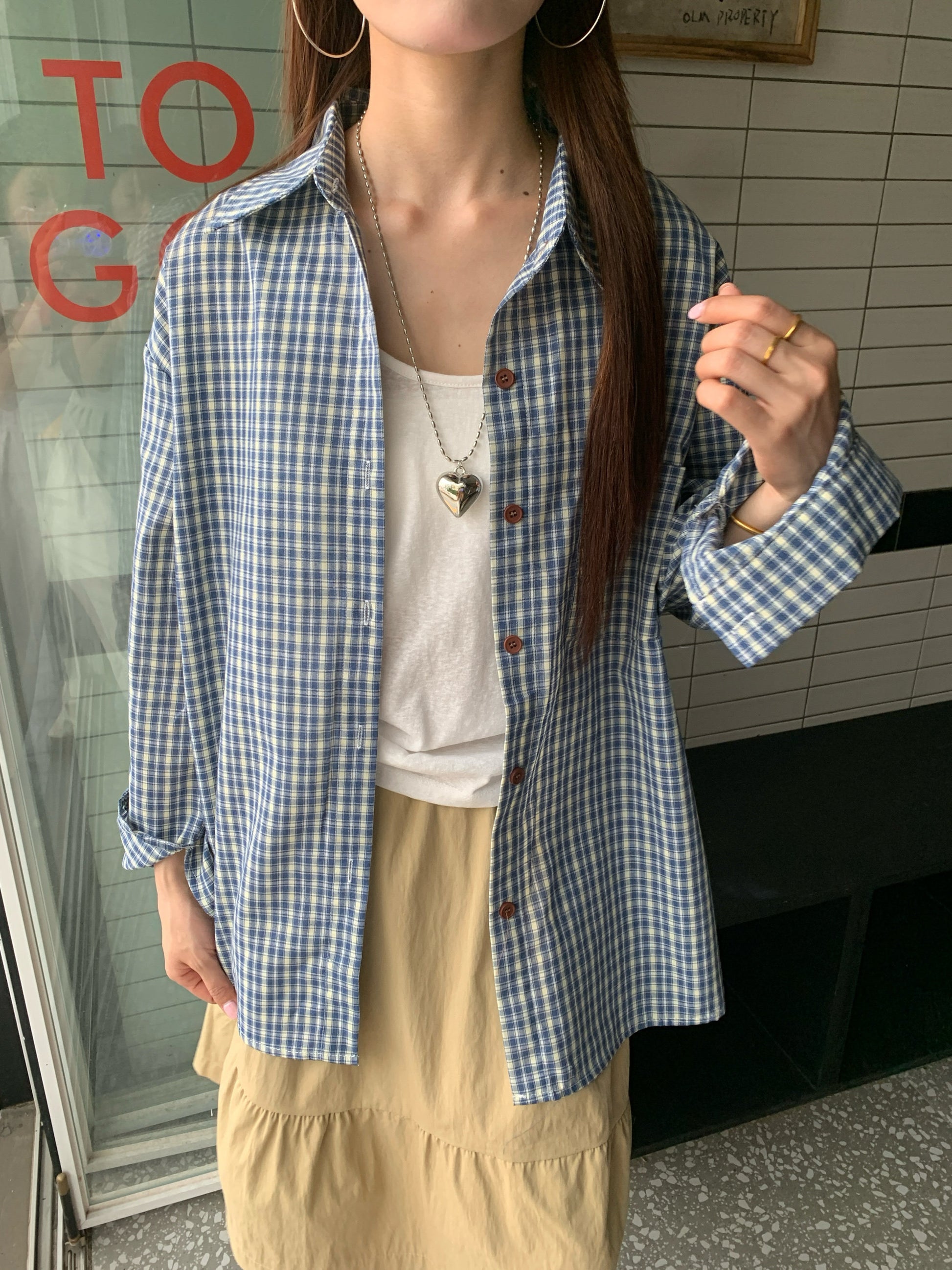 商品説明:春夏にぴったりなブルーチェックシャツ。ゆったりシルエットで重ね着にも最適。カジュアルなデザインが魅力の一枚です。