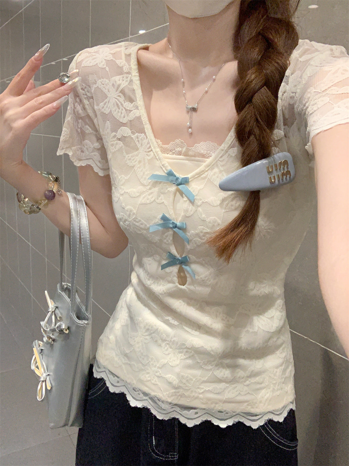 「程よい透け感」レースリボンアイスシルクカットアウトTシャツ TK0262