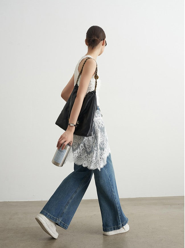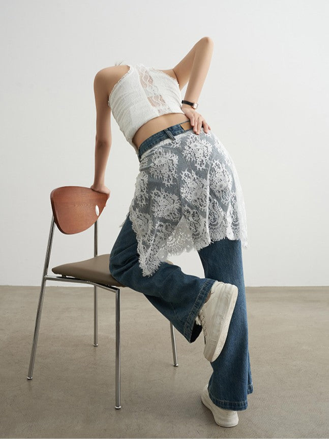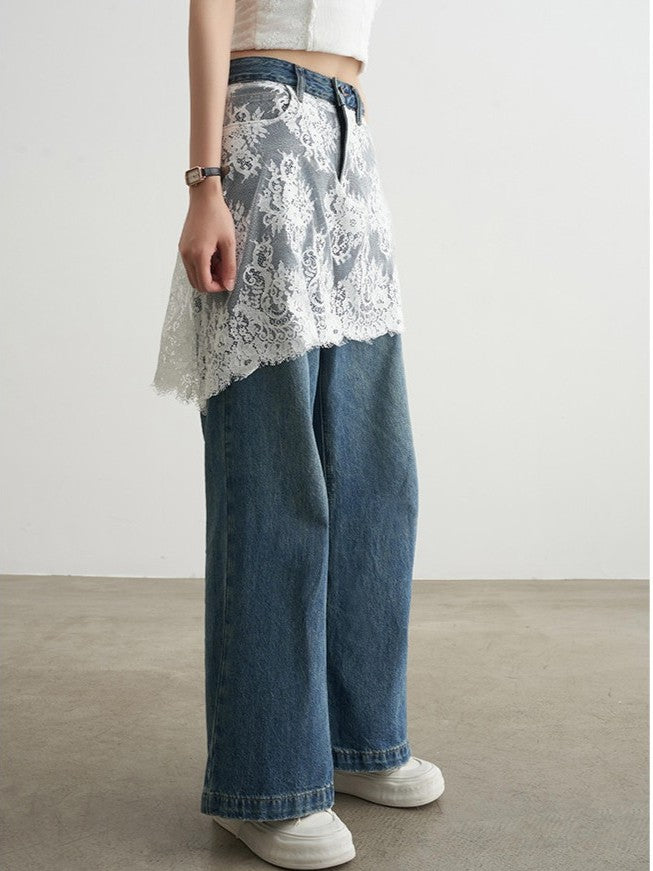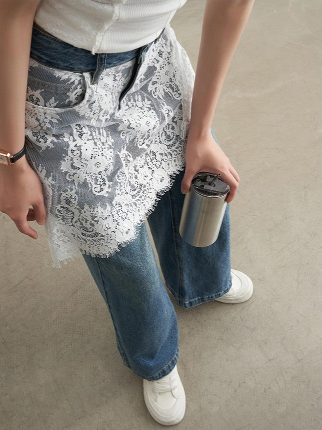 商品説明:レーススカートを重ね着しているように見えるデザインデニムパンツ。ゆったりとしたストレートシルエットで抜け感があり、動くたびにレースが揺れてフェミニンな印象に。ブルーデニムとのコントラストが映え、春秋のお出かけや街歩きにぴったり。シンプルなトップスと合わせるだけでコーデが完成します。