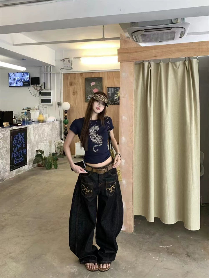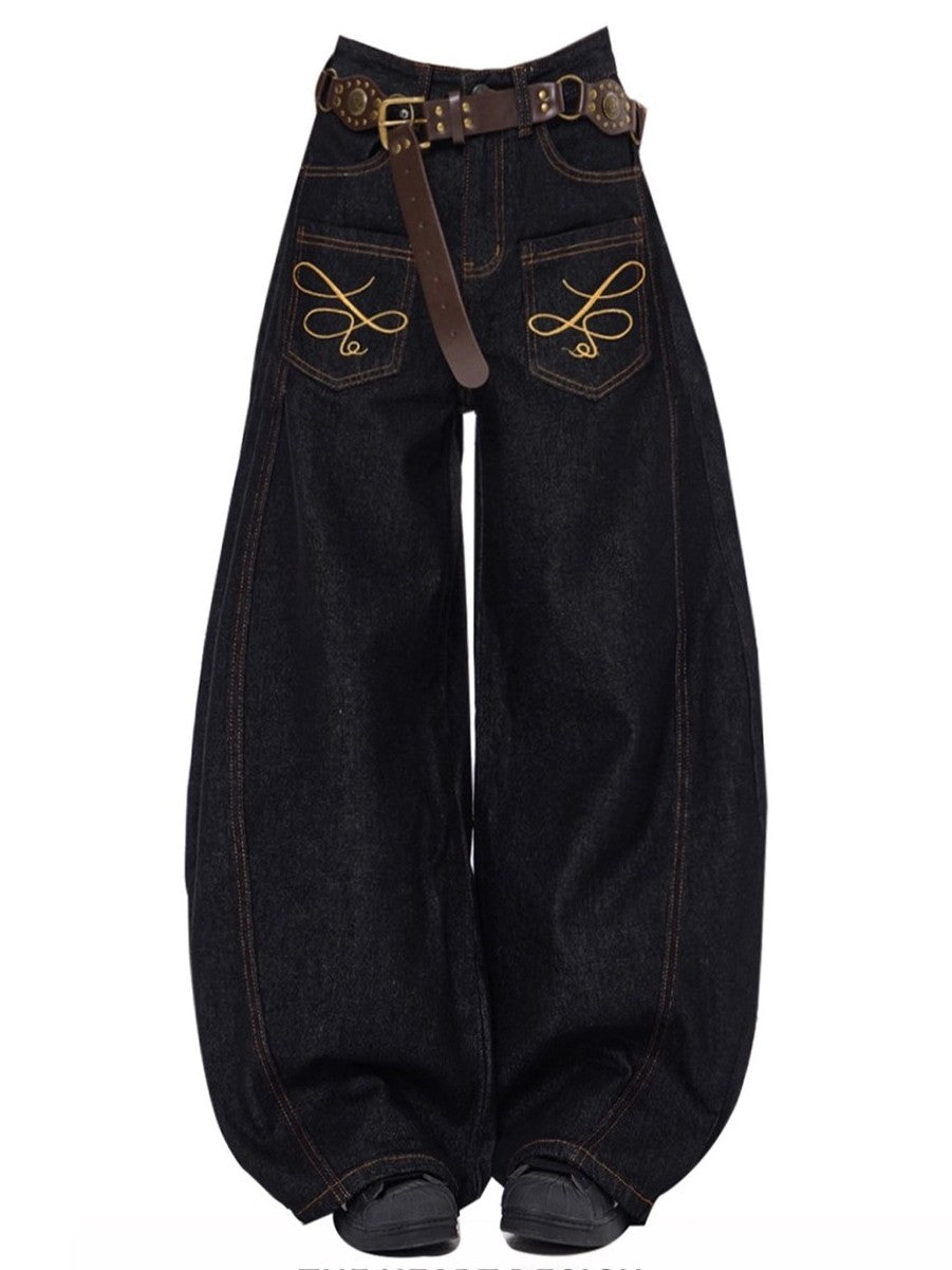 商品説明:大胆なワイドシルエットが魅力のデニムパンツ。バックポケットの刺繍がアクセントとなり、存在感抜群。ストリートコーデやフェス、ダンスシーンにも最適。シンプルなトップスと合わせるだけで個性を演出できる1本です。