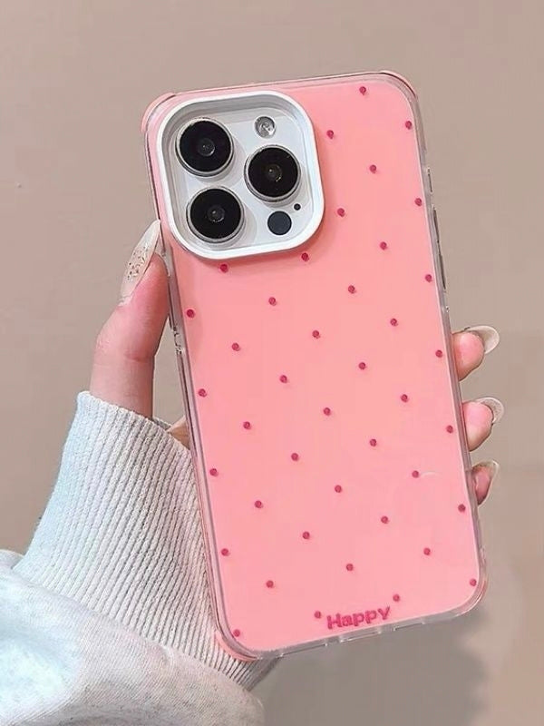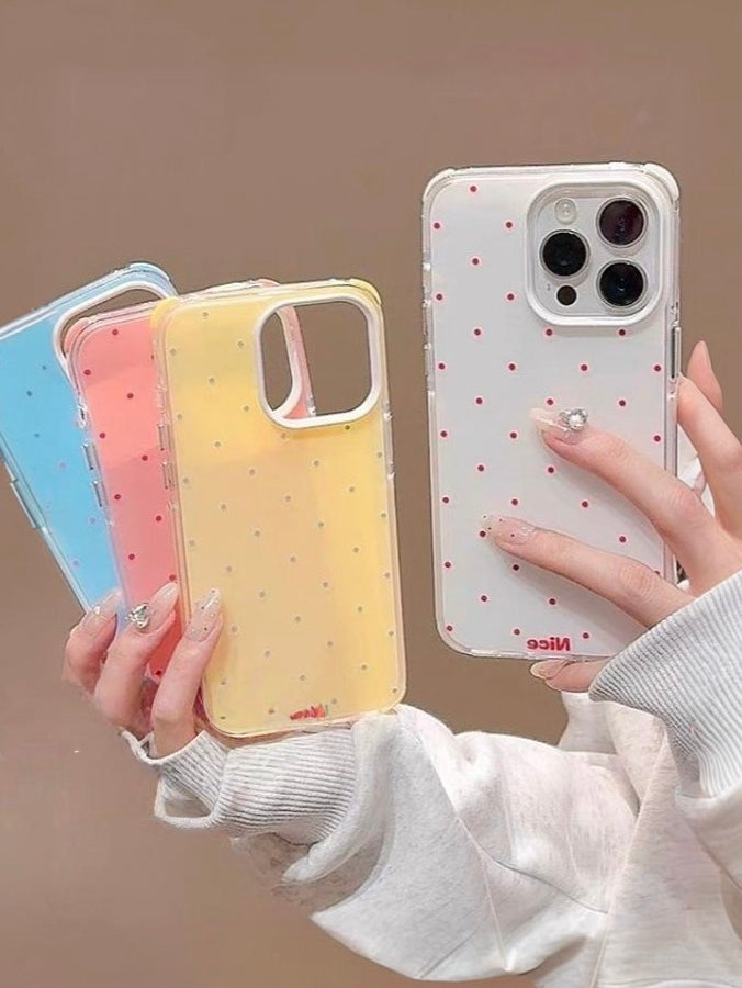 商品説明:ピンク・ホワイト・ブルーの3色展開。全包み仕様でマットな質感が魅力の水玉柄ケース。iPhone14〜16対応。