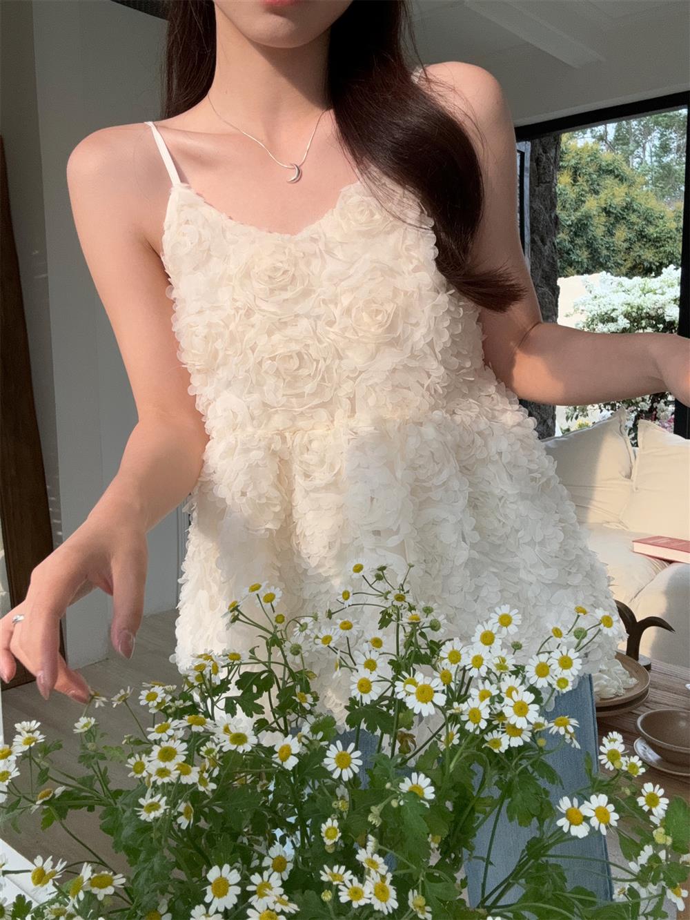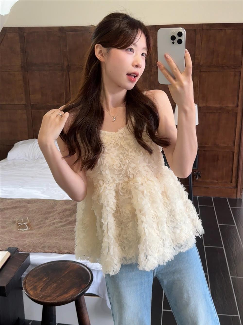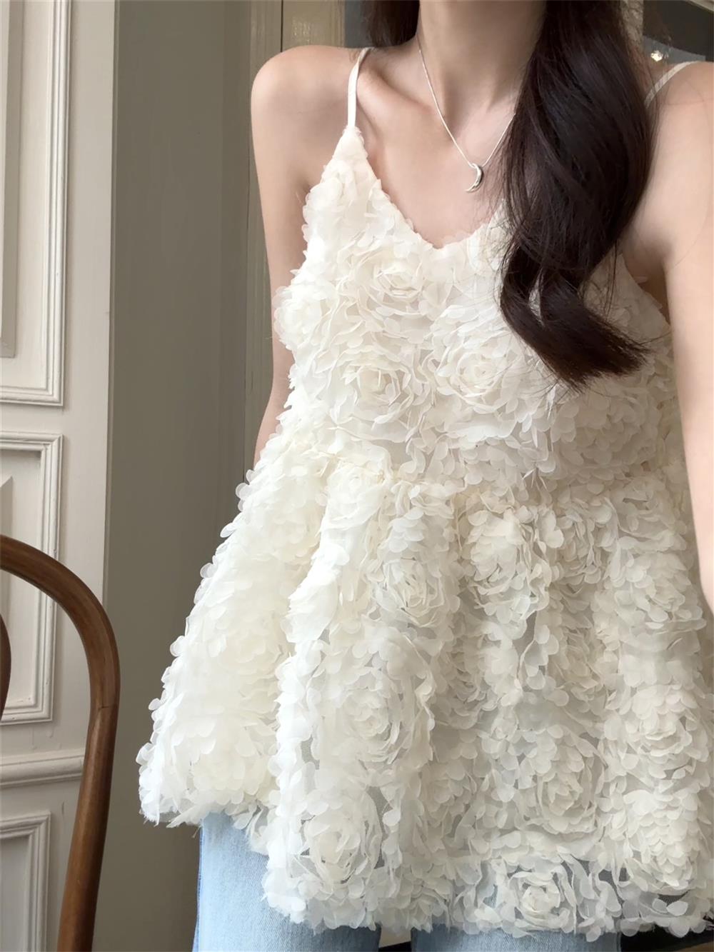 商品説明:繊細な立体フラワーデザインが魅力のキャミブラウス。フレンチテイスト漂う上品な一枚で、夏のコーデに華やかさをプラス。スタイルアップ効果も◎。