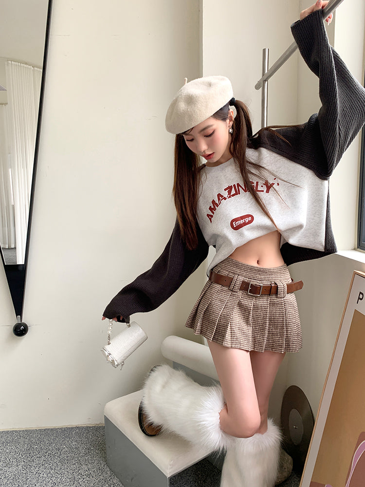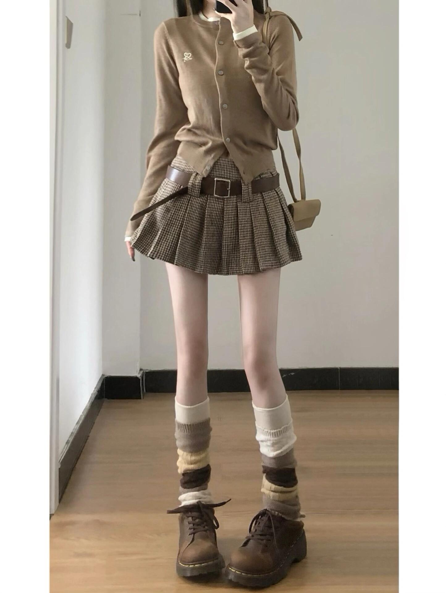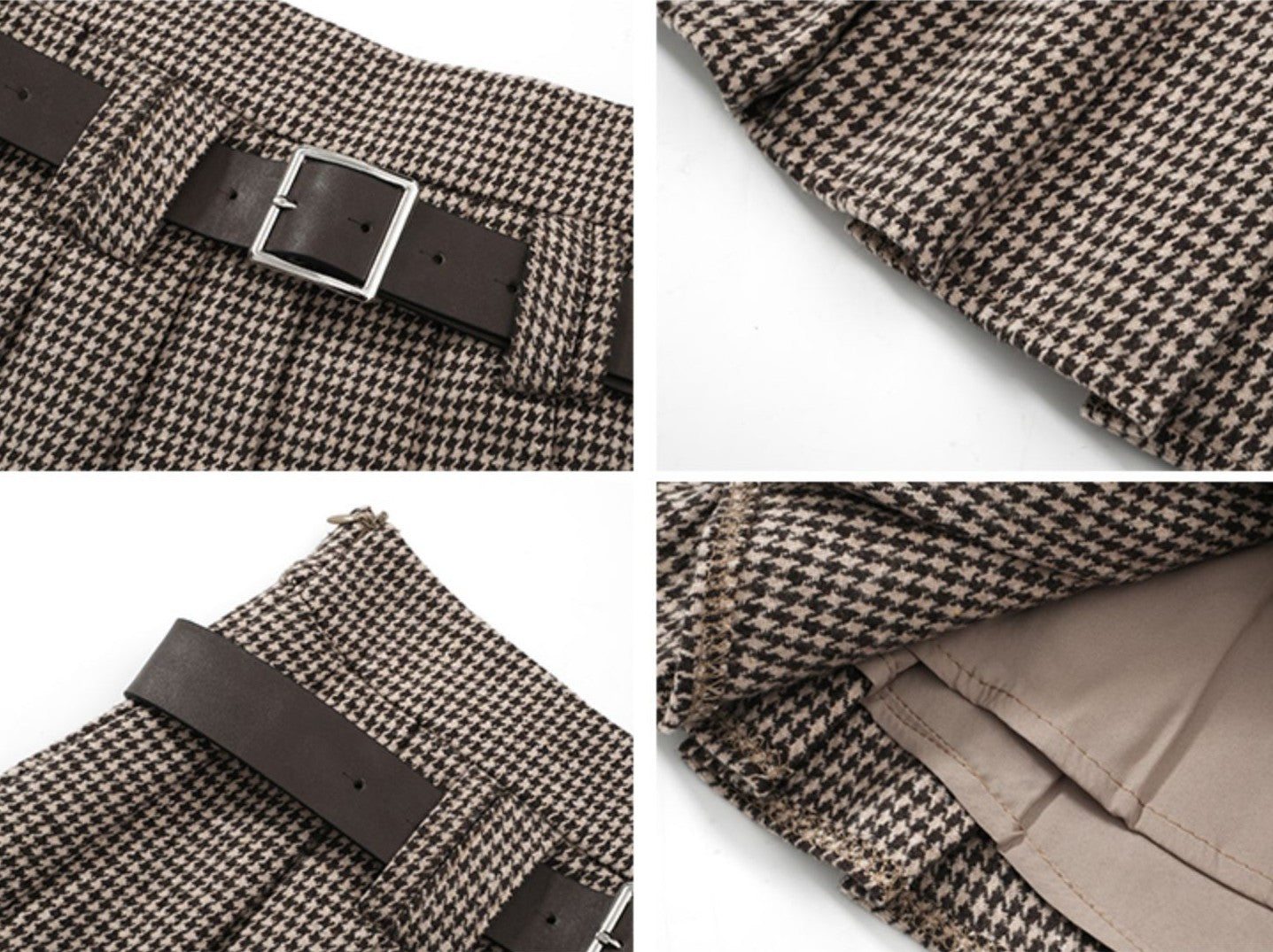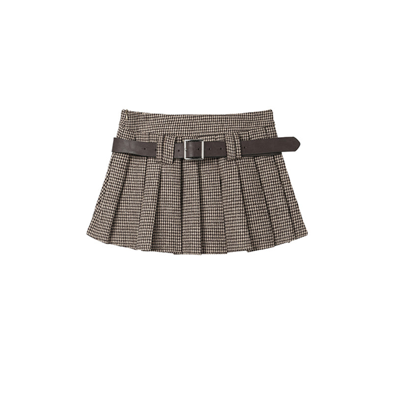 商品説明:ヴィンテージライクな千鳥格子とプリーツが秋スタイルを格上げするブラウンAラインミニ。ウール混の温もり素材で、カフェデートやショッピング、夜のお出かけまで幅広く活躍。裏地とインナーパンツ付きで、心配もなく安心して着られます。