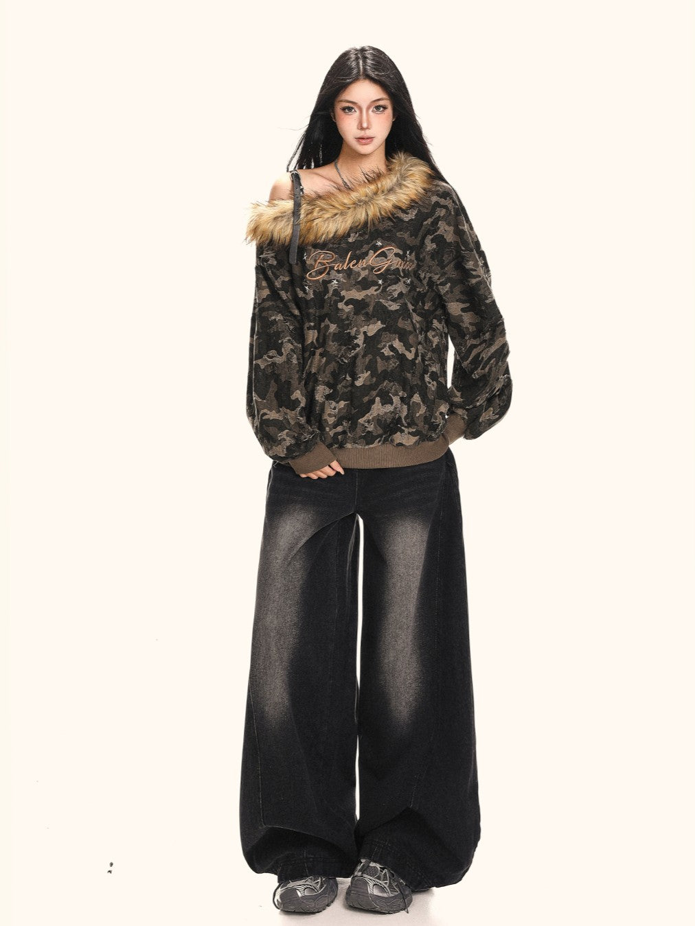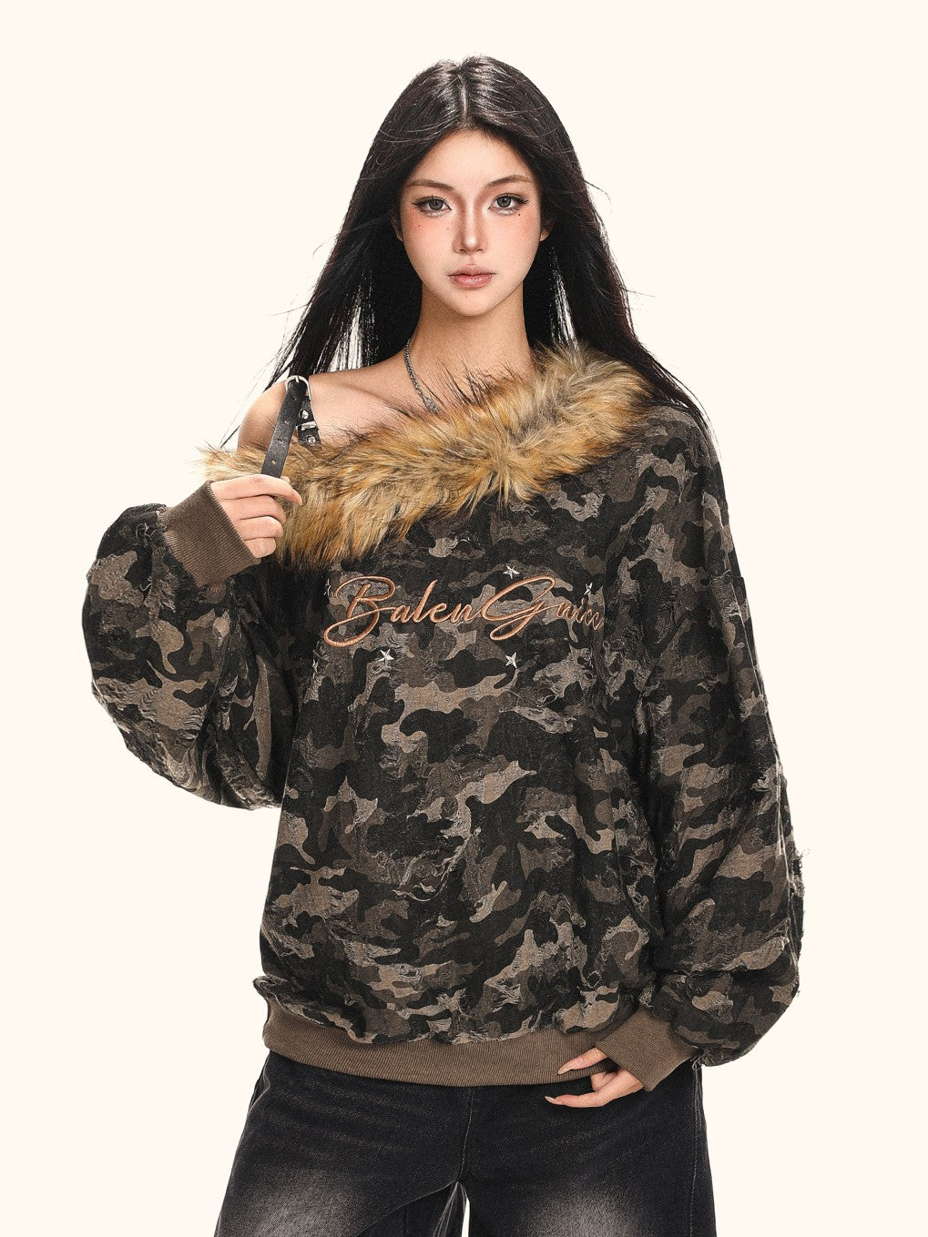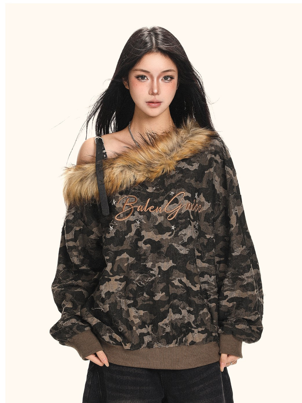 迷彩柄ファー付き斜めネックスウェットトップス TK0322