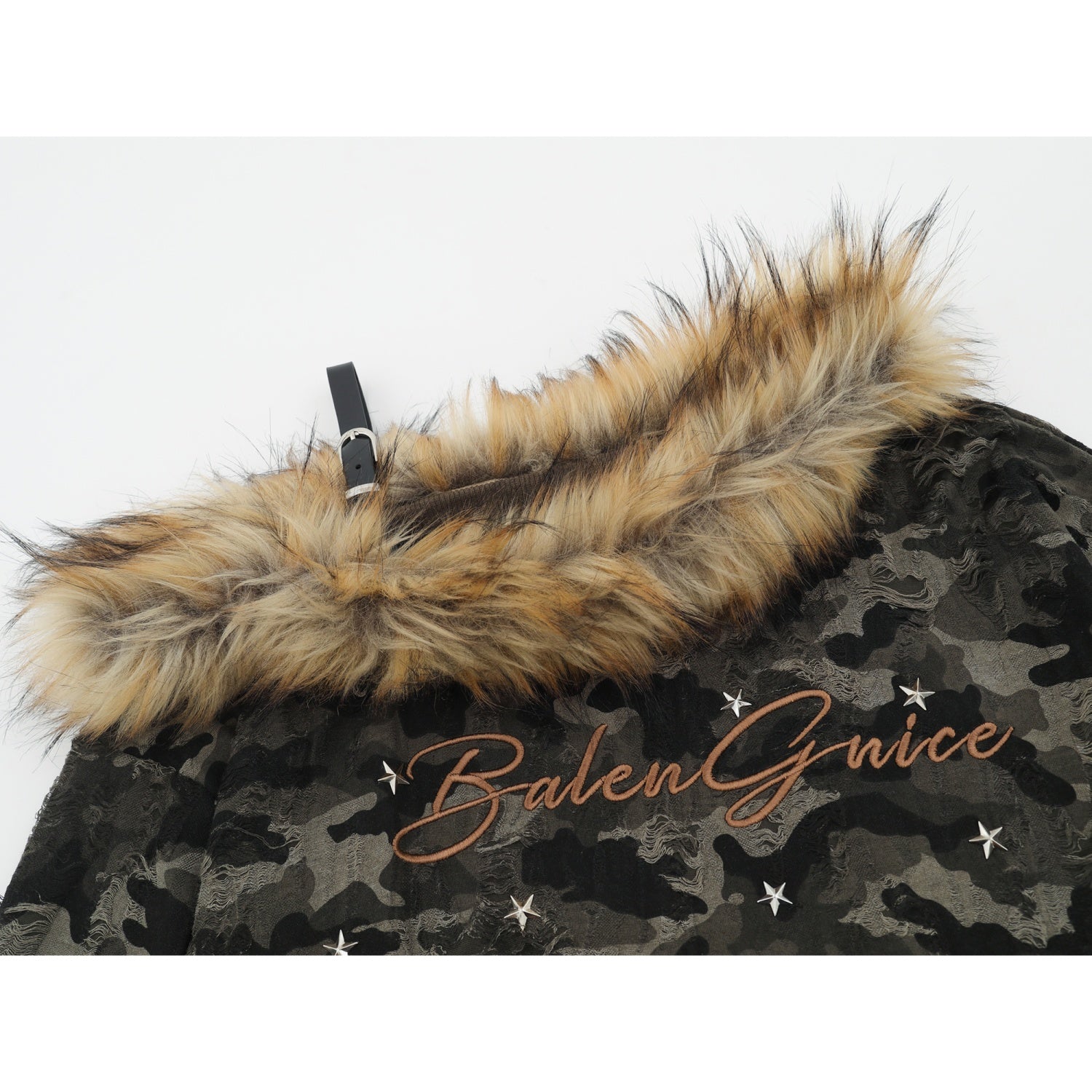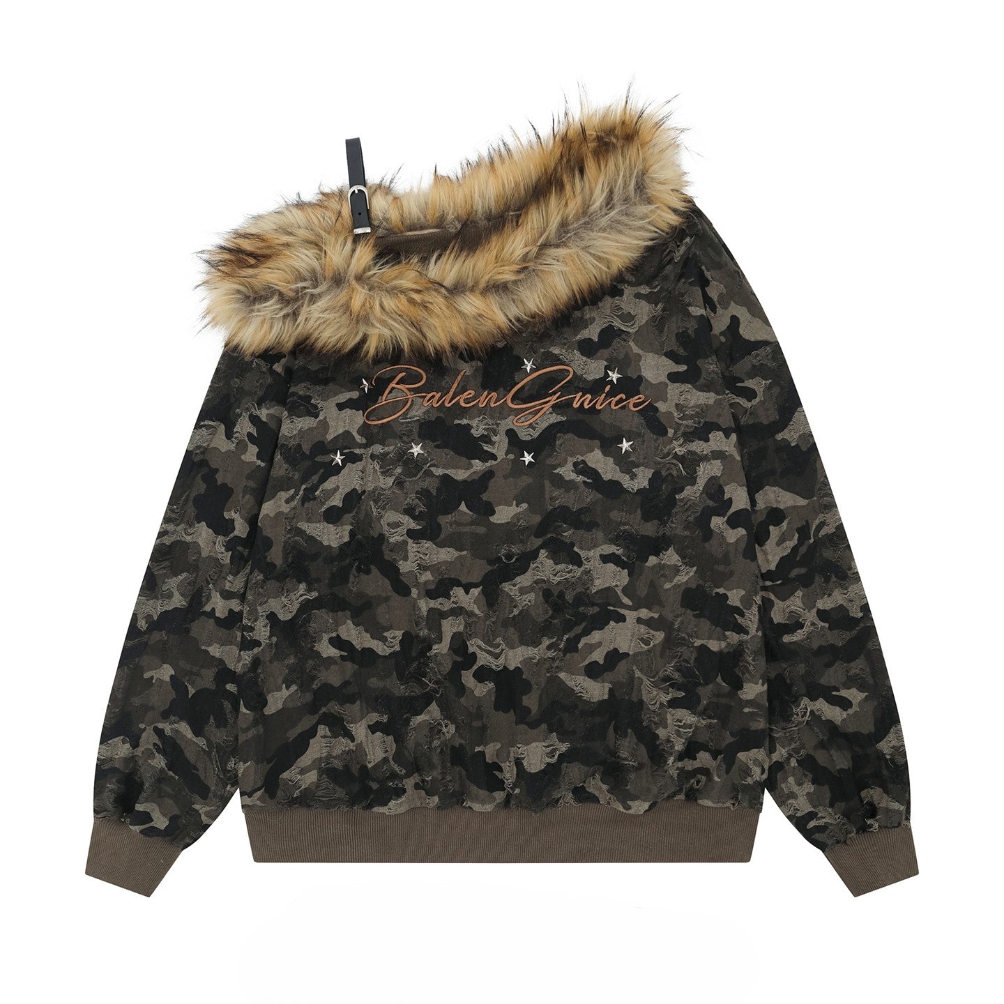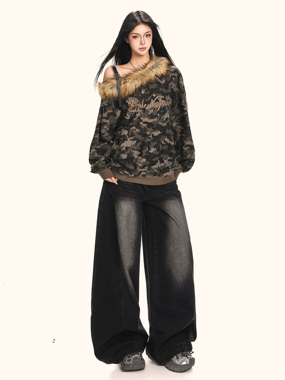 迷彩柄ファー付き斜めネックスウェットトップス TK0322