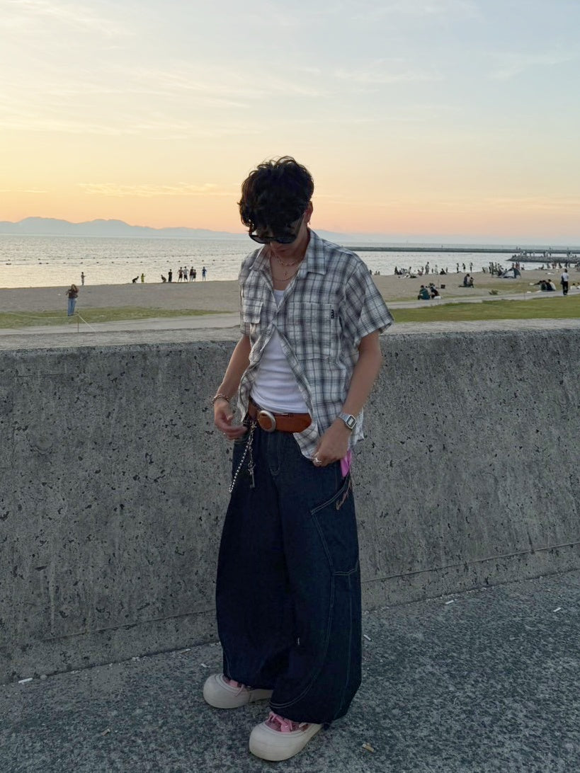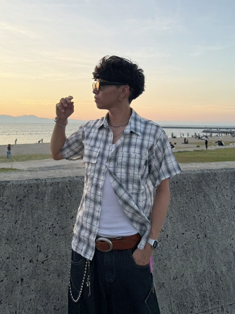 商品説明:ゆったりとしたシルエットが魅力のチェック柄半袖シャツ。男女問わず着用できるユニセックスデザインで、日系レトロな雰囲気を演出。ラフでこなれ感のあるコーデにぴったりです。