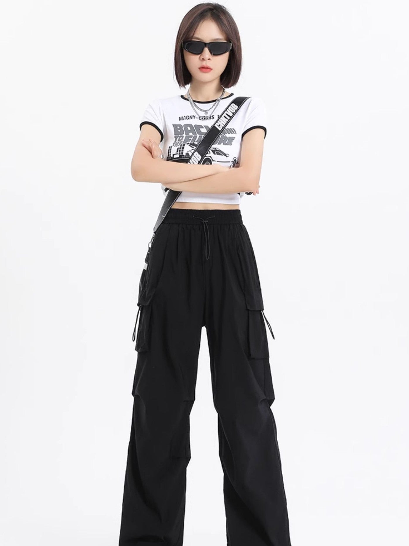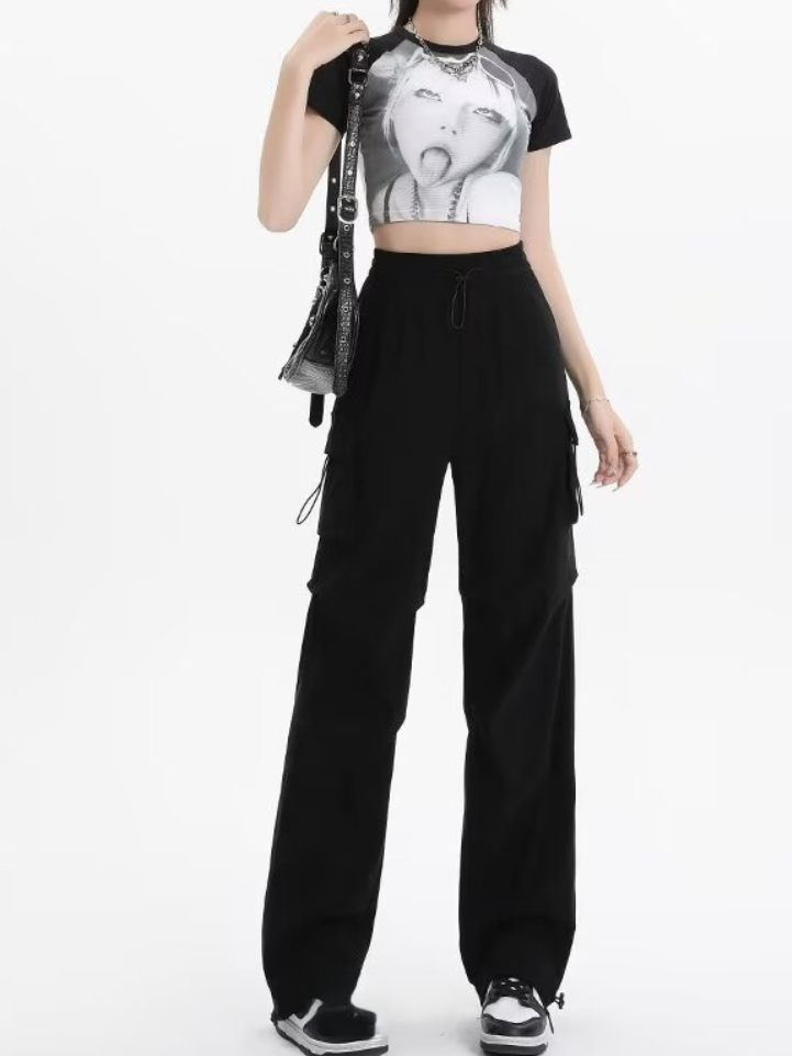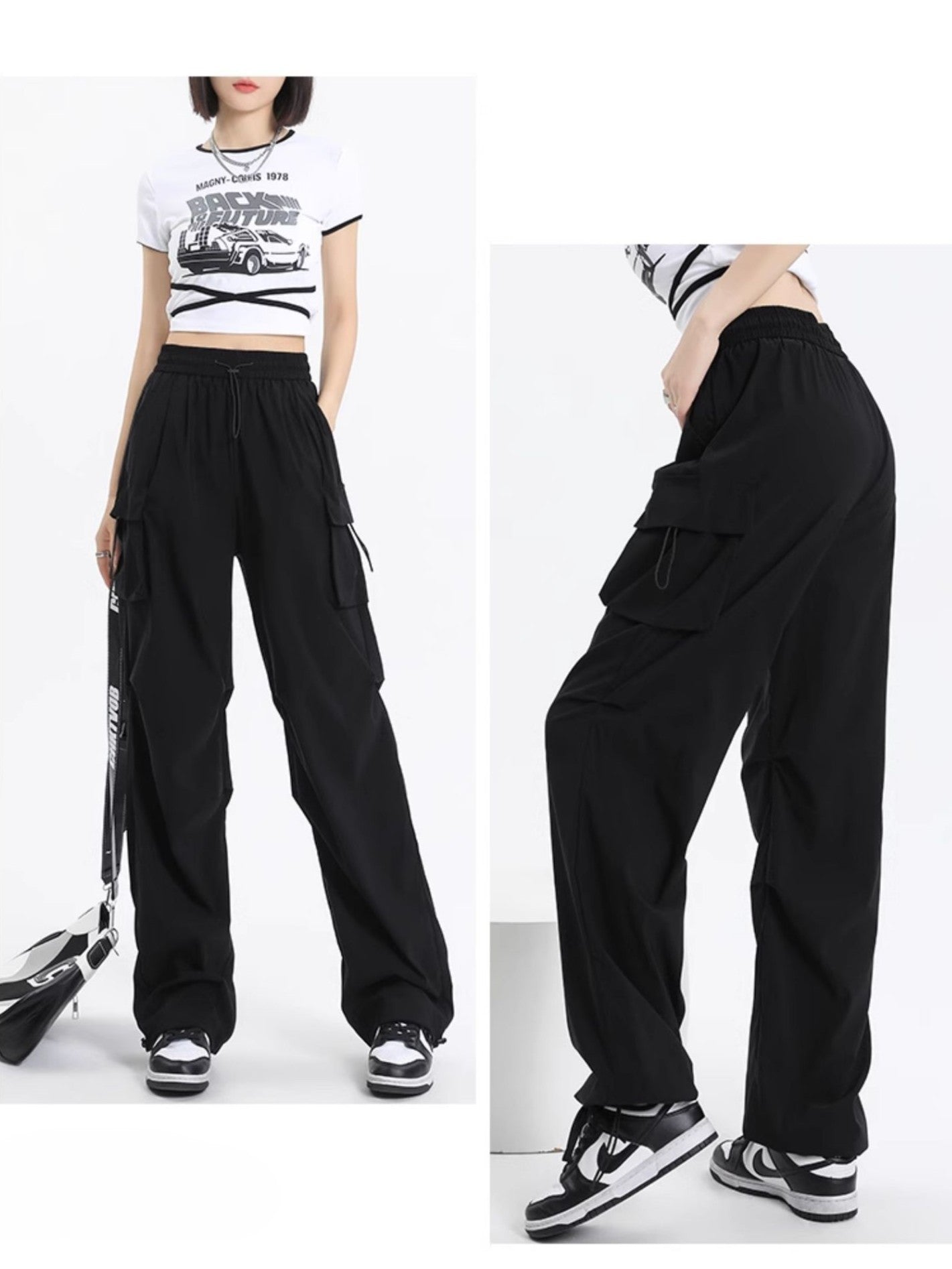 商品説明:ブラックカラーのハイウエストカーゴパンツ。夏に最適な軽やかな素材で、リラックスしたフィット感を提供します。小柄な方にもおすすめの丈感で、カジュアルな日常使いに最適です。
