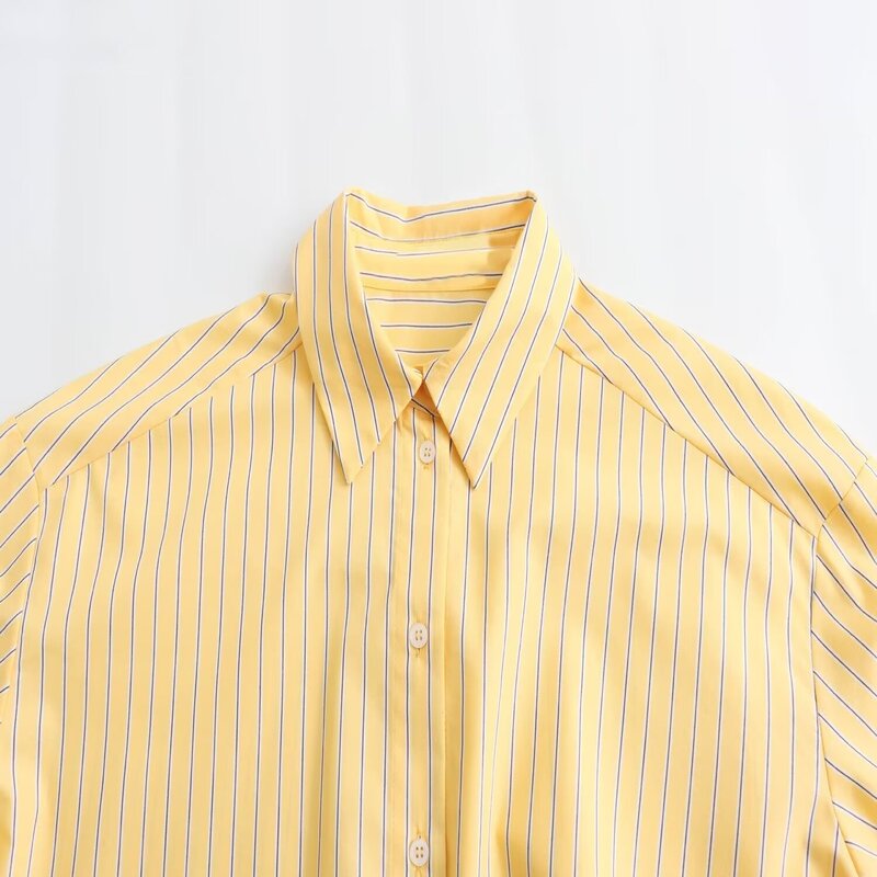 商品説明:このシャツは、2025年春の新作で、イエローとホワイトのストライプ柄が特徴です。軽やかなコットン素材を使用し、春夏の季節に最適です。カジュアルにもフォーマルにも使えるデザインで、デニムやスカートなど、さまざまなボトムスと合わせやすいアイテムです。