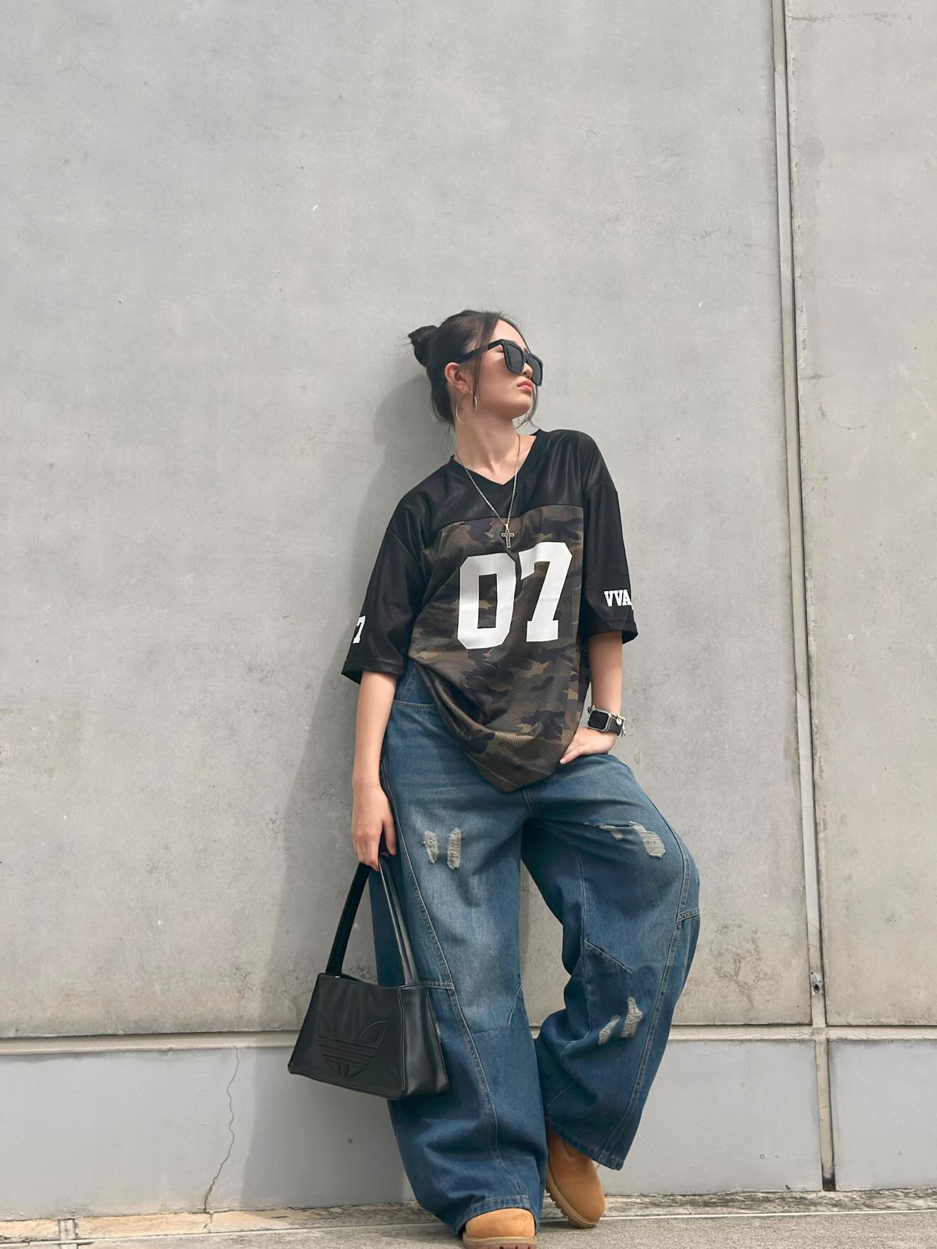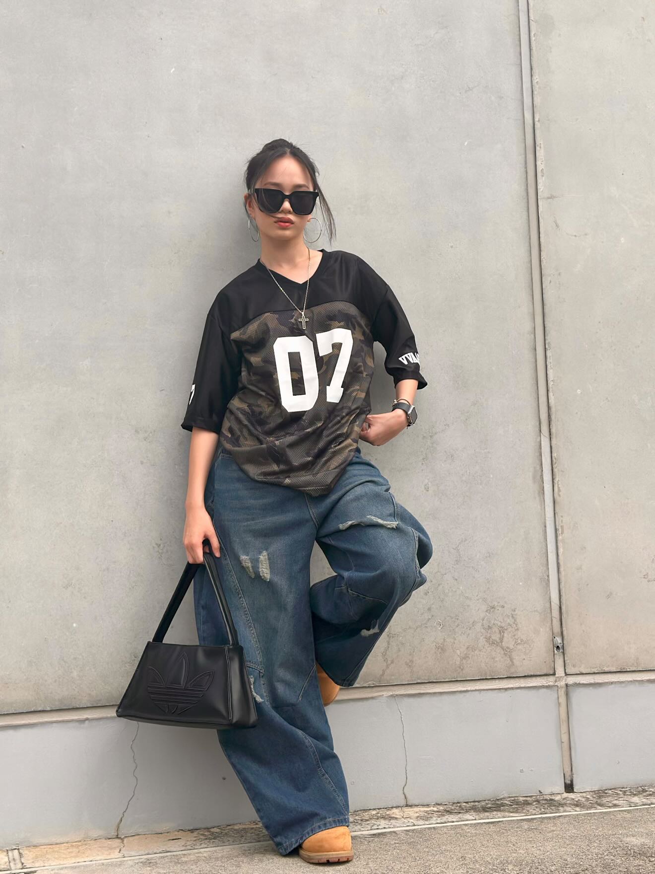 商品説明: 07番デザインが目を引くヴィンテージ風のカモフラ柄スポーツTシャツ。ゆったりとしたシルエットで、2025年夏のアメリカンカジュアルスタイルにぴったりの一枚です。
