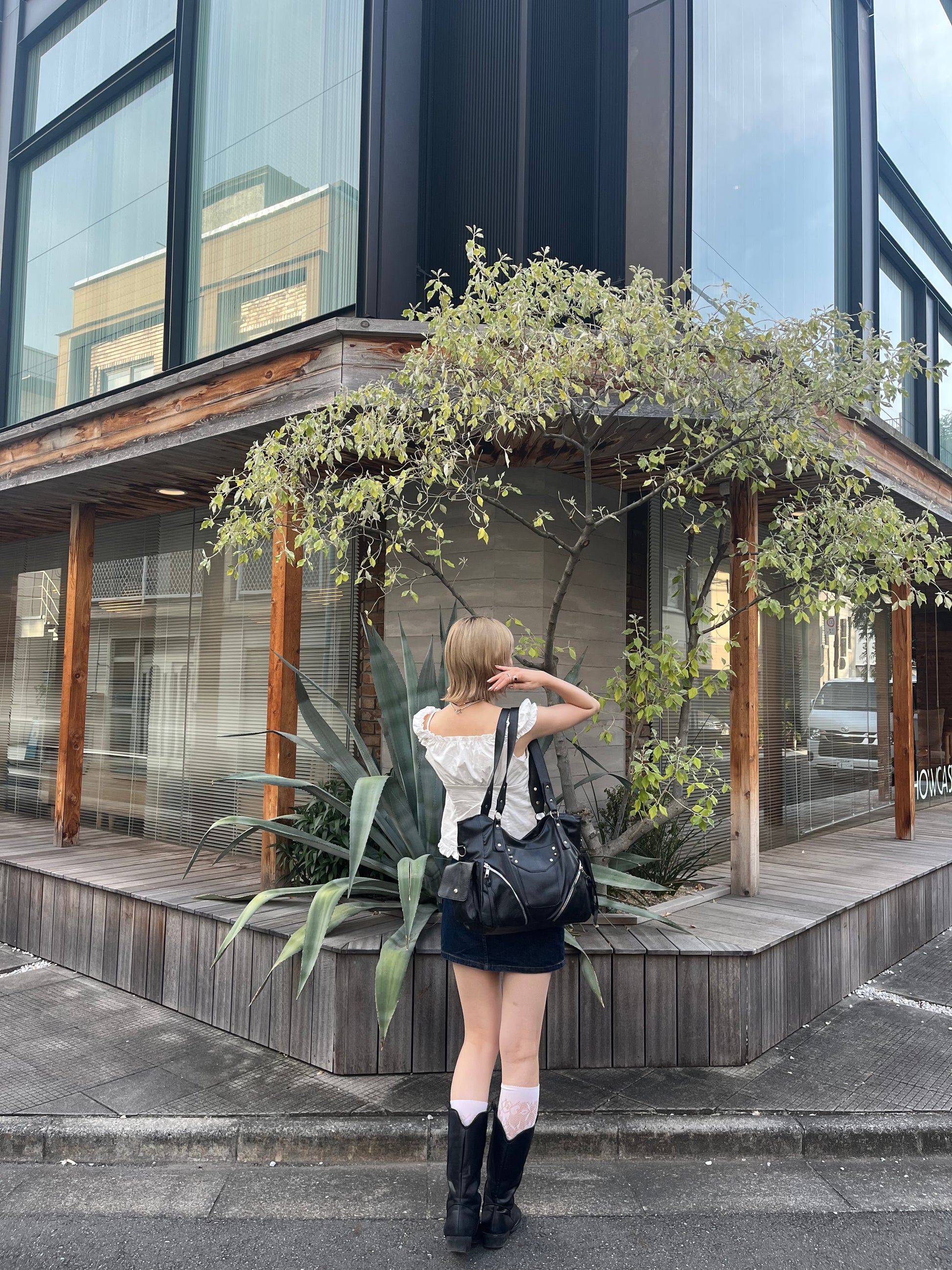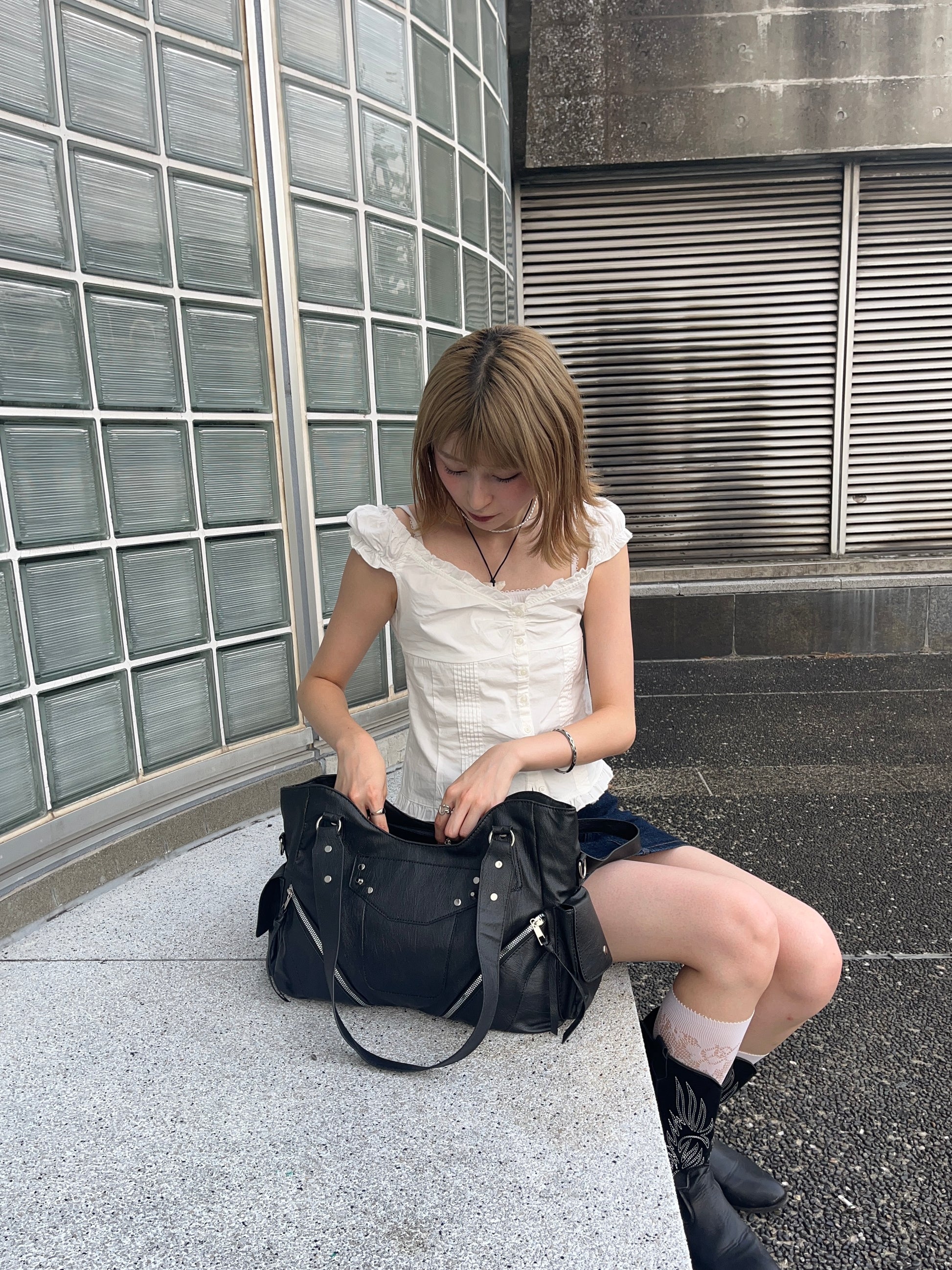 商品説明:甘辛ミックスなバイカーデザインで、通勤にも使える高見えトートバッグ。肩掛け可能で実用性も抜群。