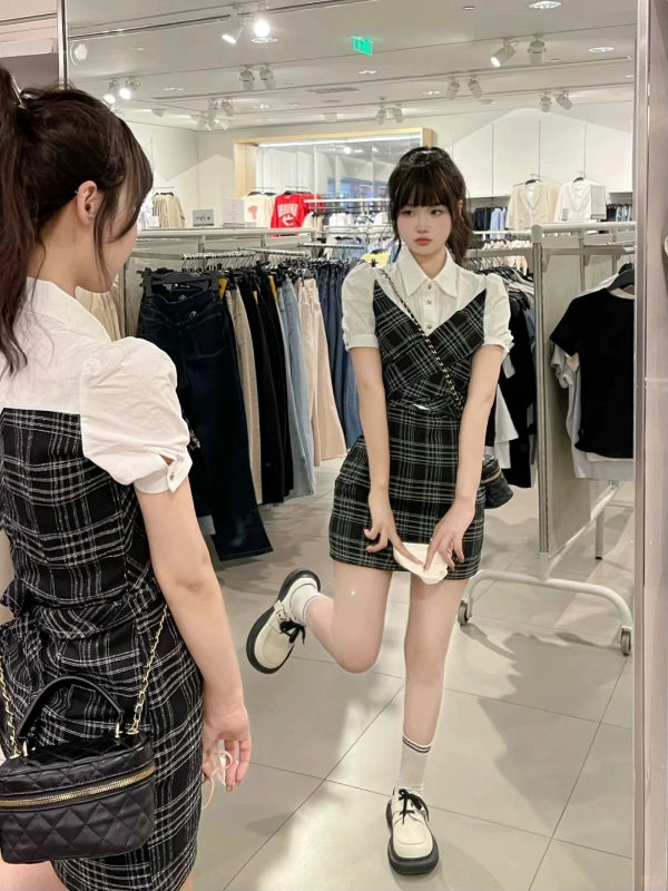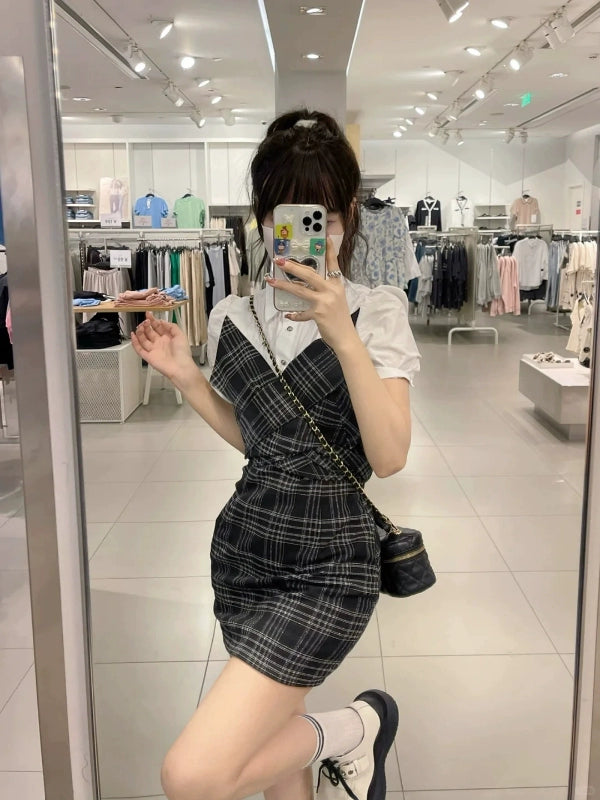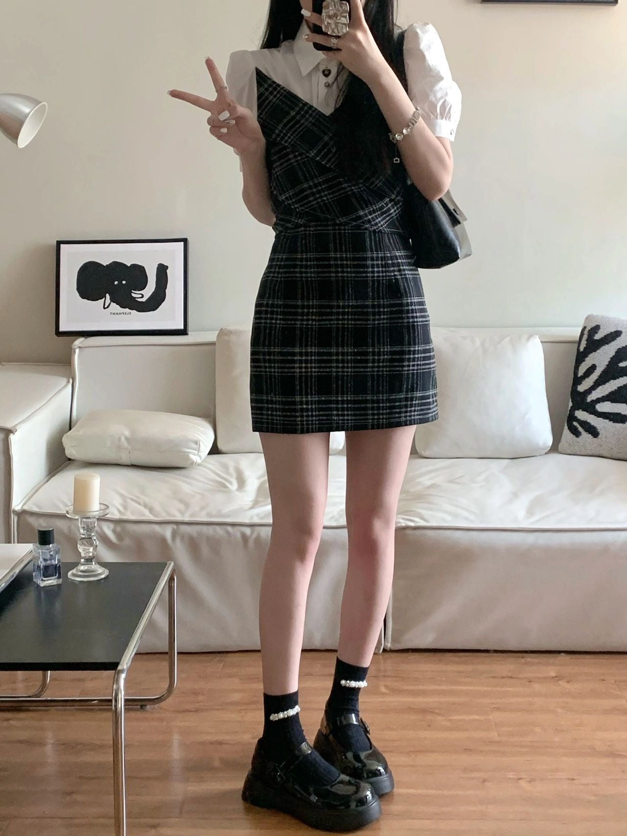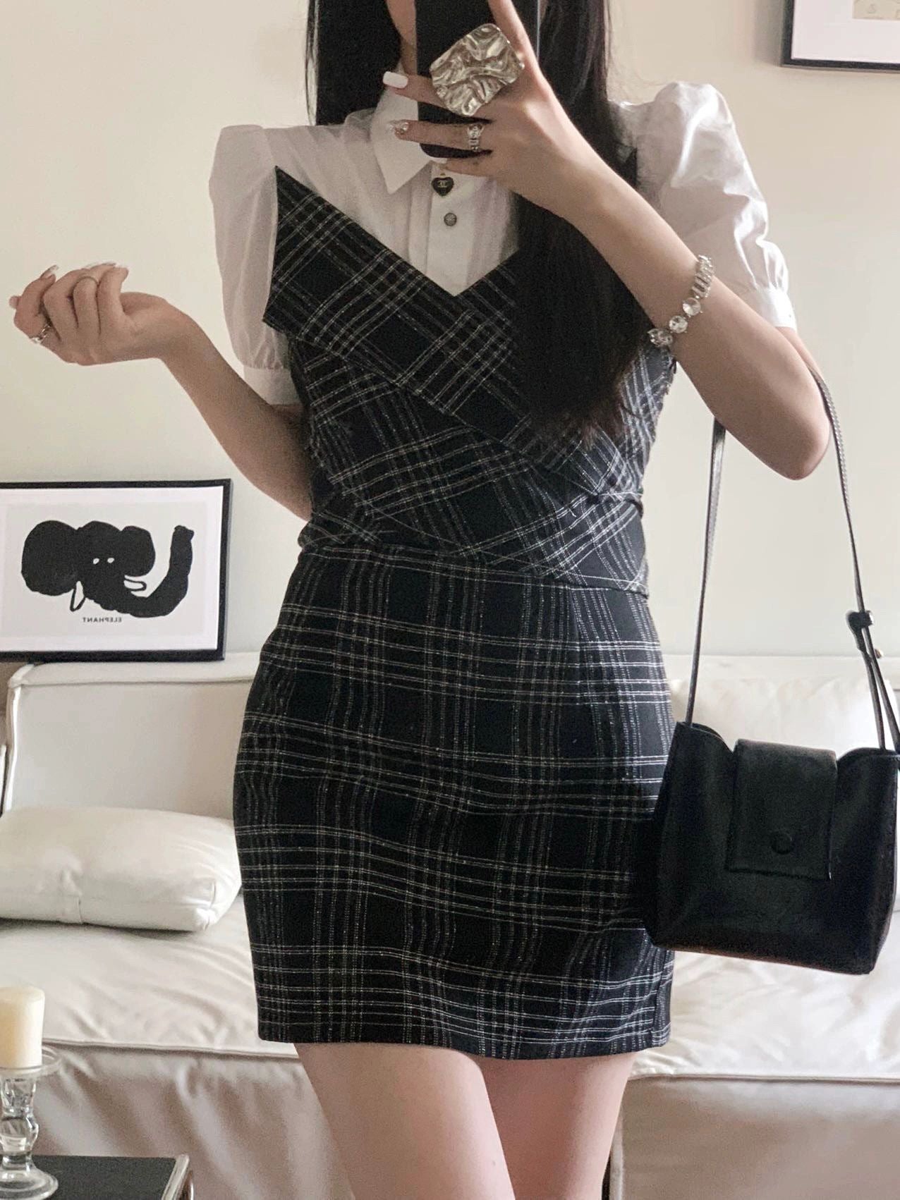 商品説明:甘辛ミックスのフェイクレイヤードワンピース。シャツ風のチェック柄とパフスリーブがポイント。ウエストシェイプでスタイルアップ効果も◎。ガーリーな夏の装いにぴったりです。