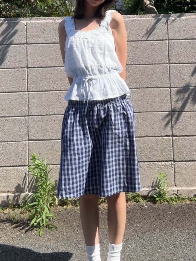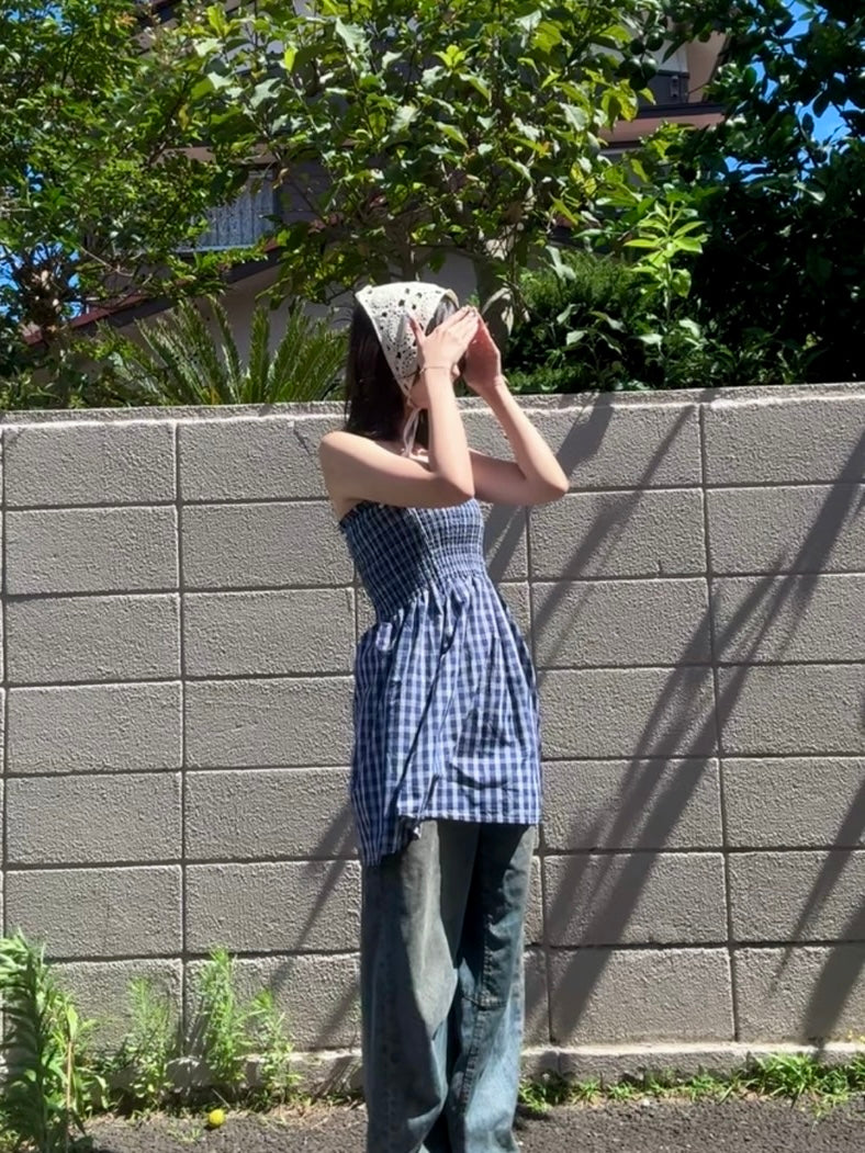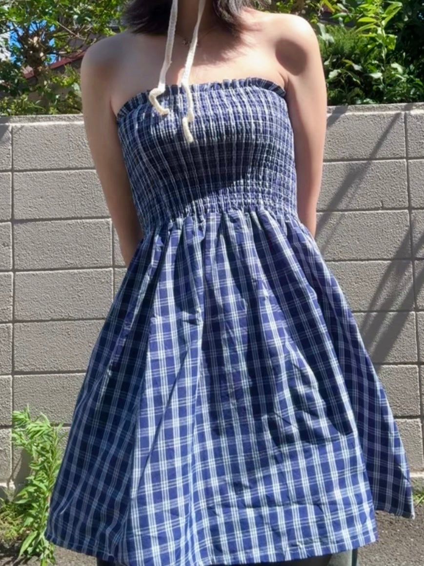 商品説明:チューブトップとスカートの2WAY仕様。清涼感あるブルーチェックが夏にぴったり。ウエストはシェイプされ、Aラインでスタイル良く見せる甘辛デザイン。コーデ自在の洒落アイテムです。