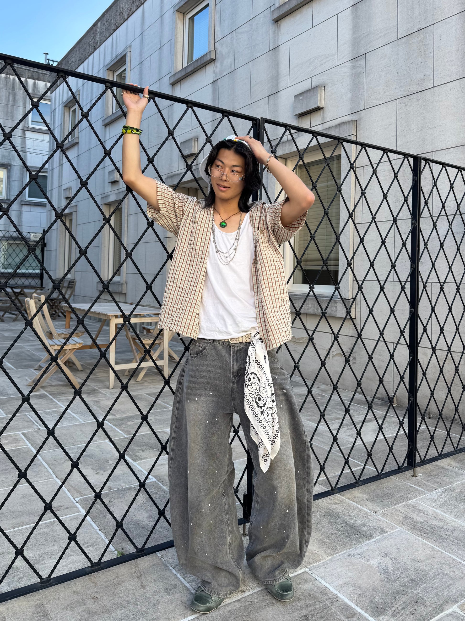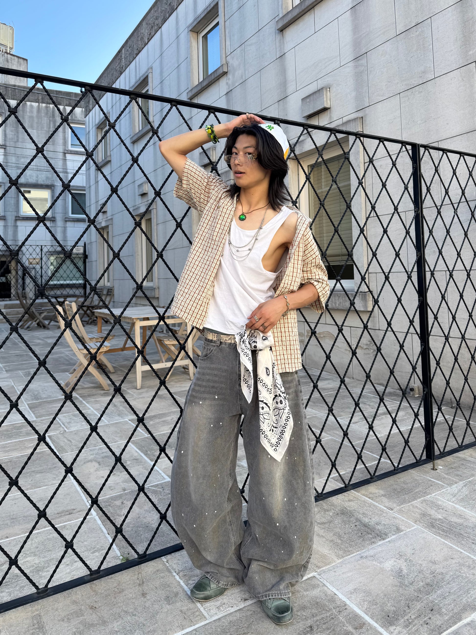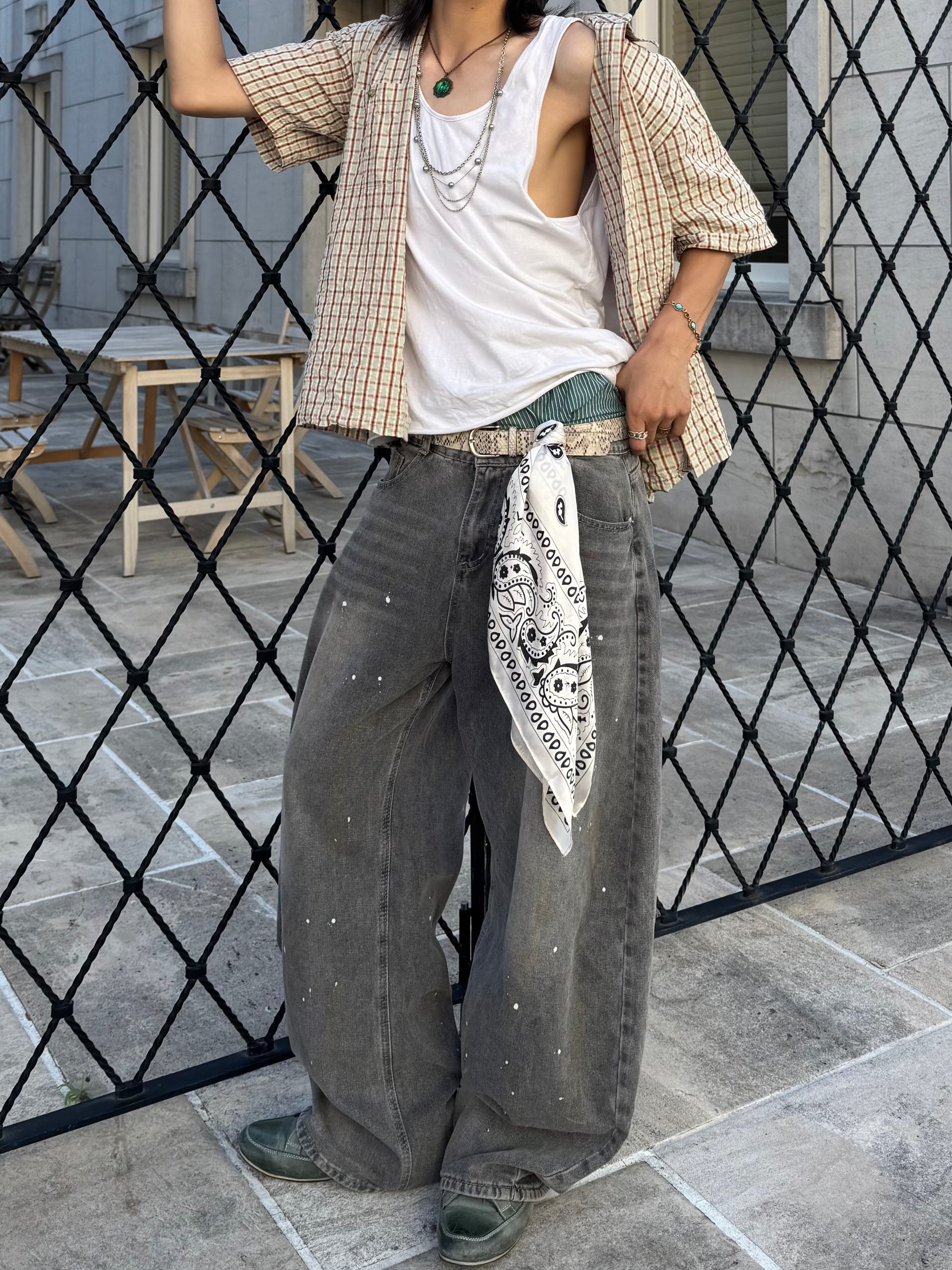 商品説明:ユニークなデザインと洗練された仕上がりが特徴です。水洗い加工を施したデニム生地に、アーティスティックなペイントデザインが施されています。特徴的な弯刀シルエットとワイドな裾が、ストリートスタイルを引き立て、個性的でスタイリッシュな印象を与えます。