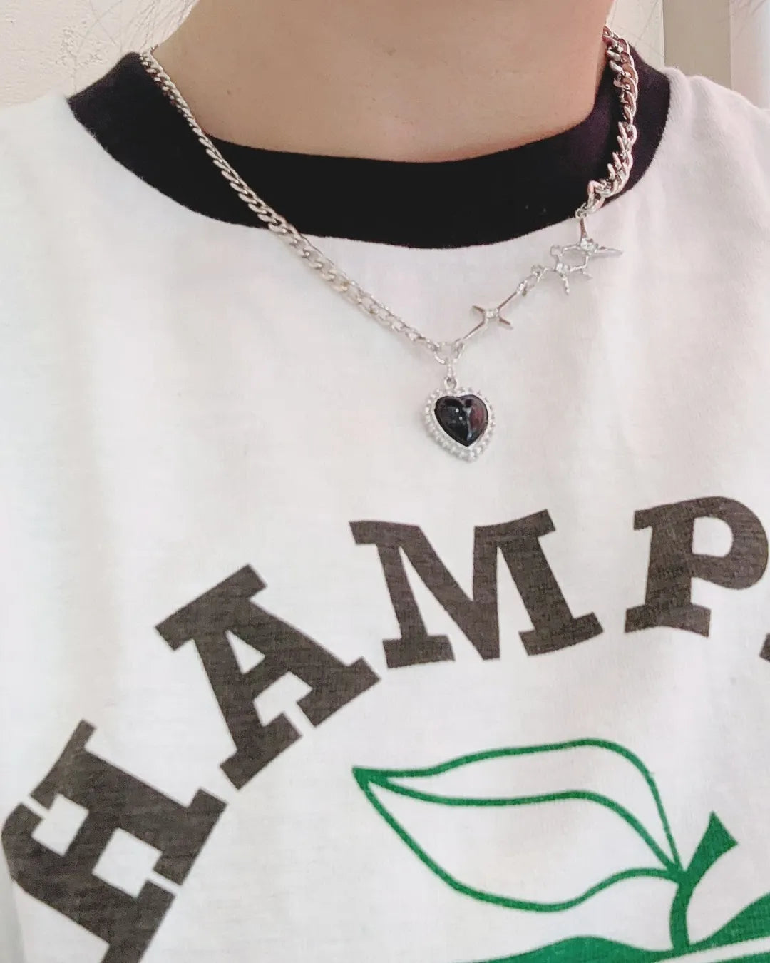 商品説明:インスタグラム風の小物デザインが特徴的な芒星とハートをモチーフにしたネックレス。トレンド感のあるアイテムで、カジュアルからエレガントまで幅広いコーディネートにぴったりなアクセサリーです。